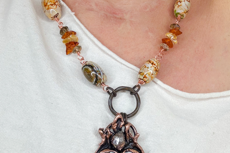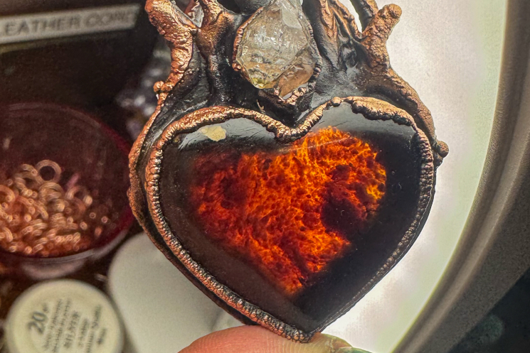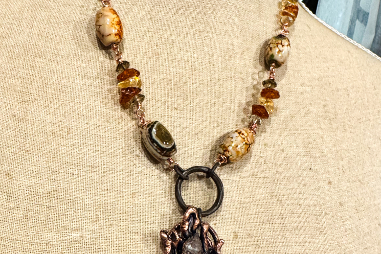 Amber carved heart copper electroformed with a herkimer diamond flame point, finished on a hand wired gems consisting of Amber, oriental agate, citrine and Smokey quartz. So cozy and timeless!! 19.5" long