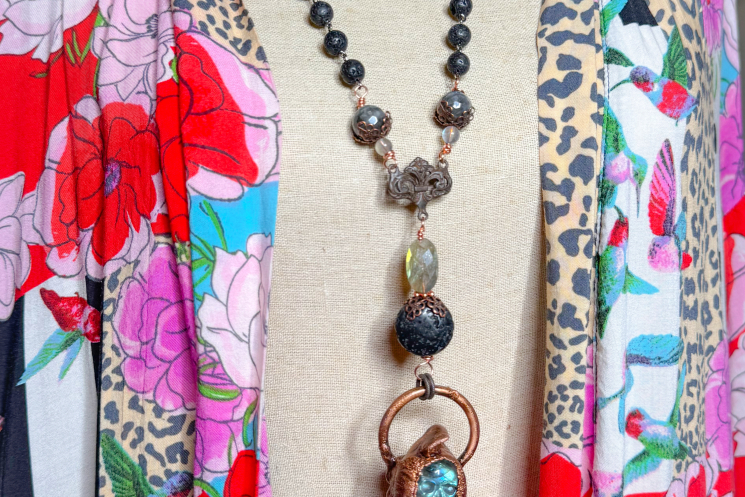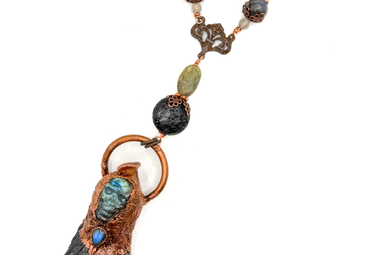 Black Kyanite Copper electroformed Skully on a rosary style lava bead chain necklace 36" long