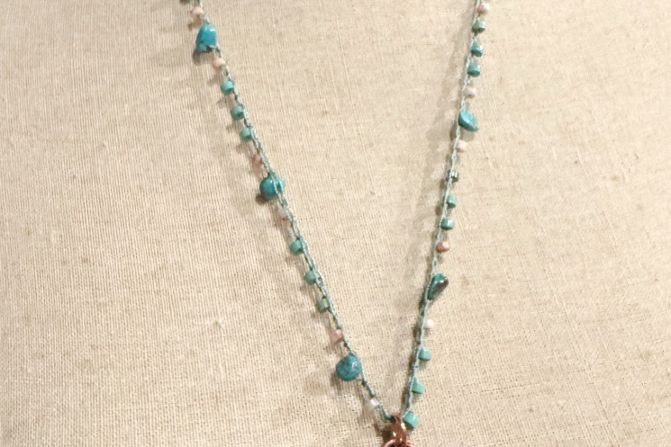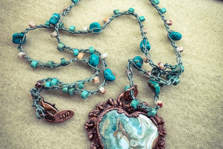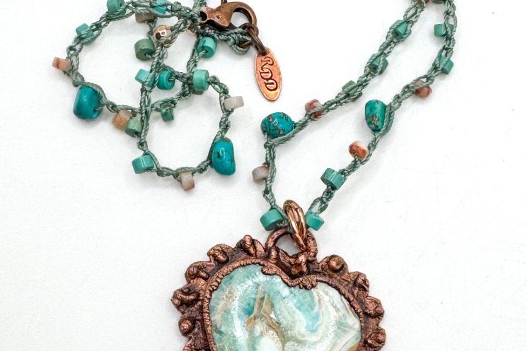 Blue Calcite carved heart copper electroformed and finihsed on a 22" long crochet that can be worn shorter at multiple lengths. Crochet consists of Turqouise, and sunstone heishi.