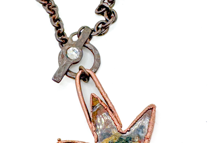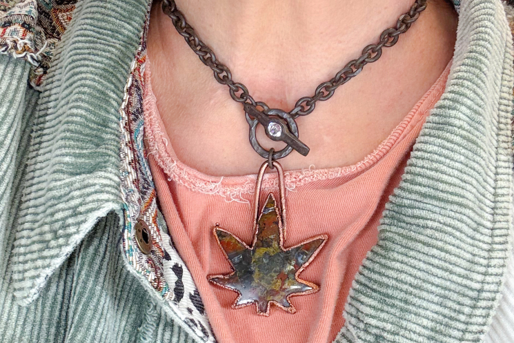 Breaciated Jasper carved Happy Leaf copper electroformed and finished on a heavy duty rustic finished and sealed chain with toggle 18" long.
