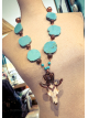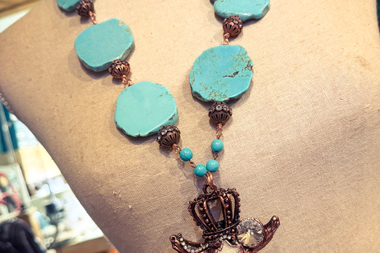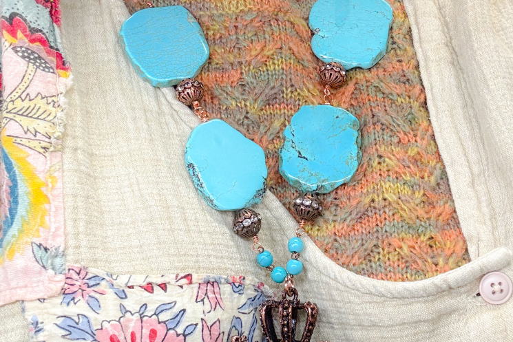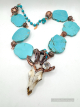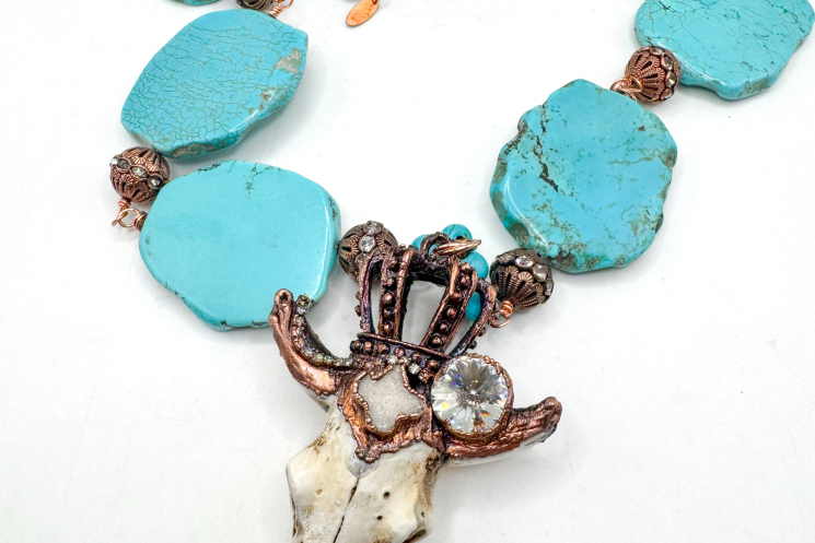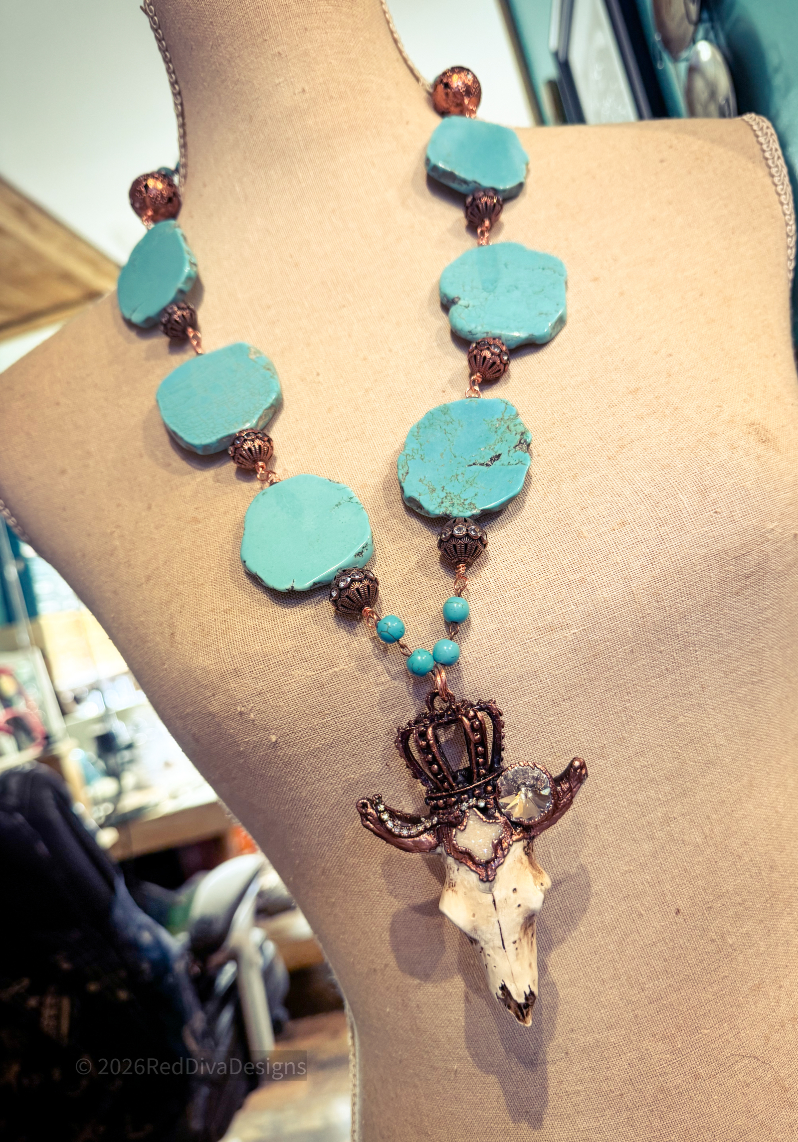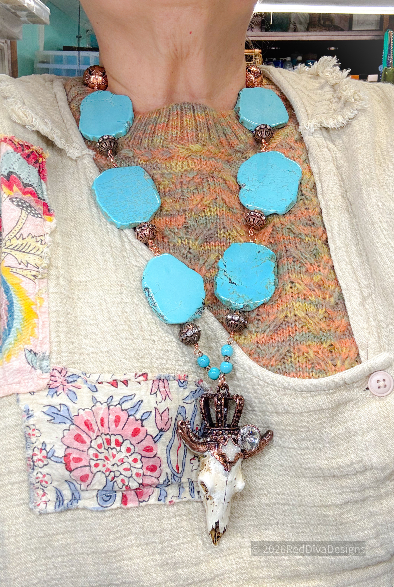 Mini cow skull King copper electroformed with bling! Finished on a 26" long necklace of Howlite turqouise and copper accents.