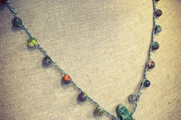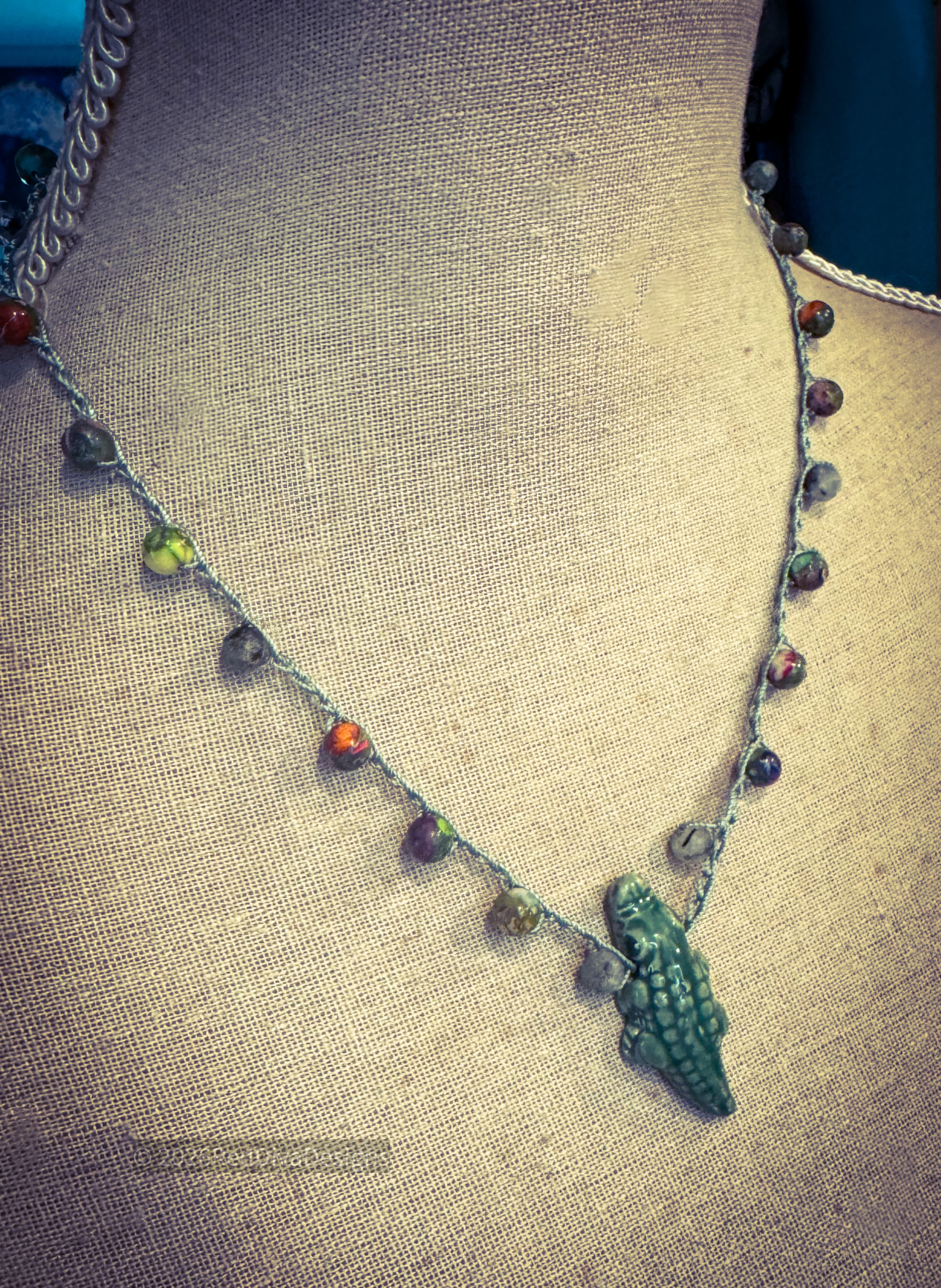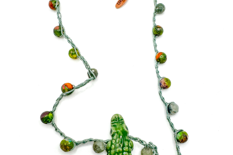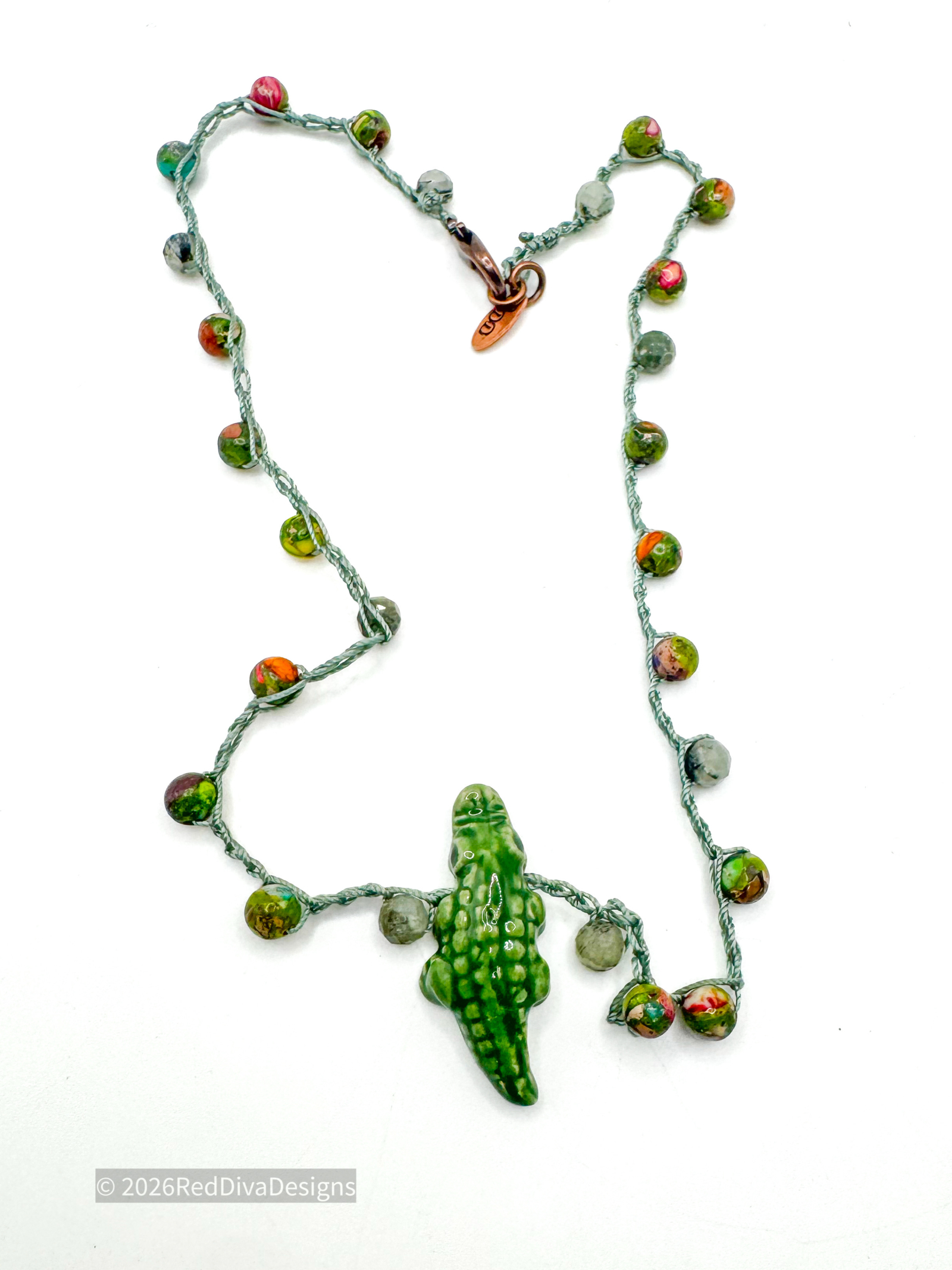 Ceramic alligator finished on crochet of Perhinite and Imperial Jasper 20" long and can be worn shorter, just clip onto the cord.