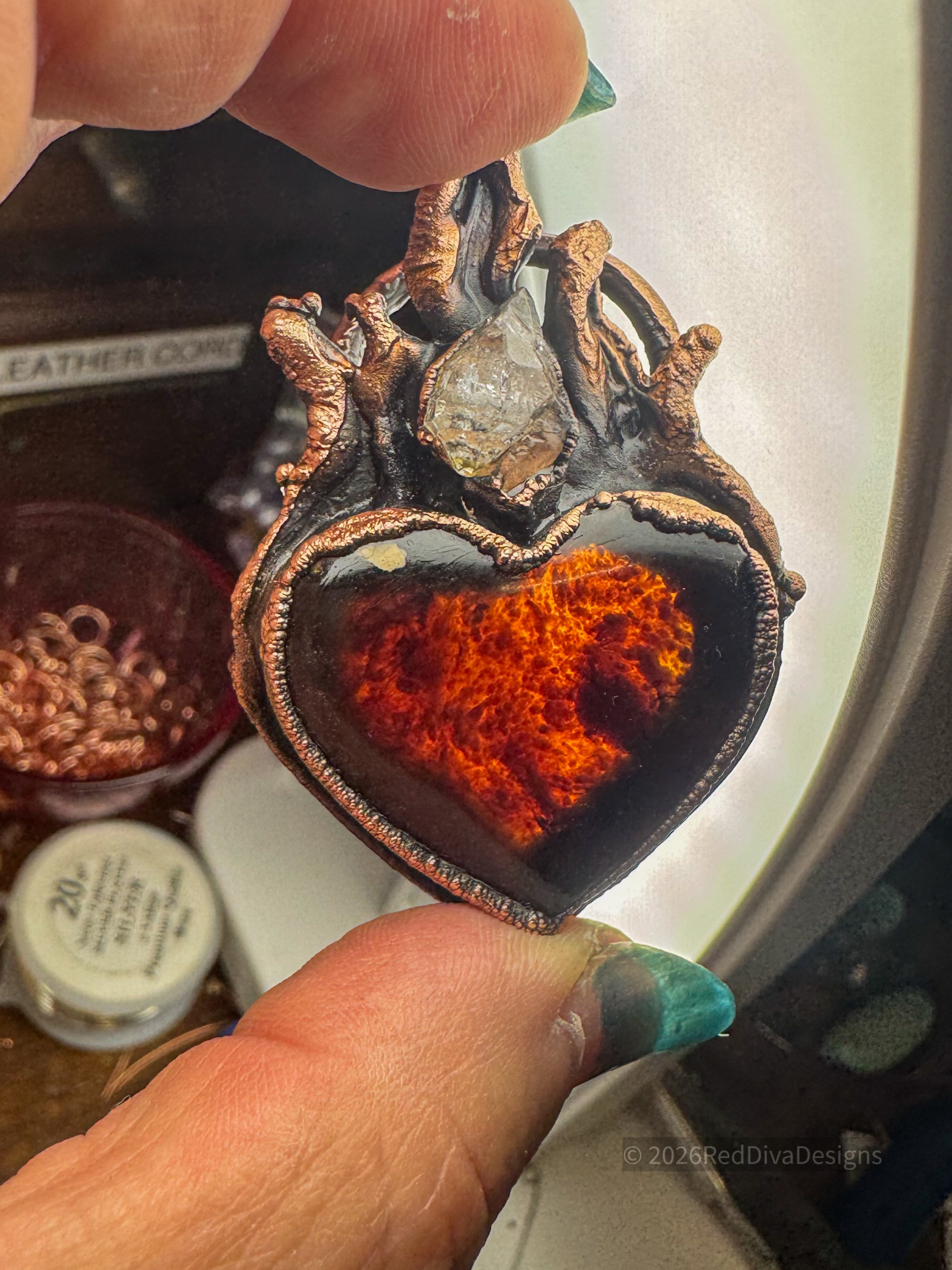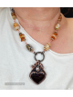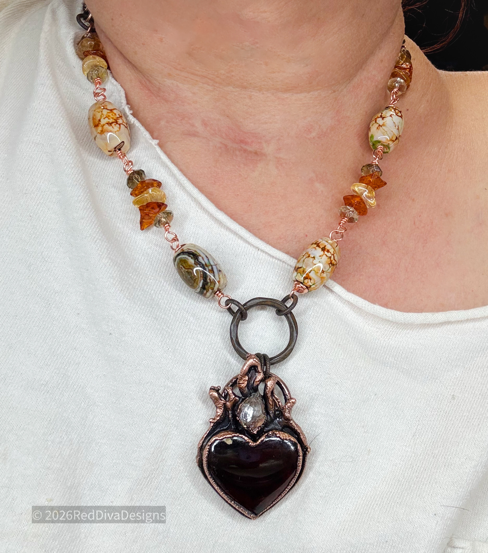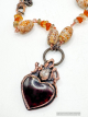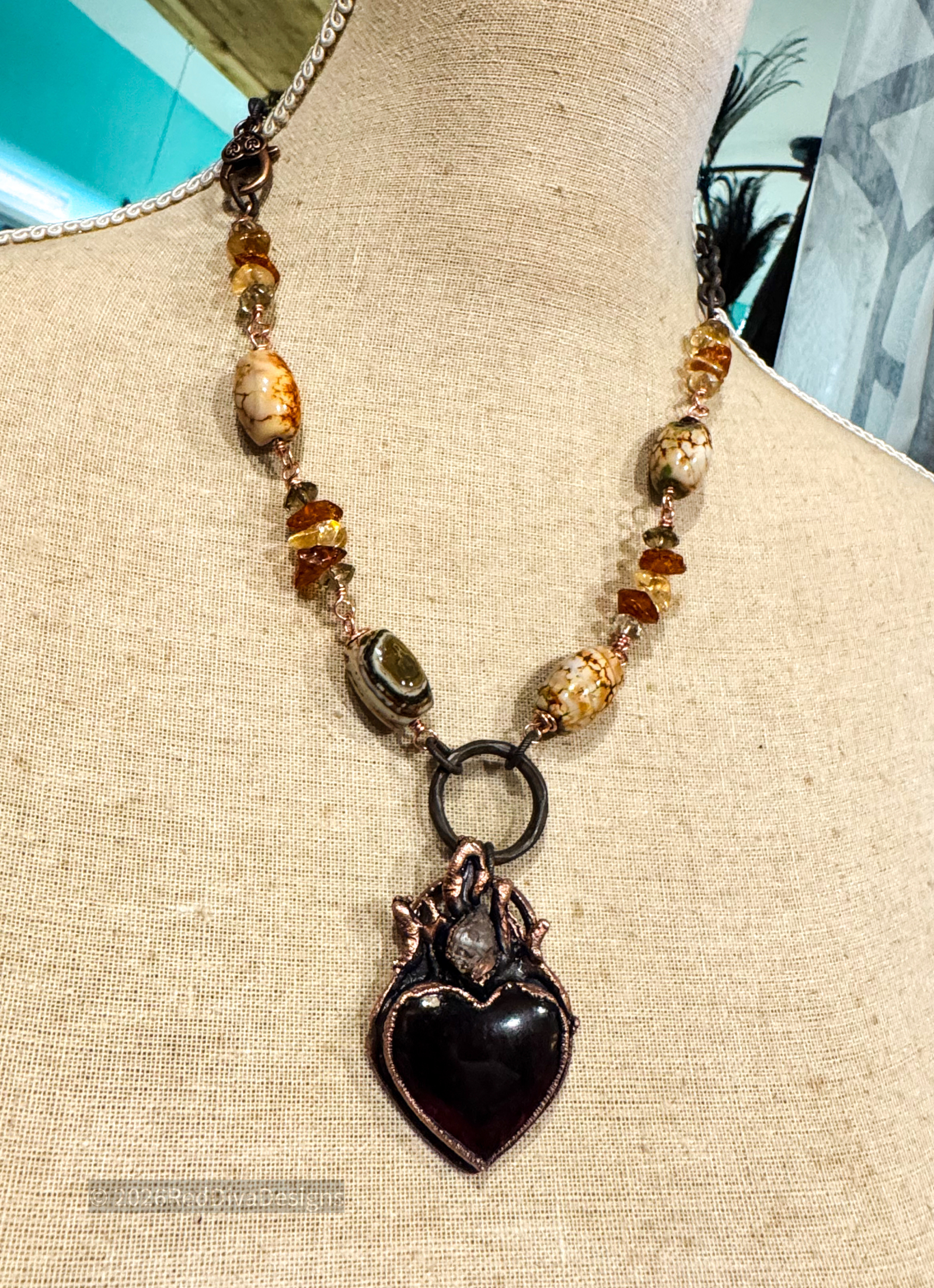 Amber carved heart copper electroformed with a herkimer diamond flame point, finished on a hand wired gems consisting of Amber, oriental agate, citrine and Smokey quartz. So cozy and timeless!! 19.5" long