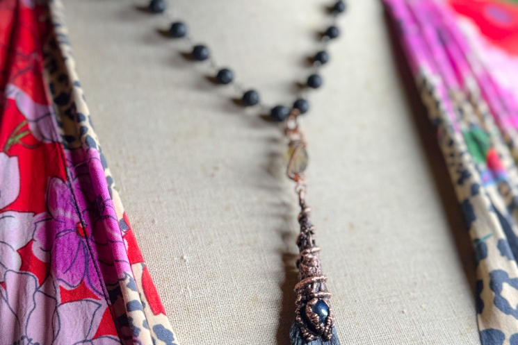 Raw Black Kyaniite copper electroformed and finished on a black lava bead necklace 18.5" long. Love the Mystic in this one!