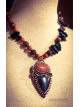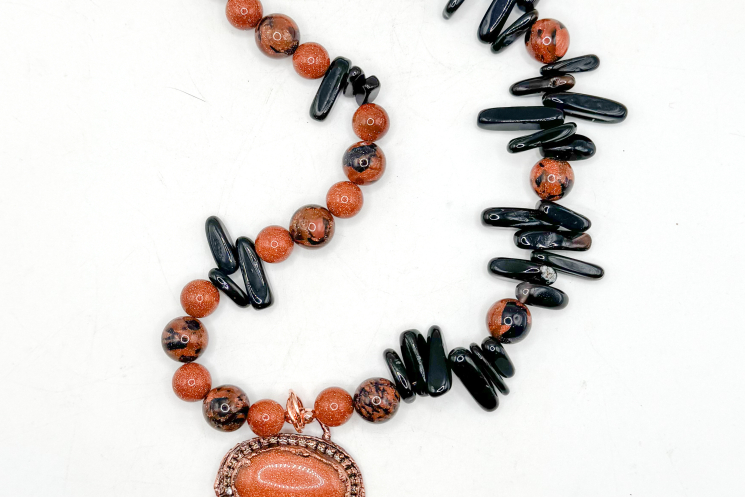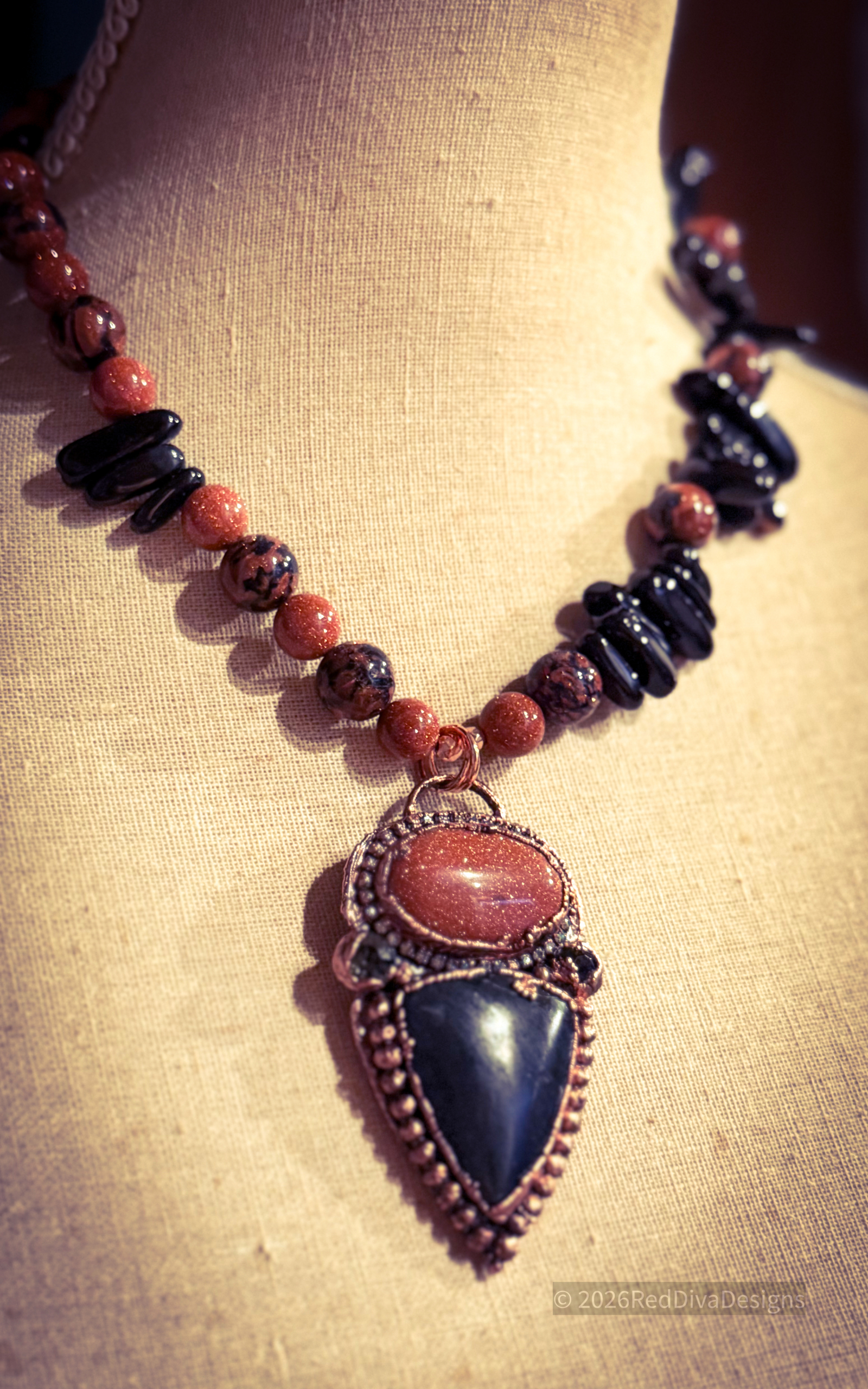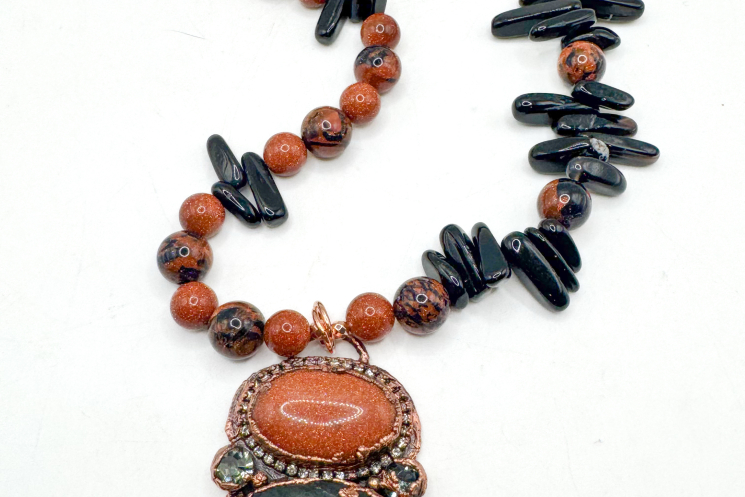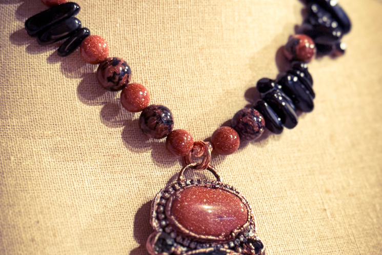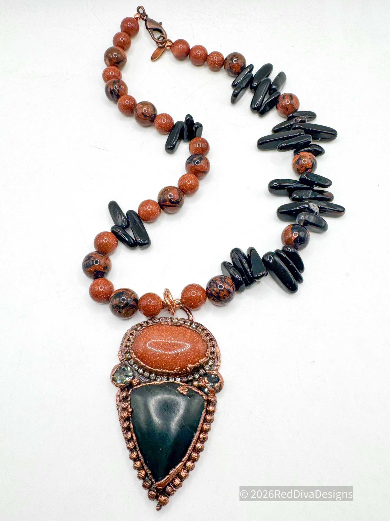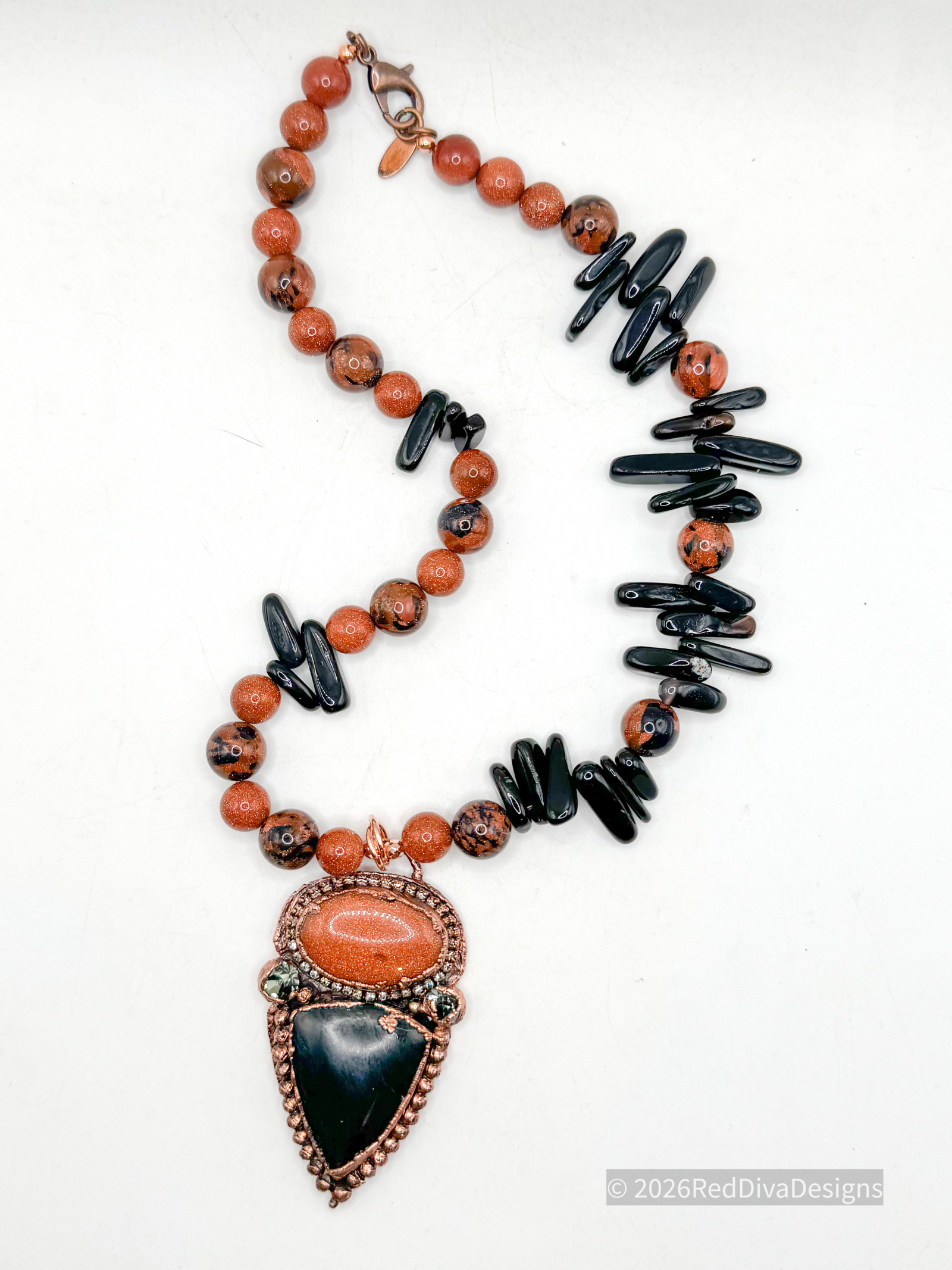Black Jade and Goldstone copper electroformed and finished on a strand of asymmetrical goodness of black onyx and goldstone 18.5" long
