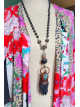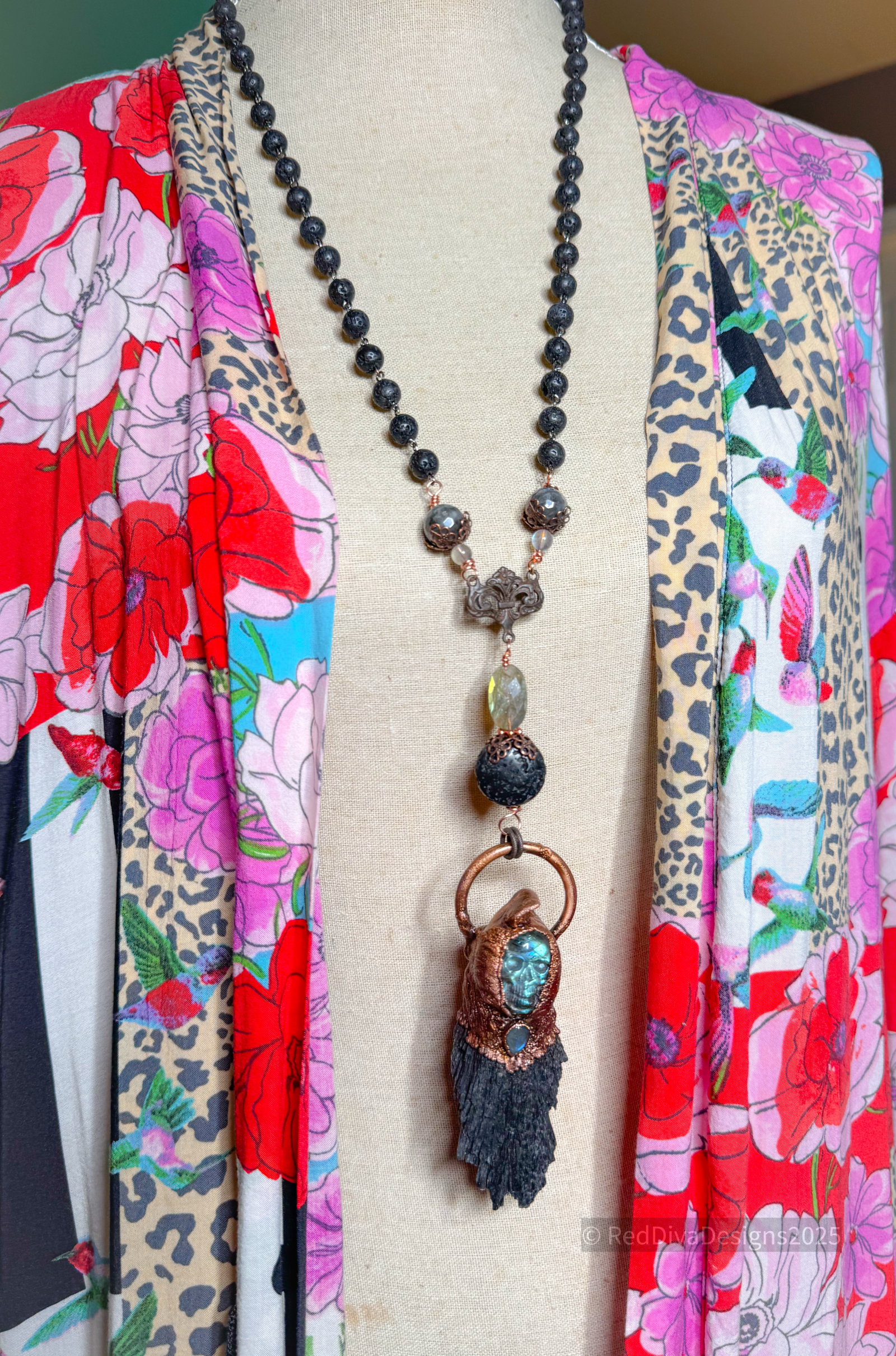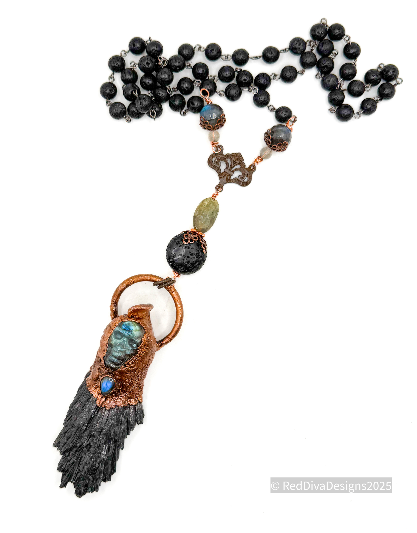 Black Kyanite Copper electroformed Skully on a rosary style lava bead chain necklace 36" long