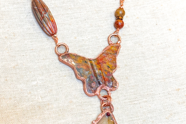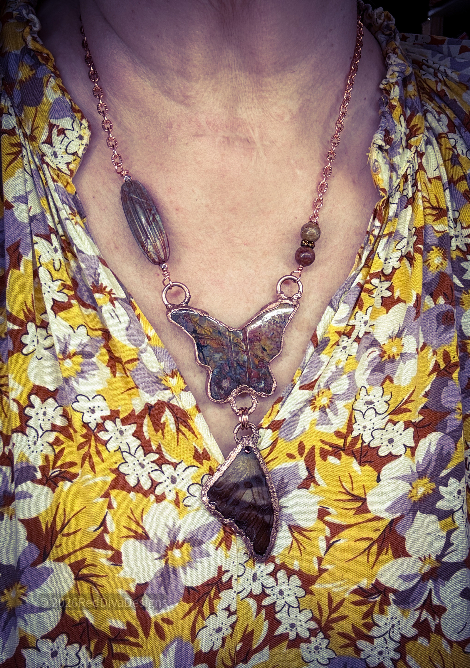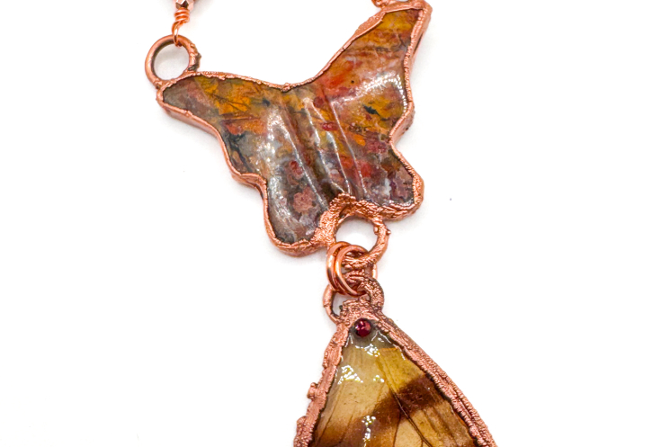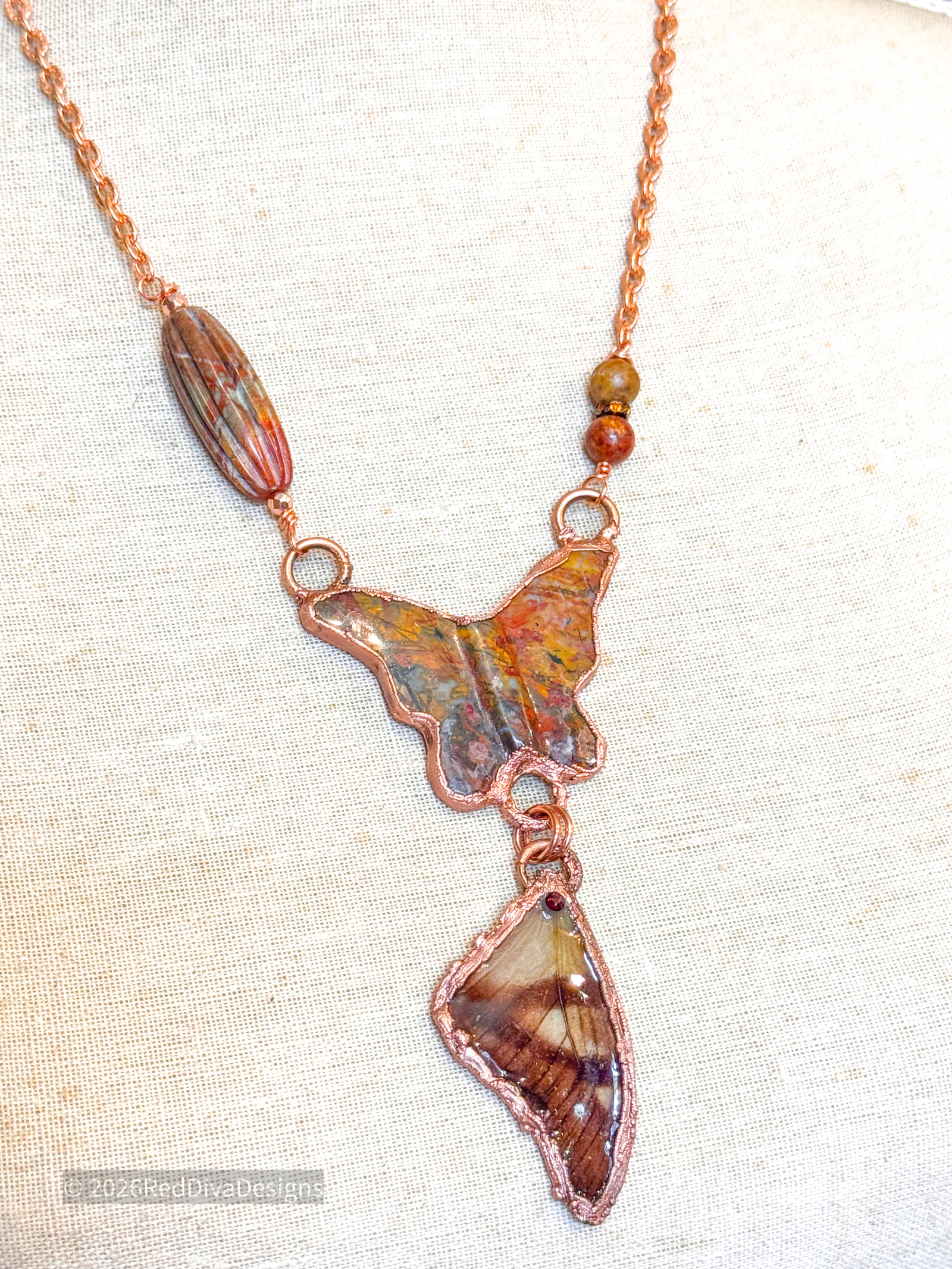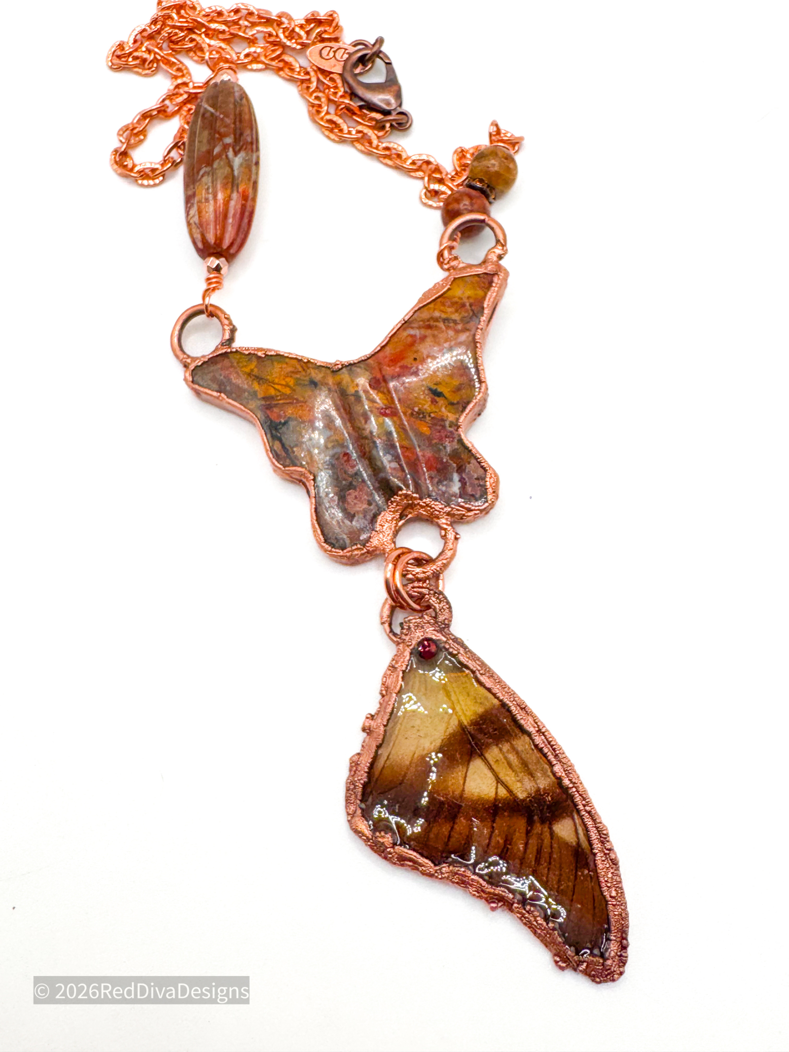 Brecciated Jasper carved butterfly, handcarved and finihsed on red creek jasper accented solid copper chain 19" long with a real organic butterfly wing dangle which has been resin sealed and electroformed also.