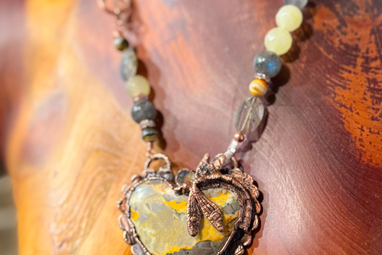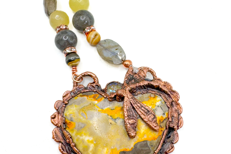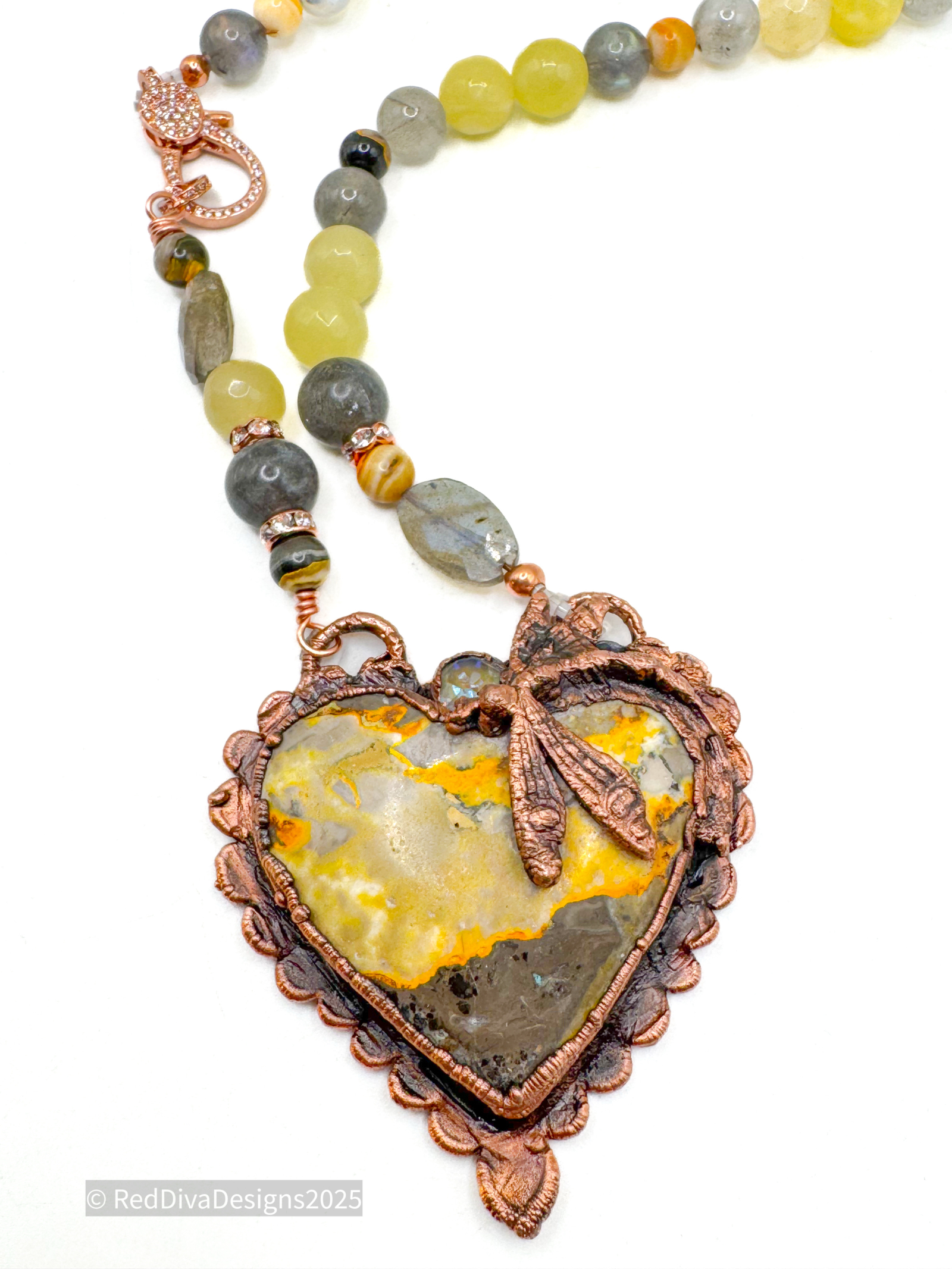 Bumblebee Jasper Handcarved Heart copper electroformed and finished on an 19" necklace consisting of Grade AAA Bumblebee Jasper, Labradorite and yellow Jade. With a Pave' closure.... stand out from that crowd!