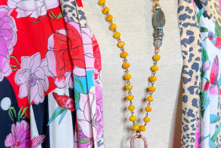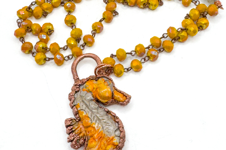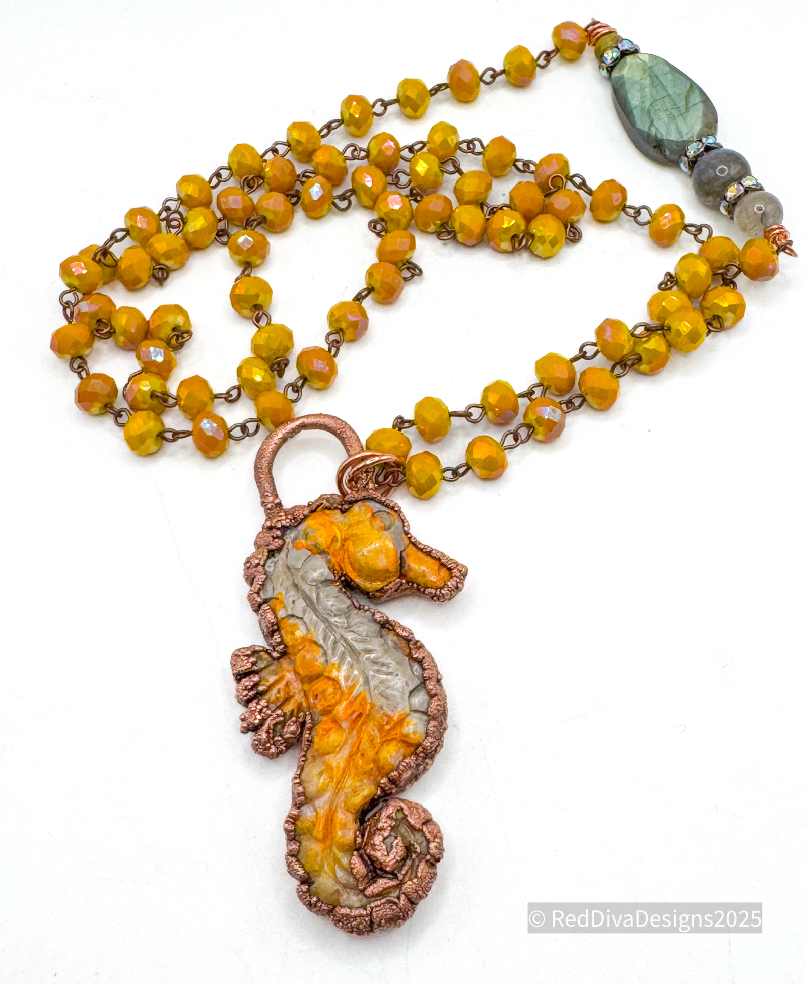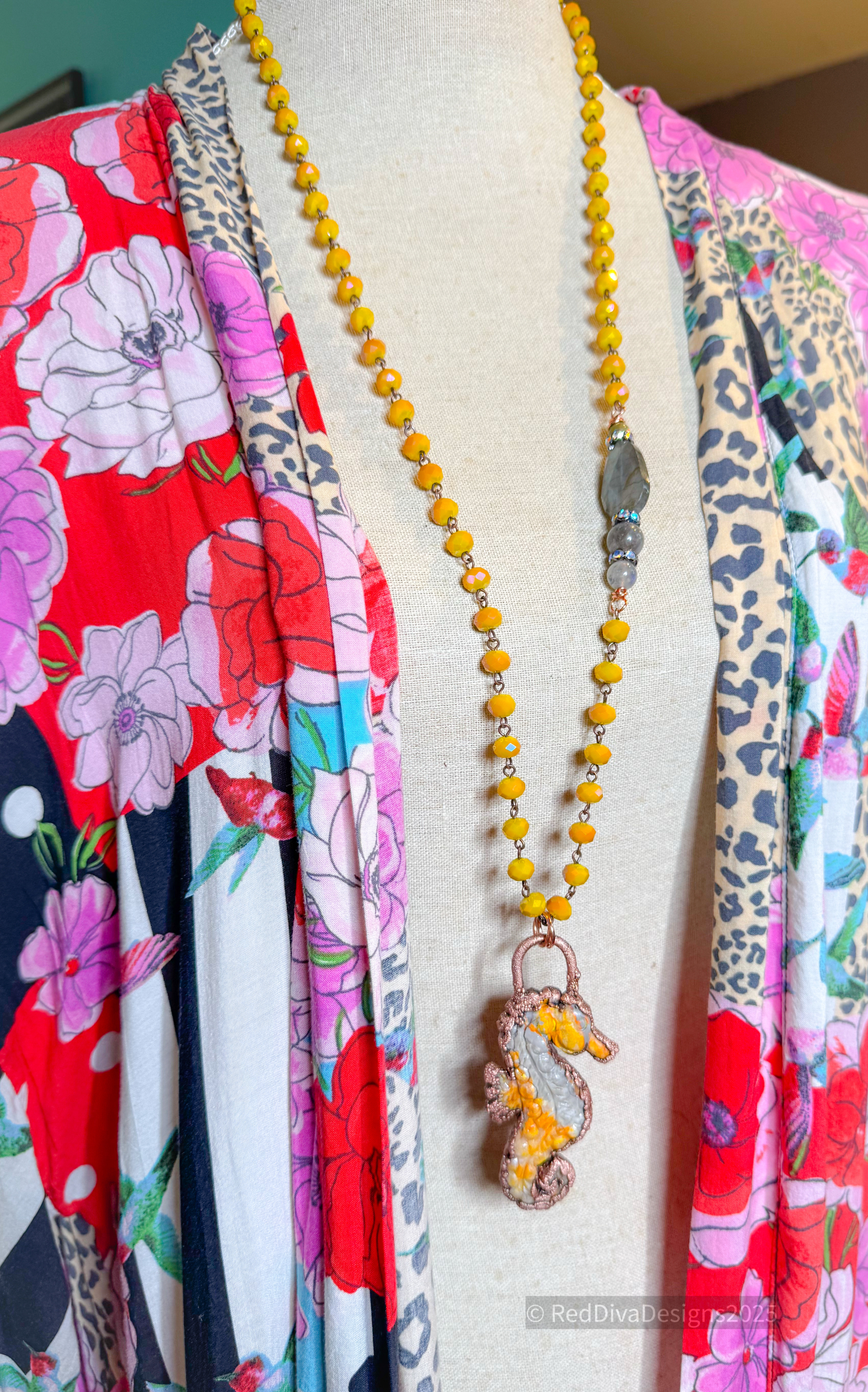 handcarved bumblebee seahorse copper electroformed and finished on Yellow crystal bead chain with a side piece of labradorite. 36" long and can be worn doubled or single/long.