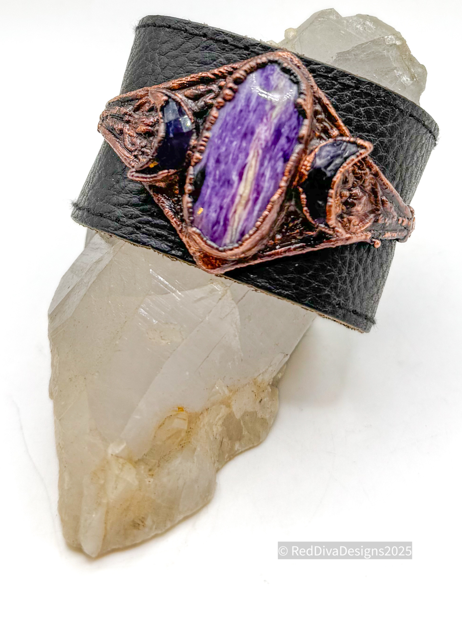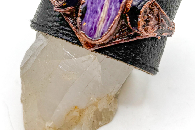 Charoite Stone on Black leather which fits 7" wrists to 8" Copper electroformed Plume Agate with Swarovski Chrystals and sealed.
