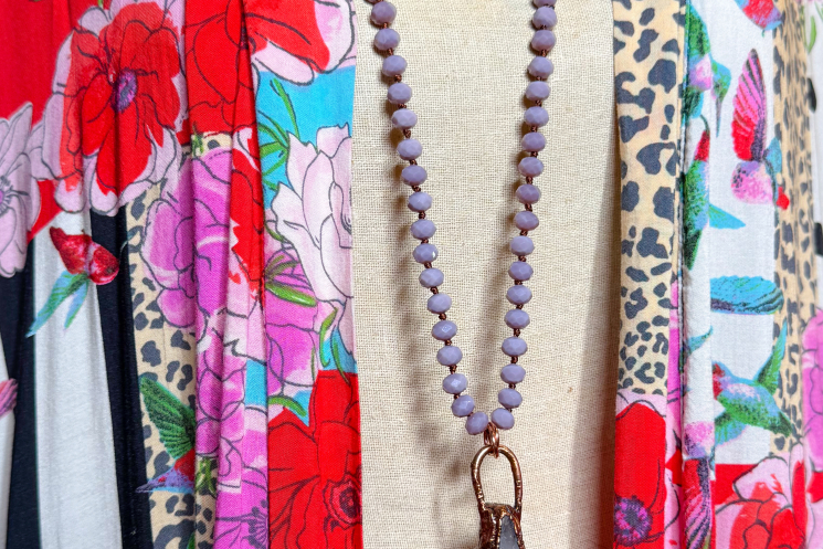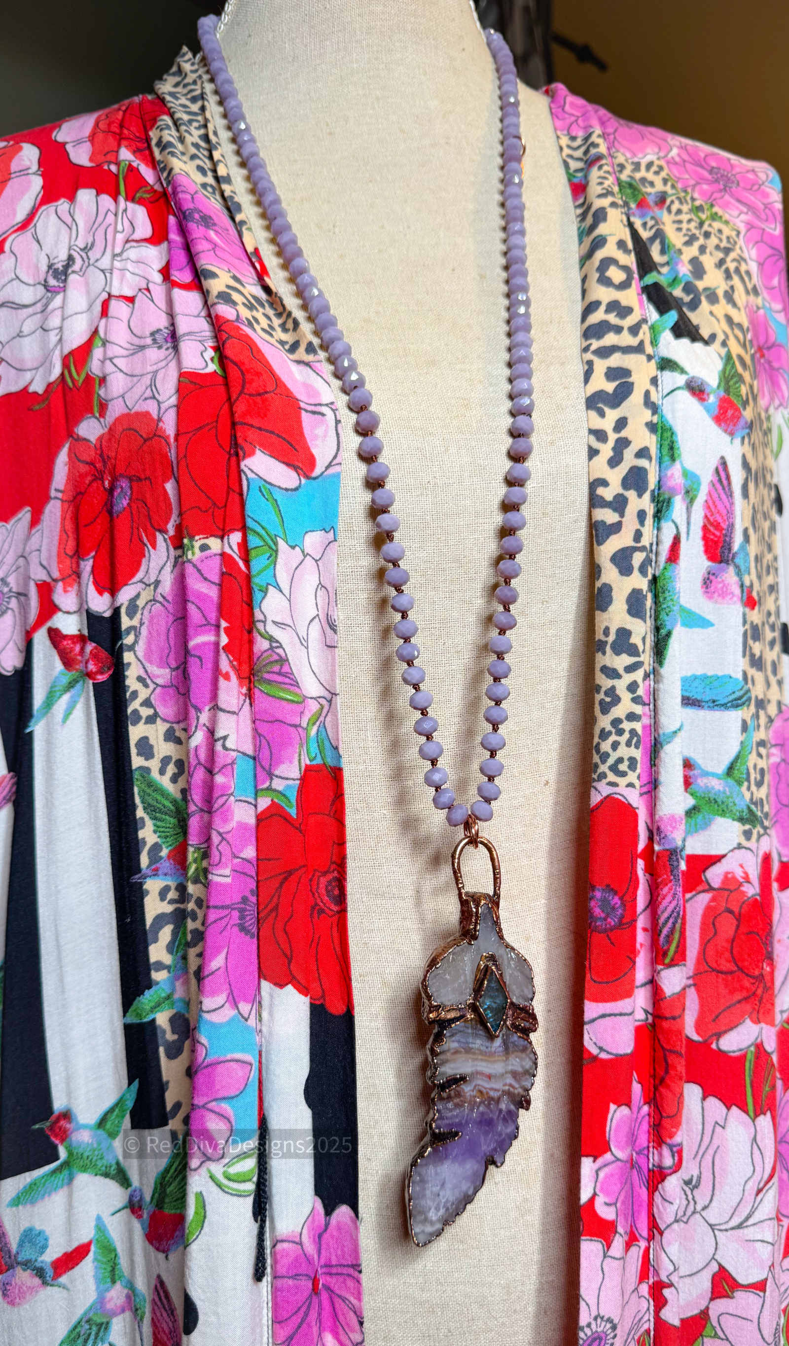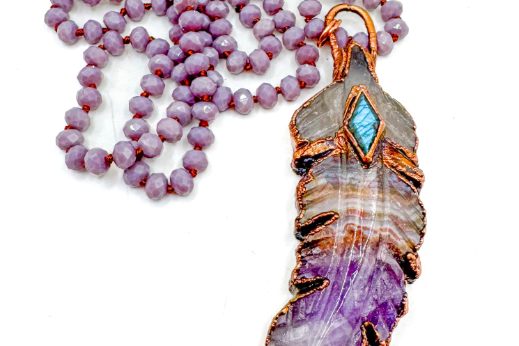 A hand carved beautiful chevron amethyst feather copper electroformed with a flashy Labradorite on top and finished on a 36" crystal necklace Can be worn doubled with included extender or long.