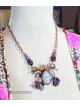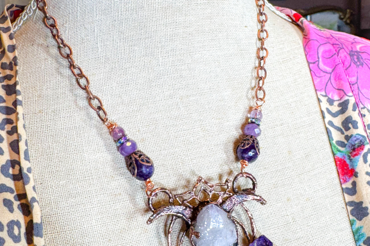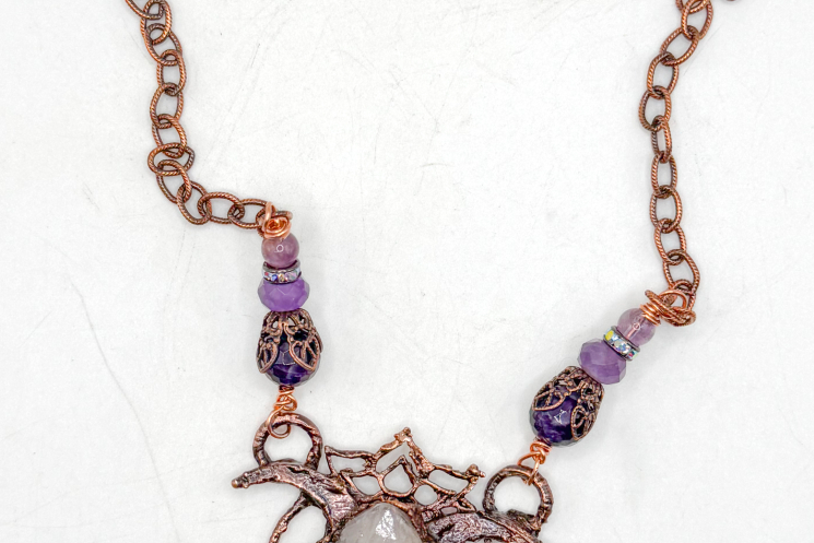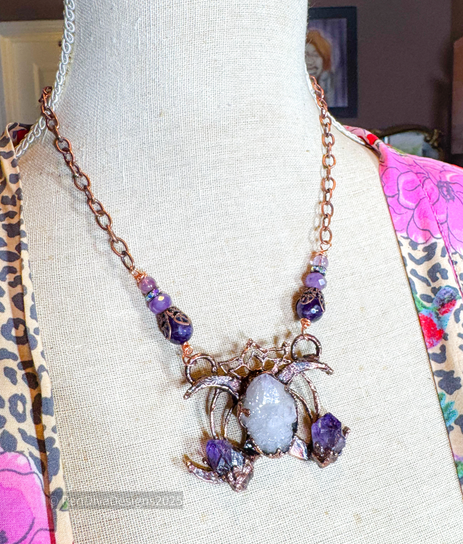 This double crescent piece is copper electroformed and features spirit quartz and amethyst to smooth the soul! Finished on a nice solid copper chain 19" long.