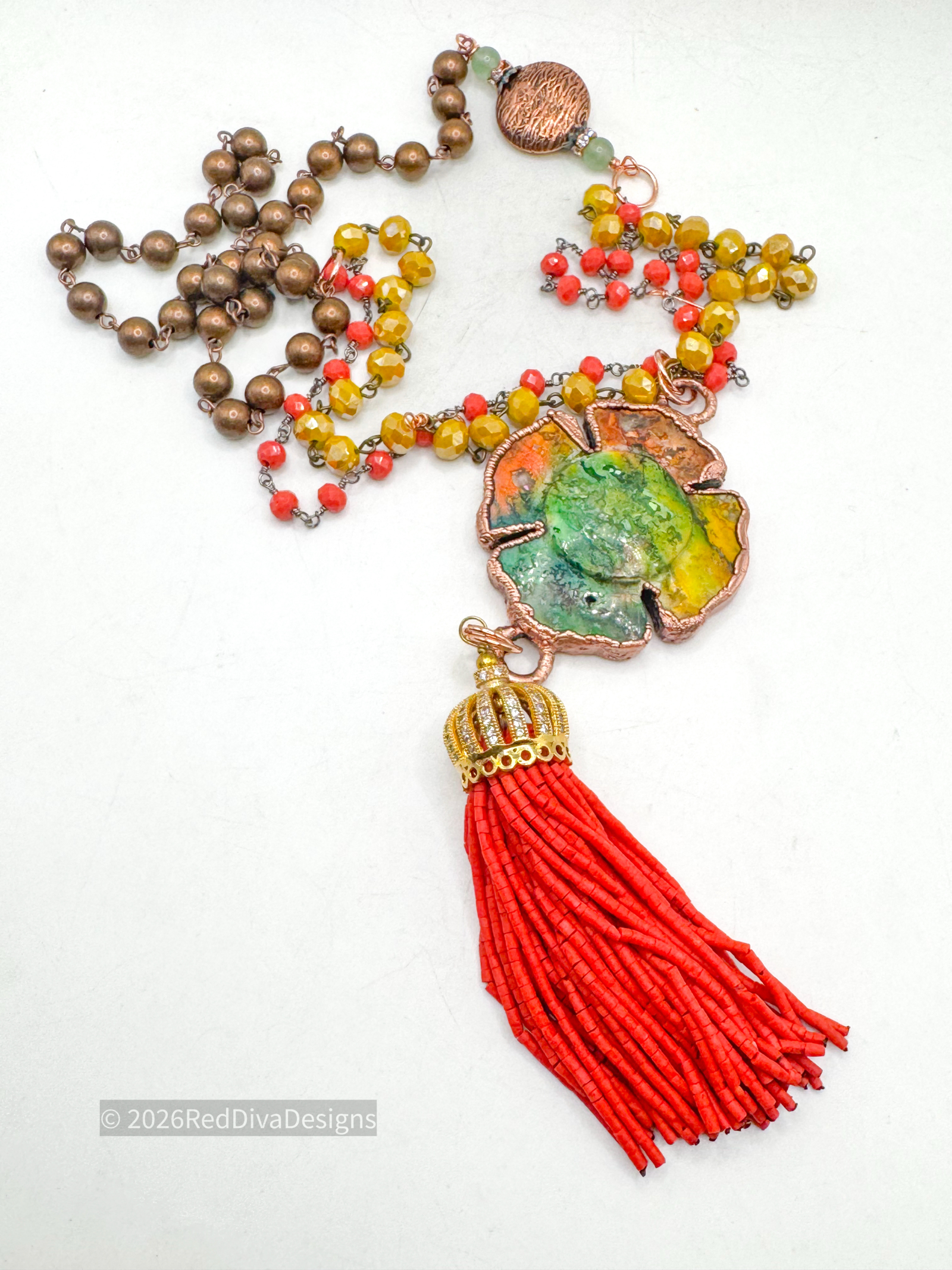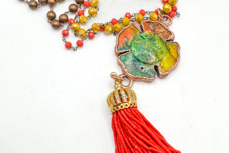 Dyed hand carved crazy lace agate flower finished on two strands of bead chain and features beautiful colorful hues of yellow, coral and mint green.. features a beautiful Kingman beaded tassel In coral. 36" long