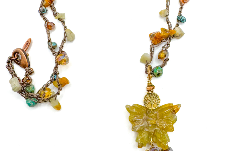 22" long Forest Jade carved butterfly necklace with sweet flower charms on a hand croheted crystal necklace Can be worn shorter.