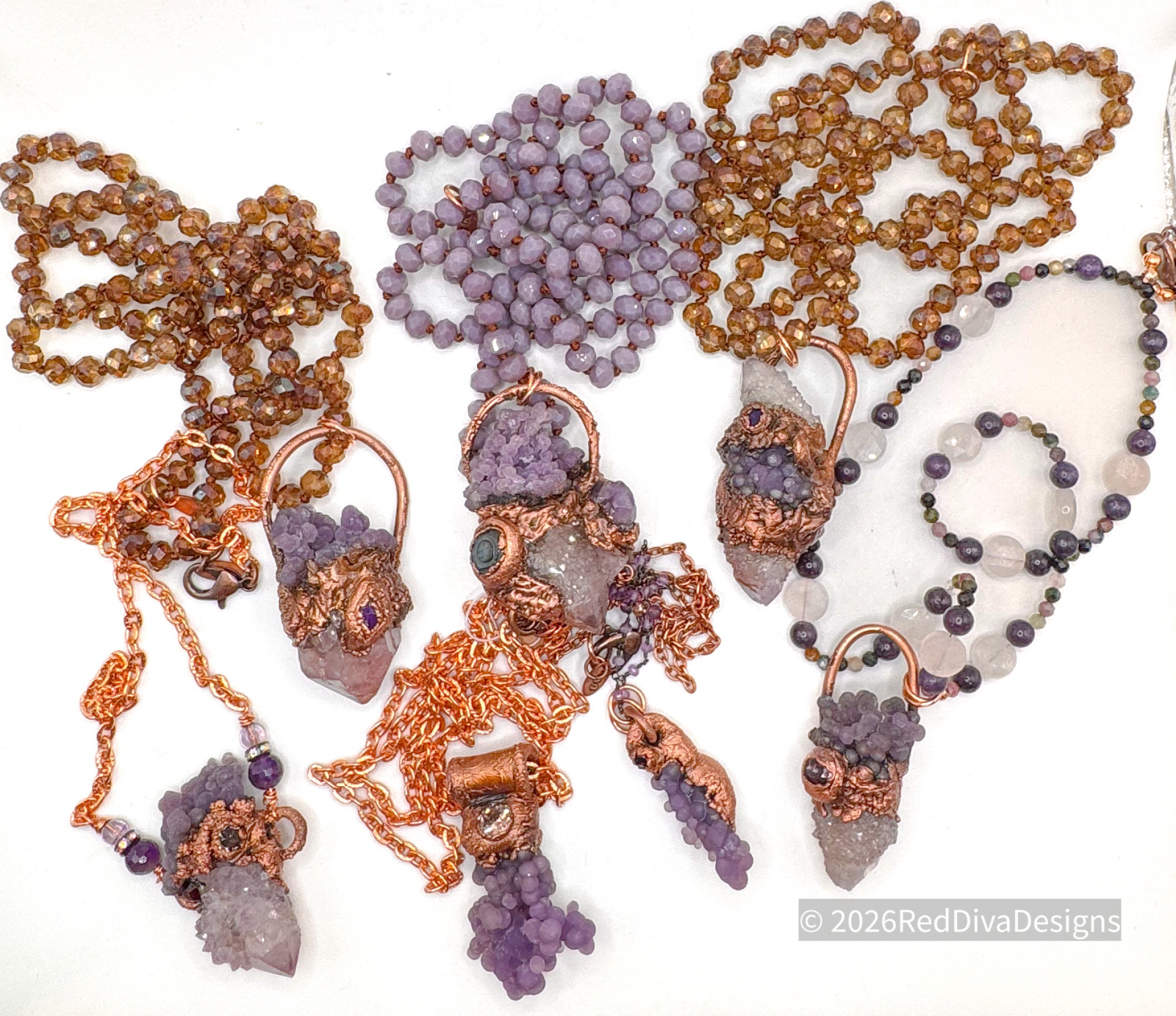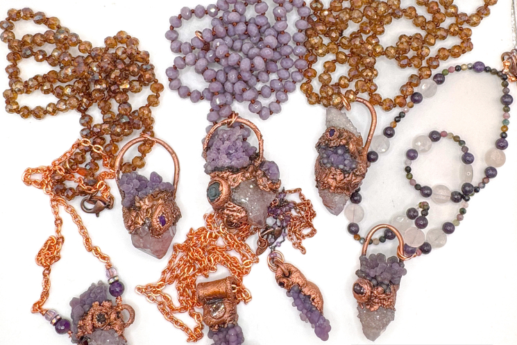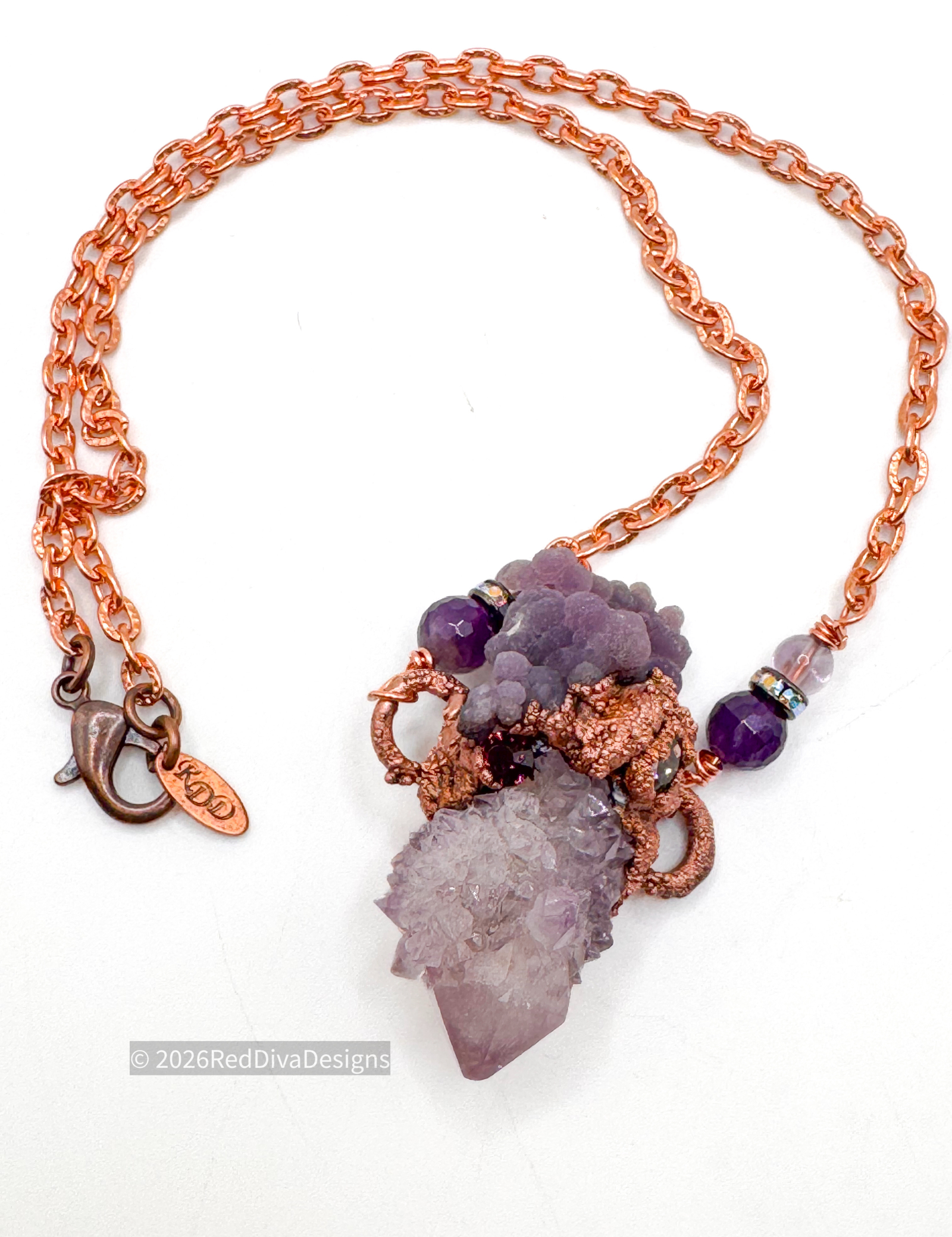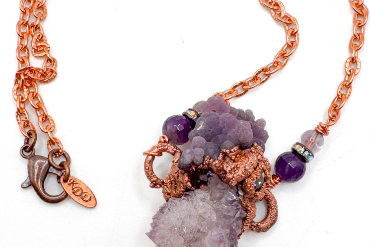 Grape agate paired with Spirit quartz all handformed and copper electroformed finished on an 18" solid copper chain.