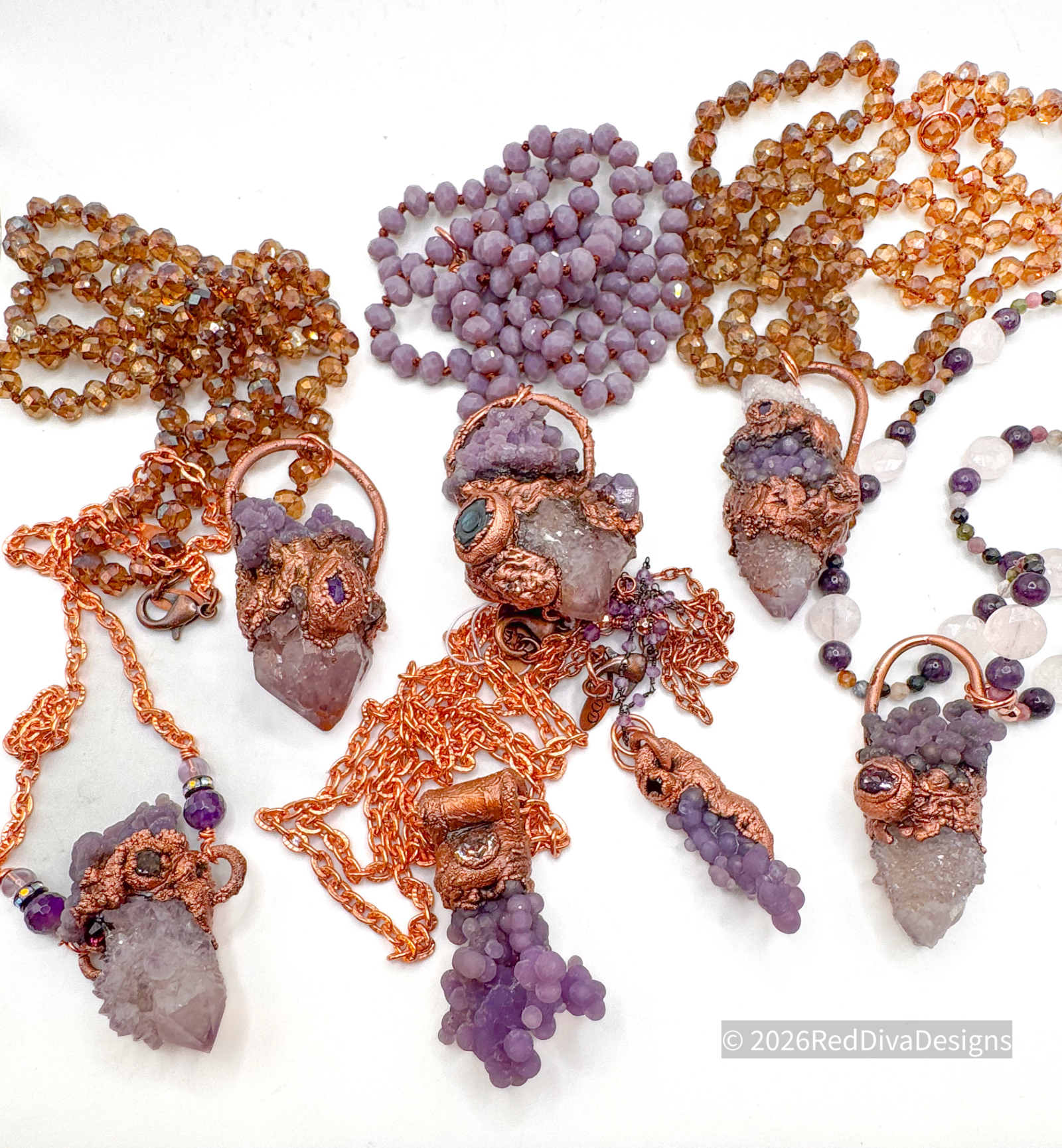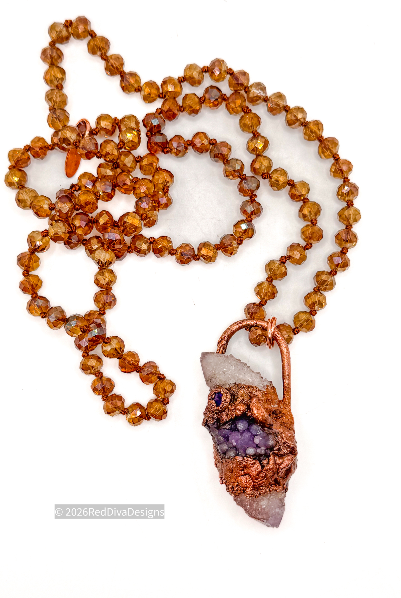 Grape Agate mixed with spirit quartz alll handformed and copper electroformed and finished on a 36" caramel knotted crystal necklace