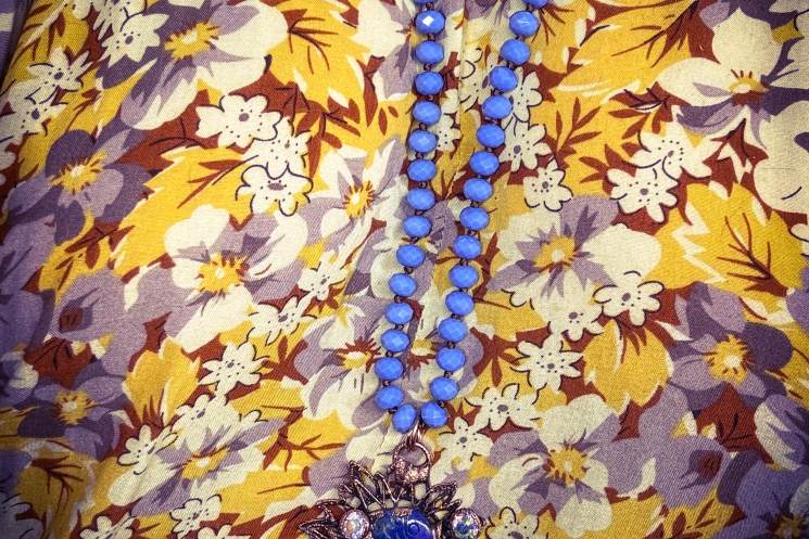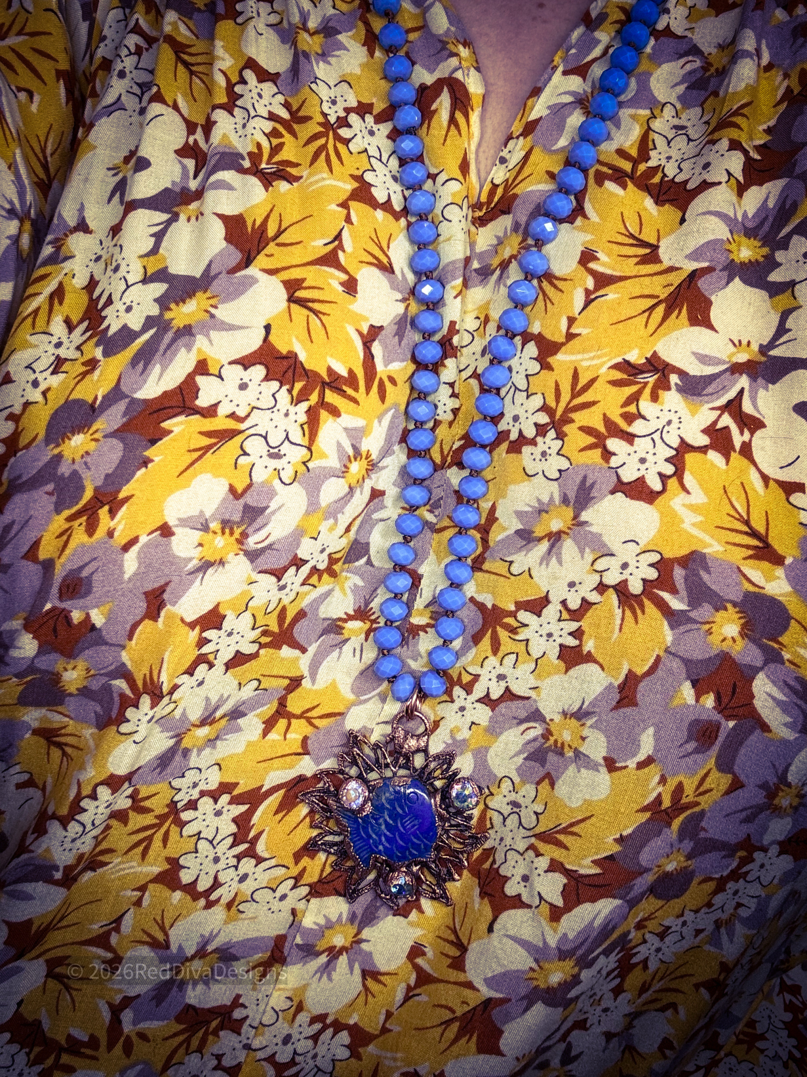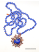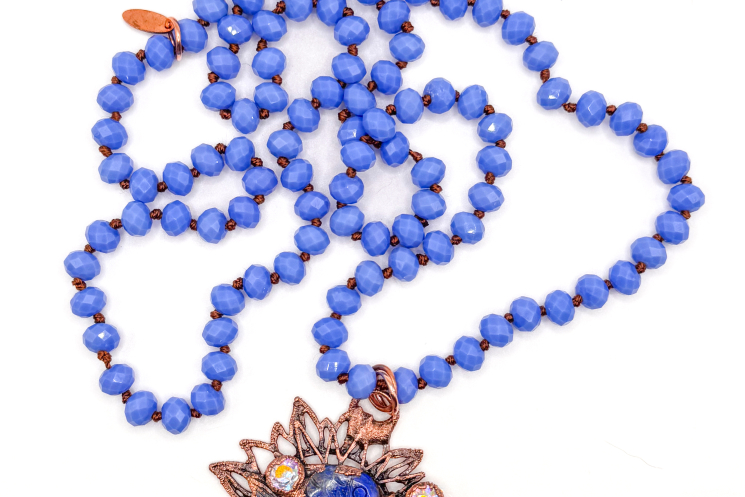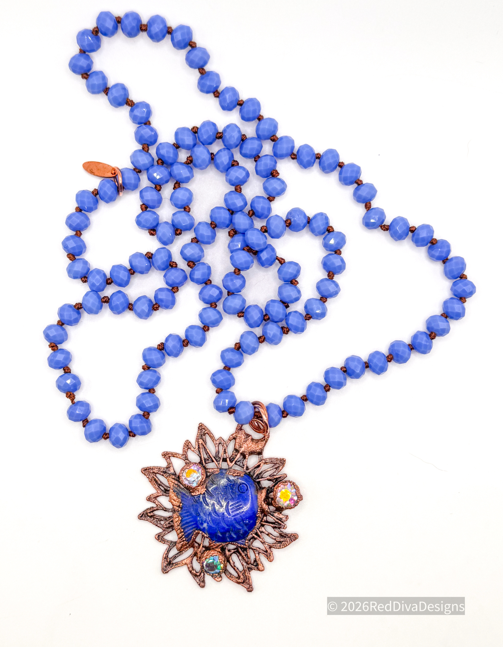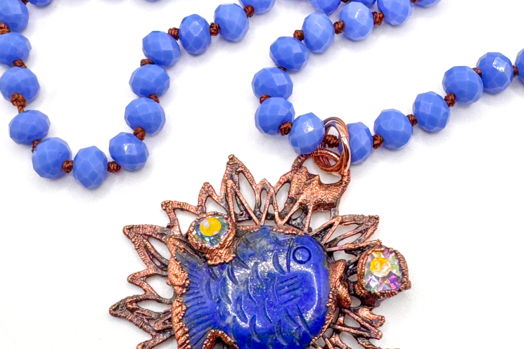 Lapis carved fish copper electroformed and finished on a blue crystal knotted necklace 36" long can be worn doubled with included universal extender.
