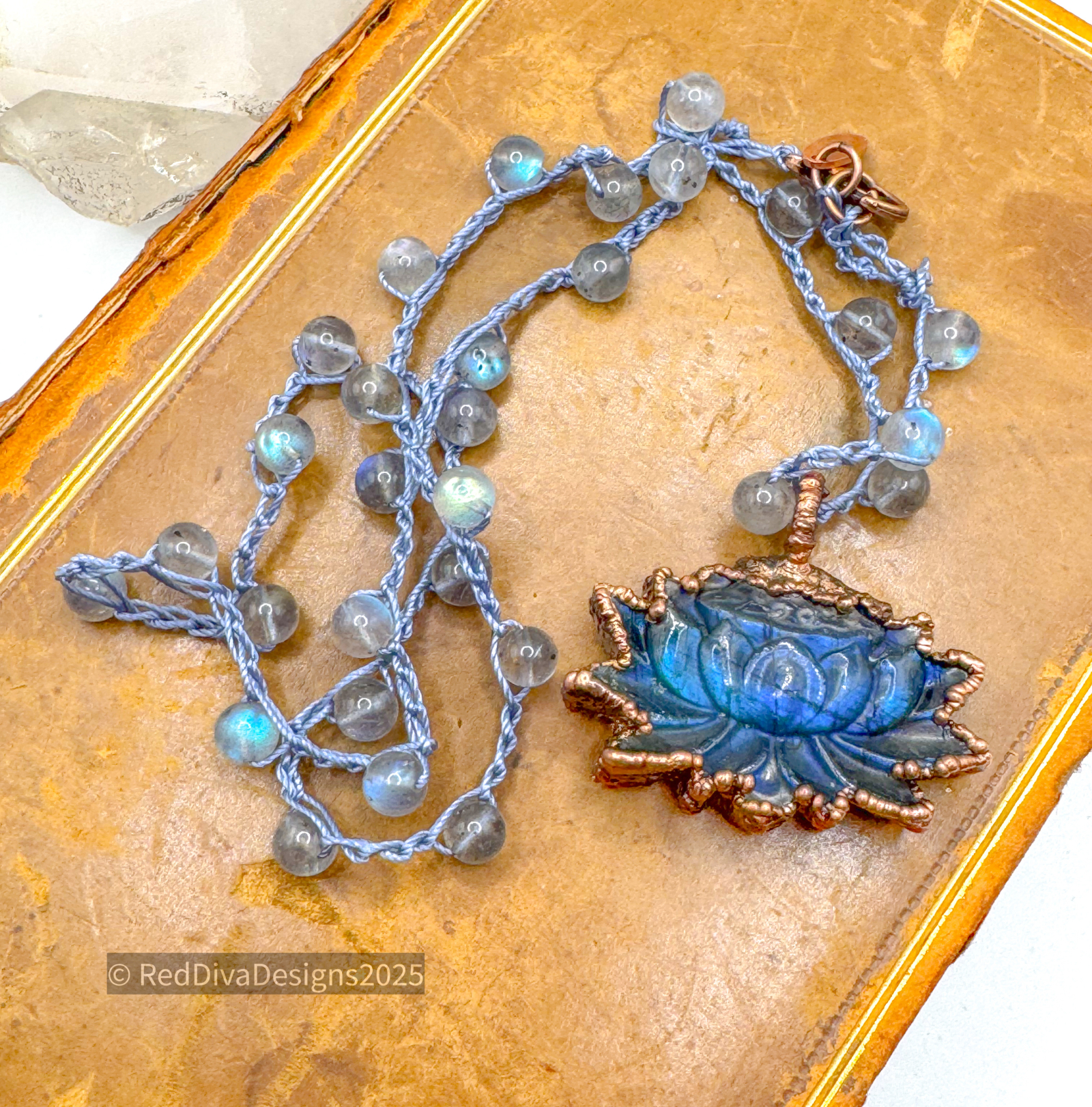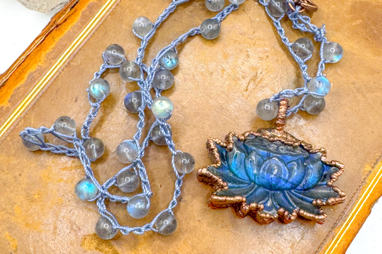 Copper electroformed and finished on an 19" labradorite crochet necklace.