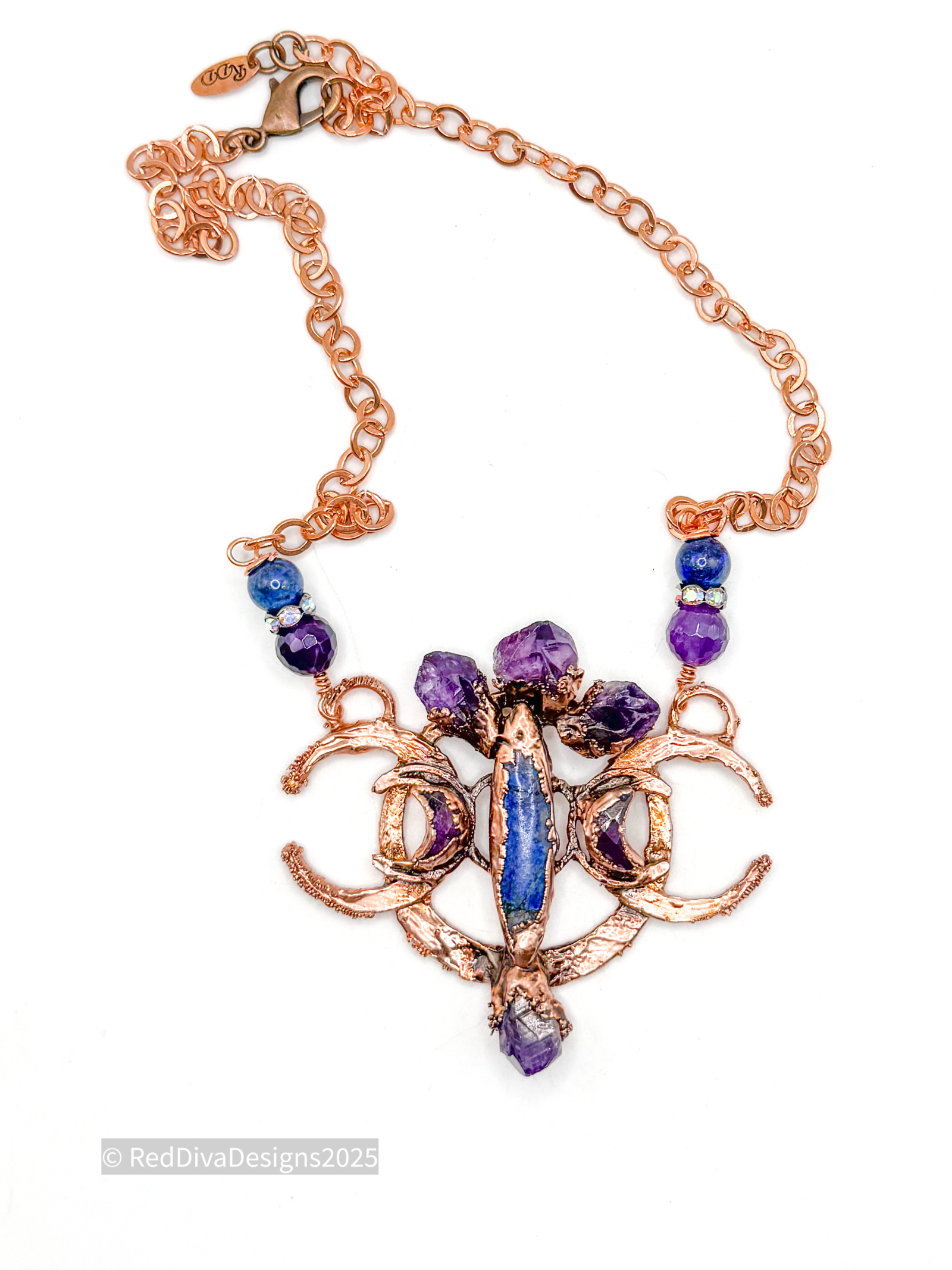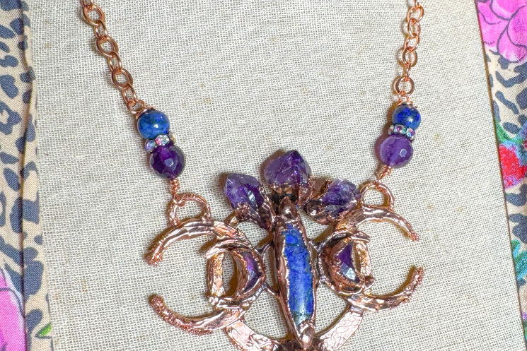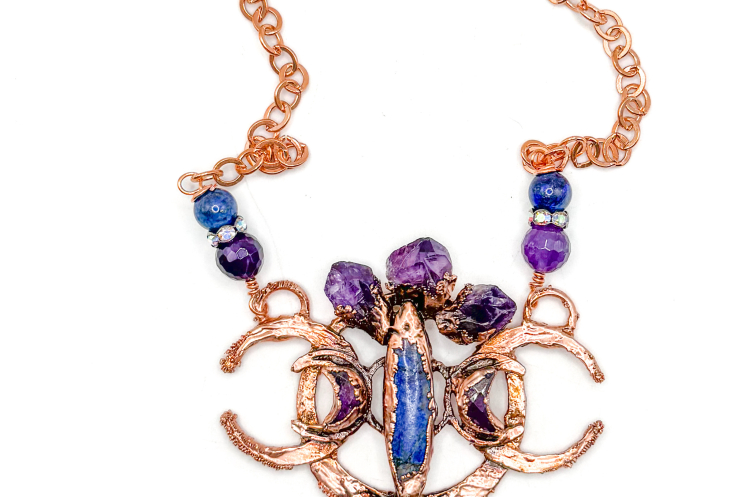 Double crescent copper electroformed and adorned with Lapis lazuli and amethyst. Finished on a solid copper chain 19" long.