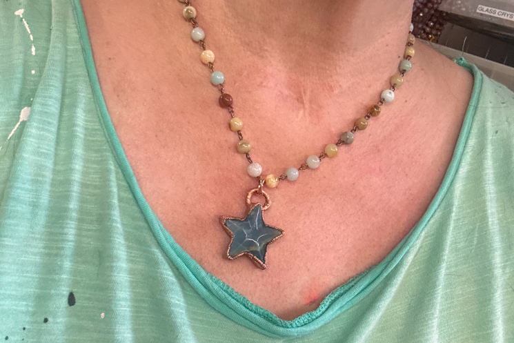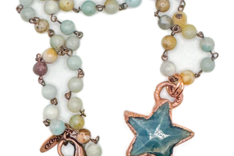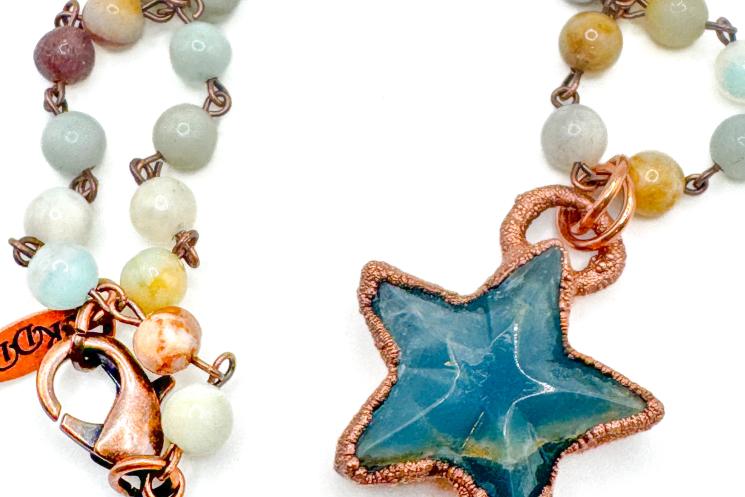 Copper electroformed carved Lumarian Star. Finished on an 18" amazonite bead chain 18"