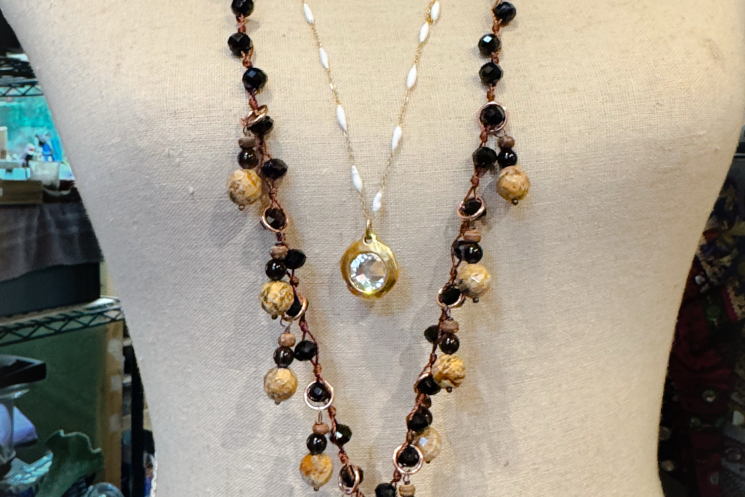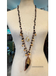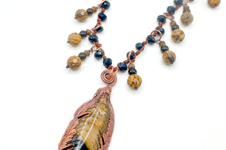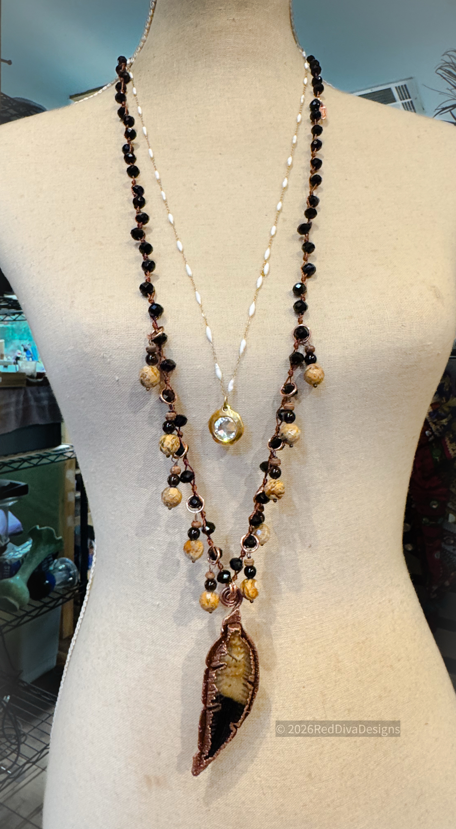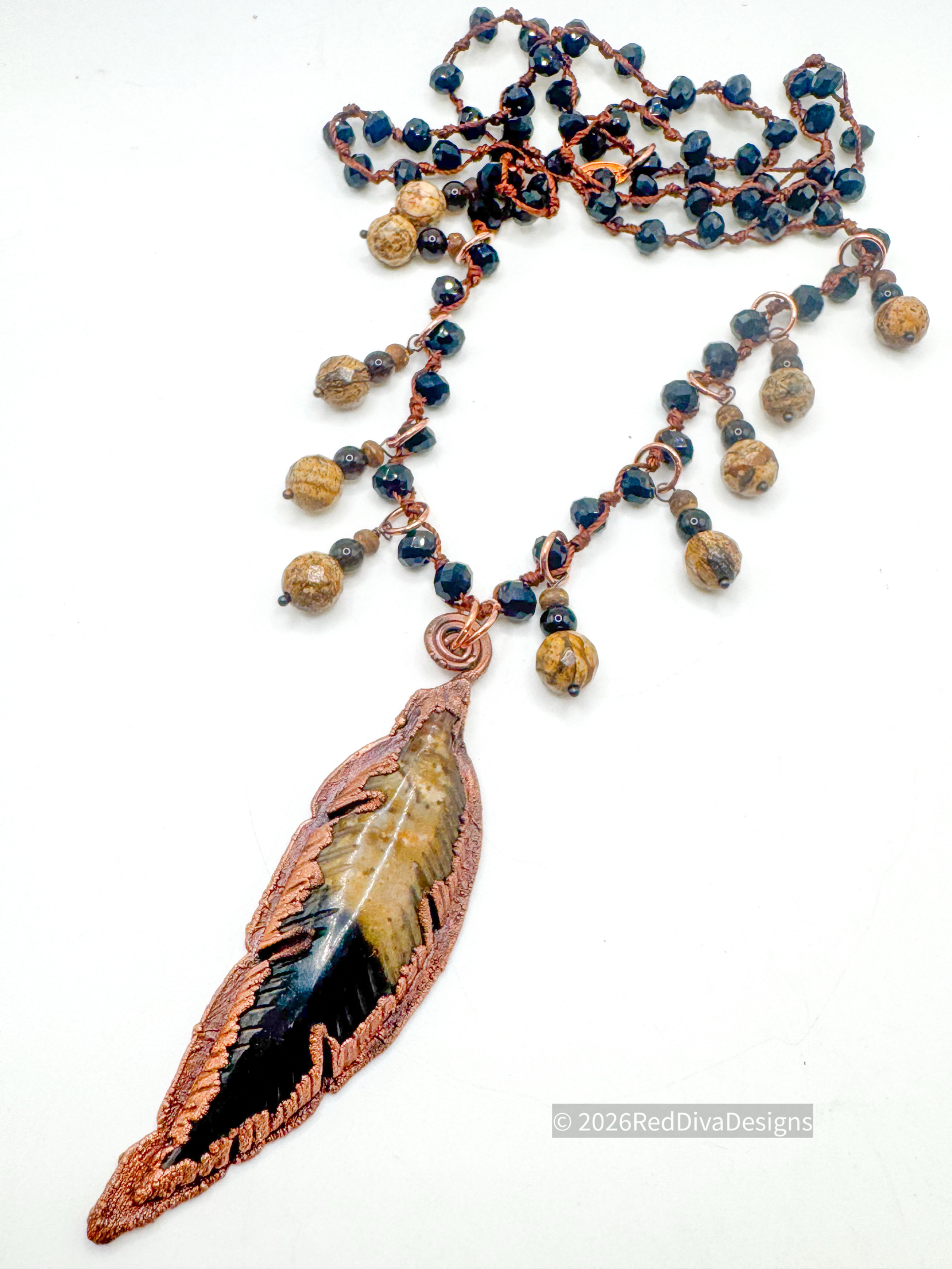 Palm Root carved Feather copper electroformed and finished on a crocheted black crystal 36" long necklace can be worn doubled with included universal extender.