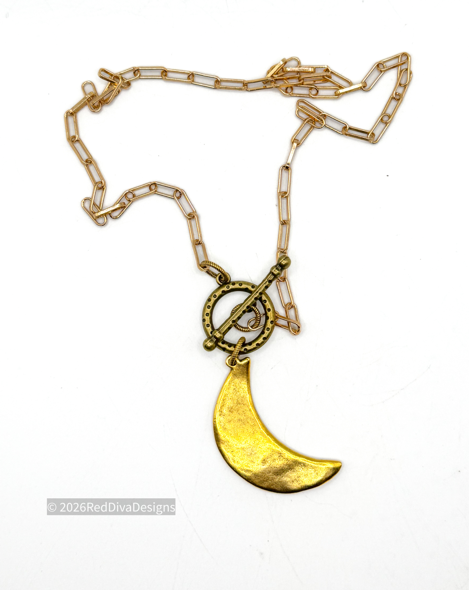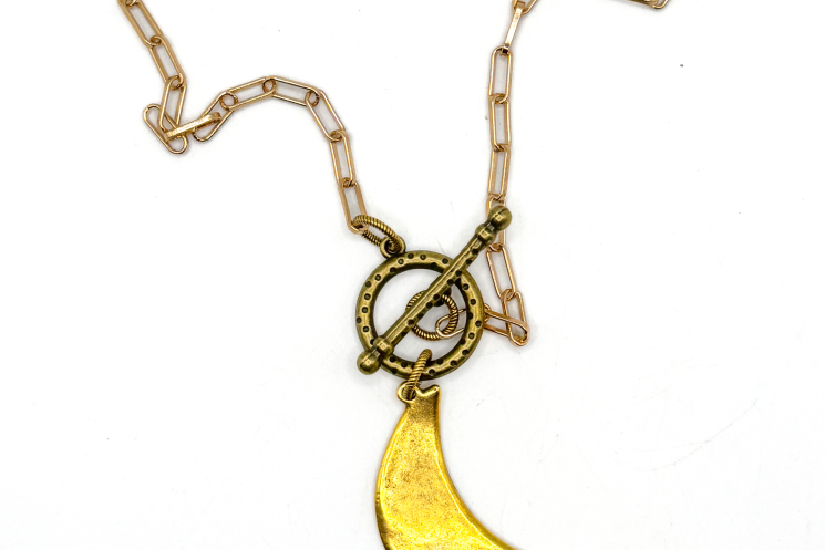Gold Moon Crescent on an 18" gold clip chain with toggle. Great for layering or stand alone!
