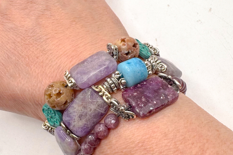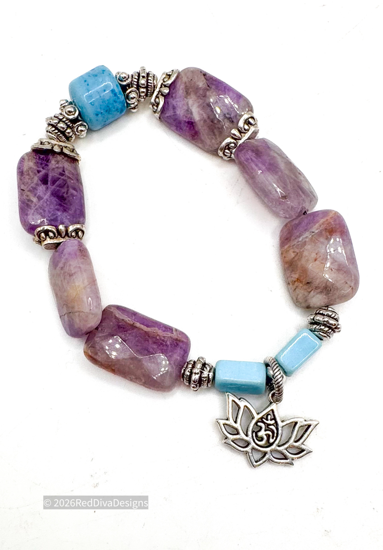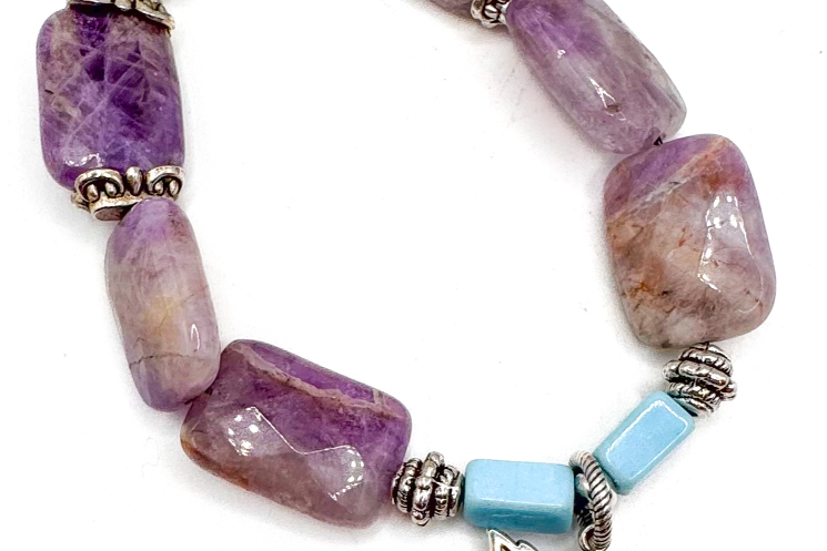 Amethyst mixed with Turqouise blue Mardi Gras glass beads from the private stash! Pewter Silver accents and bead caps. Stretch cord and rock solid.