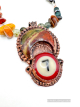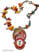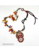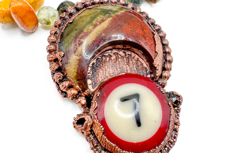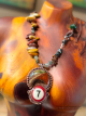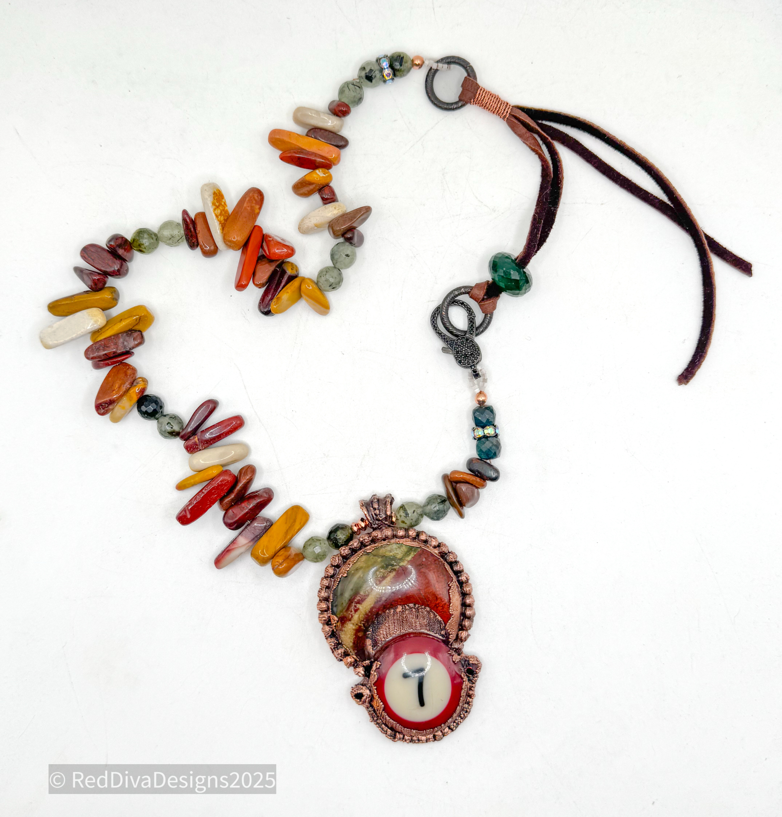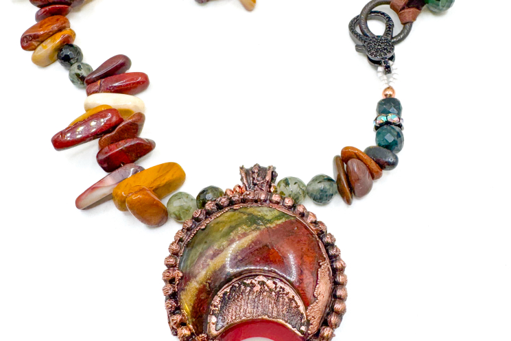 Brecciated Jasper crescent moon, Moukaite, Red Jasper, and Perhinite with a touch of chocolate deer skin leather. 19" long Hand cut and copper electroformed