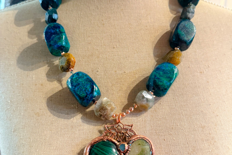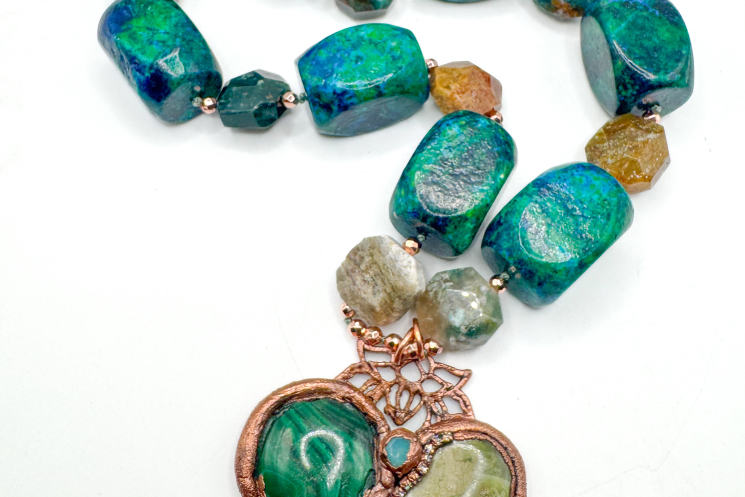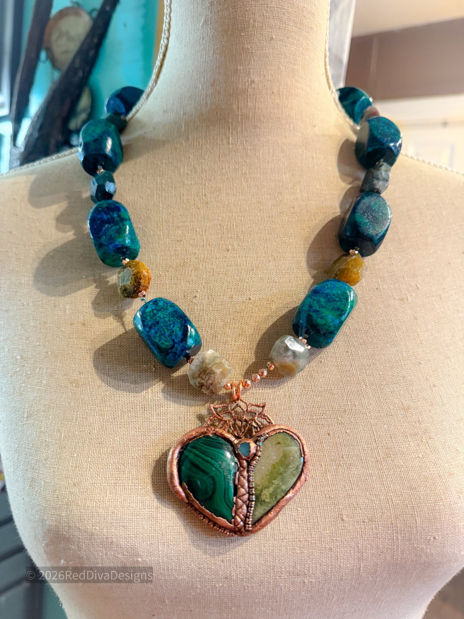 Two beautiful gemstones electroformed into one Mended Heart pendant. All Copper. Finished on a very Big and Bold beaded gem of 21" of genuine Chrysochola, malachite and Indian agate.