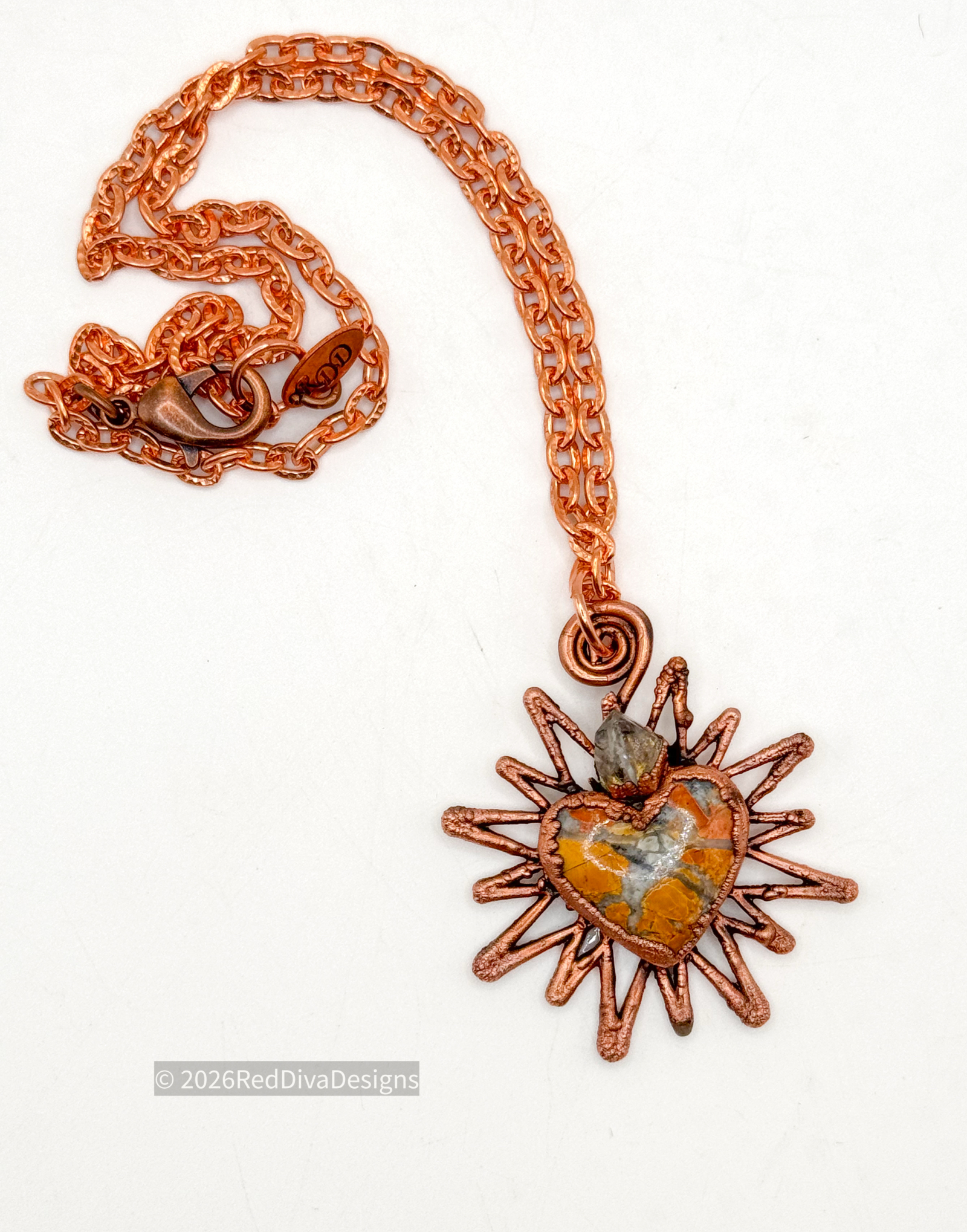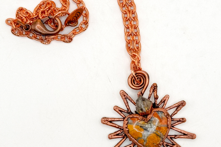 Maligano Jasper carved heart with a raw Citrine point flames. Copper electroformed and finished on an 18" solid copper chain.