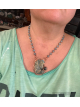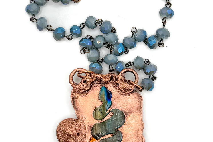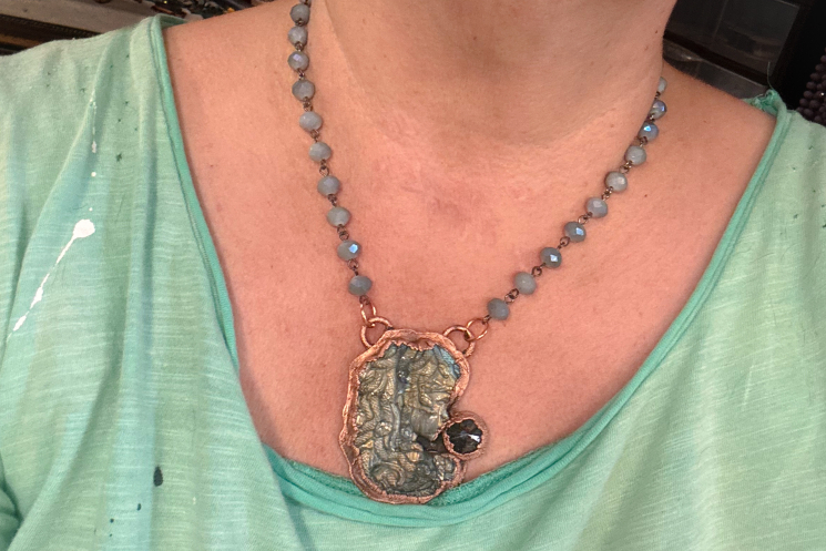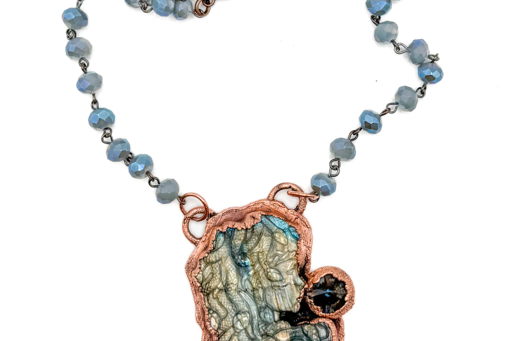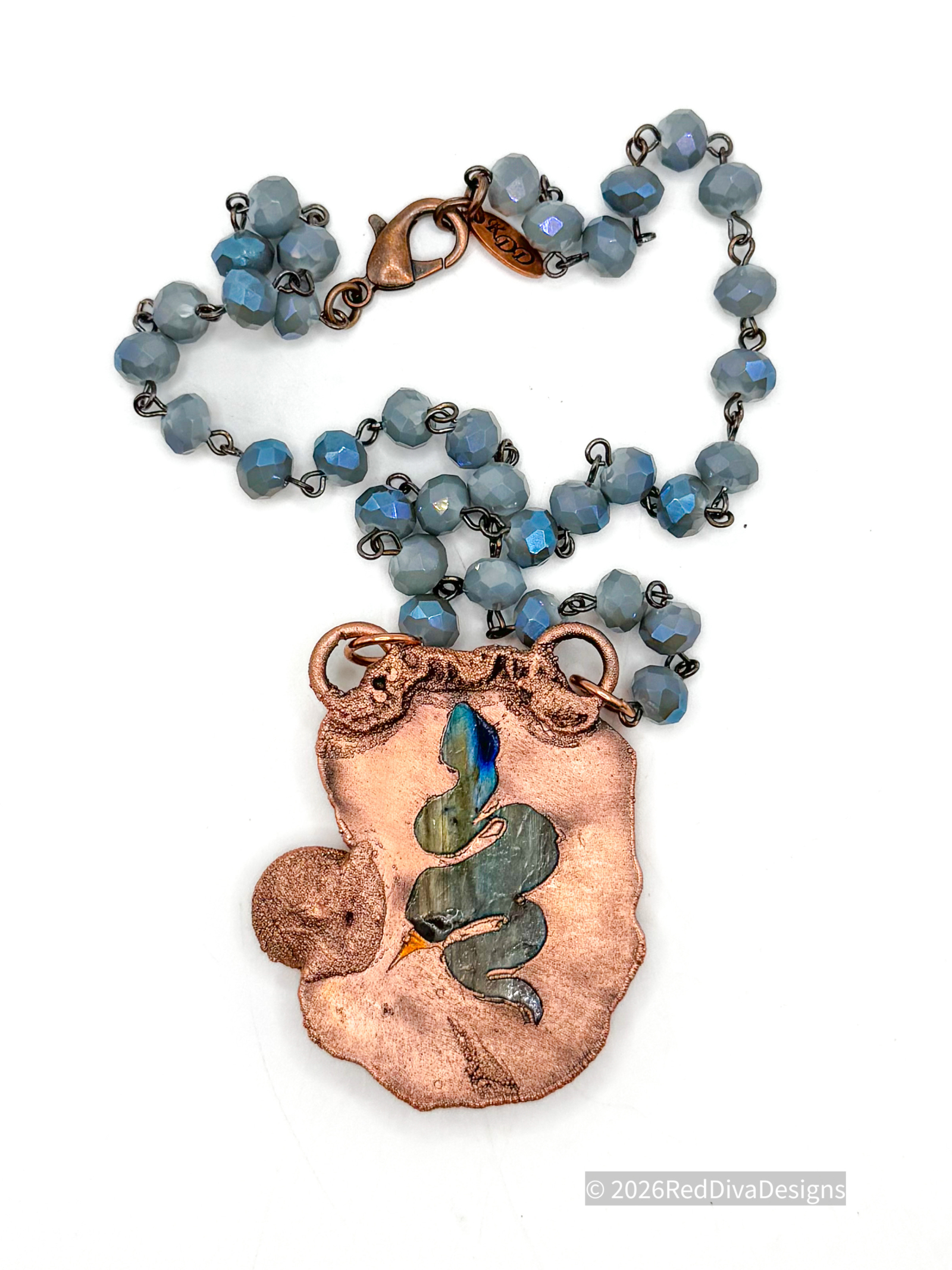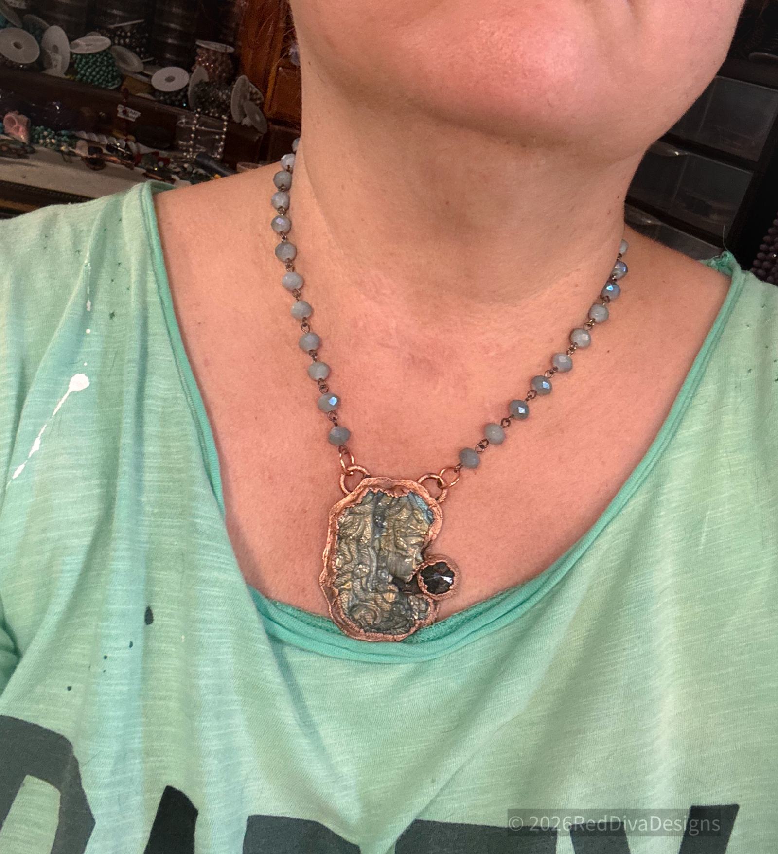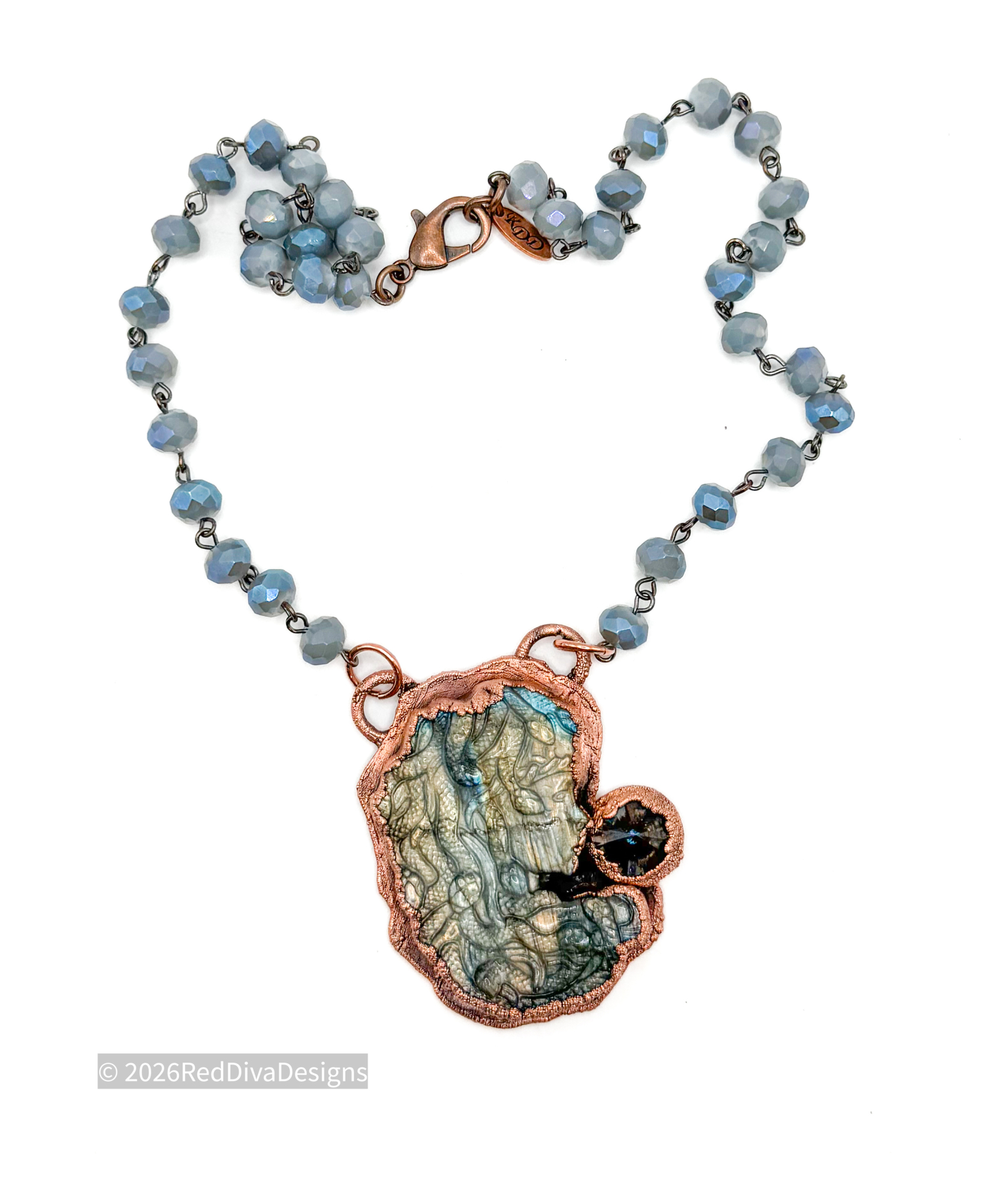 Labradorite carved Medusa pendant copper electroformed and finished on a smoke haze bead chain 18" long