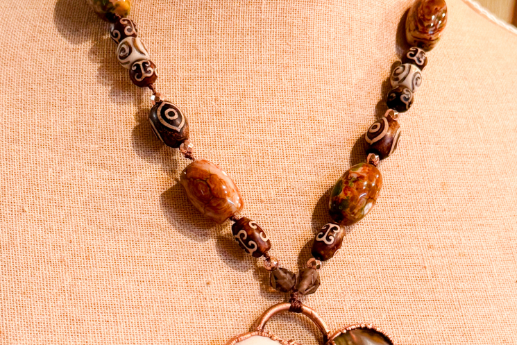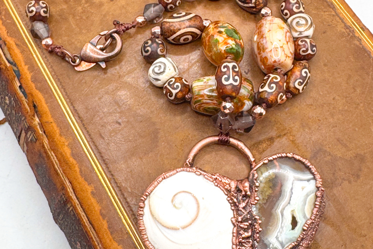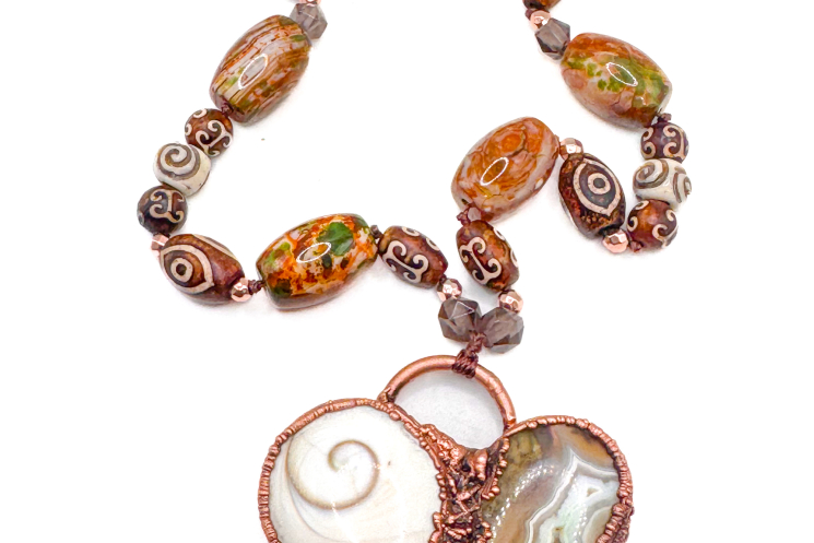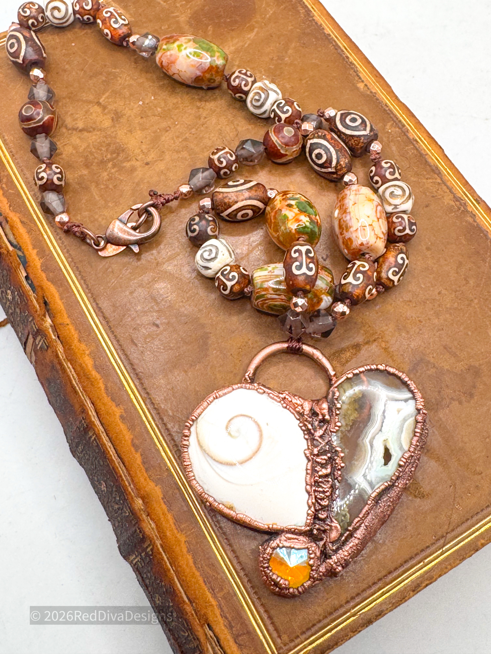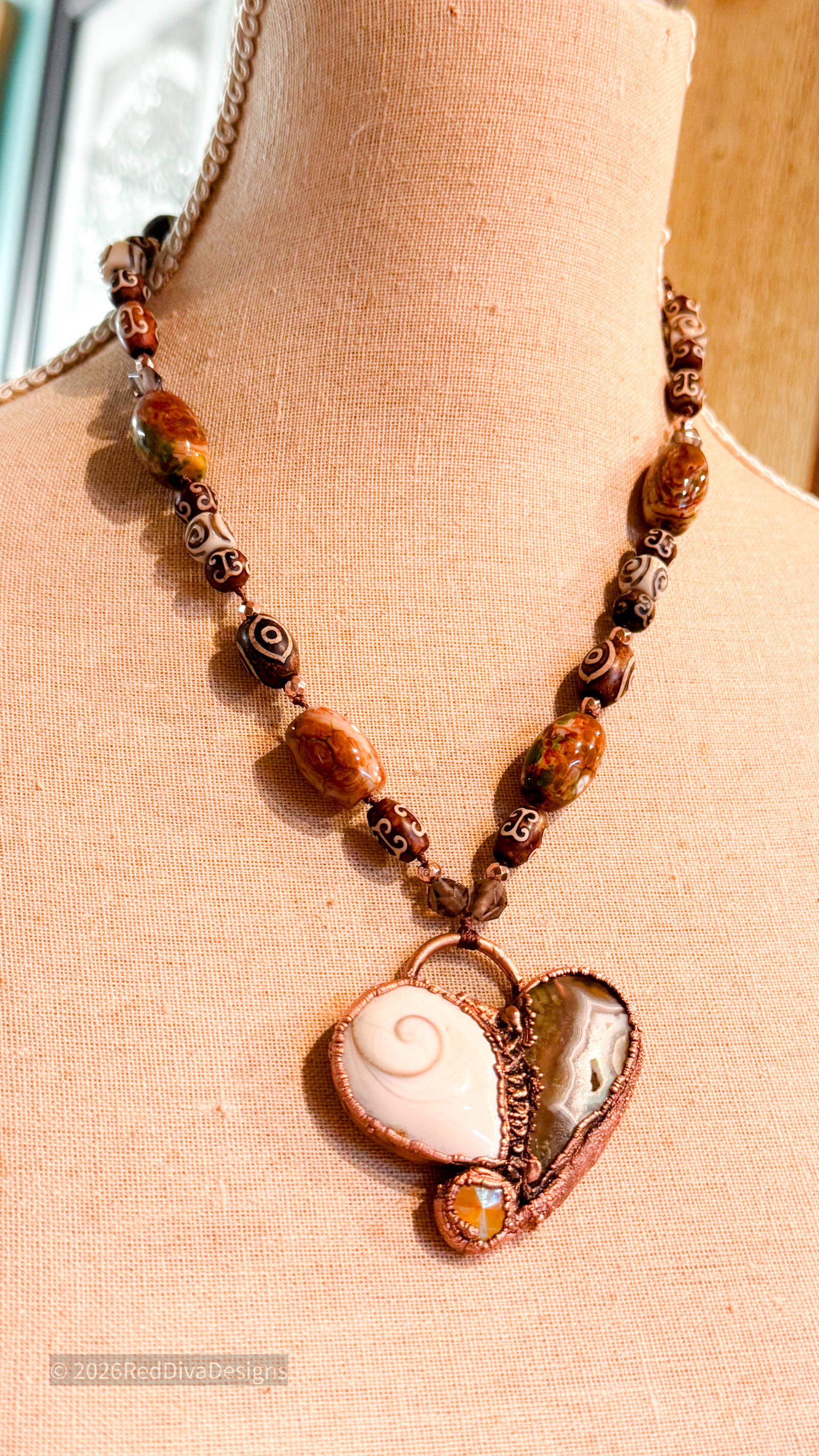 Shiva Shell and Plume Agate combined into a copper electroformed mended heart and finished on an 19.5" handknotted necklace comprised of genuine African tribal beads and turqouise. A stunner!