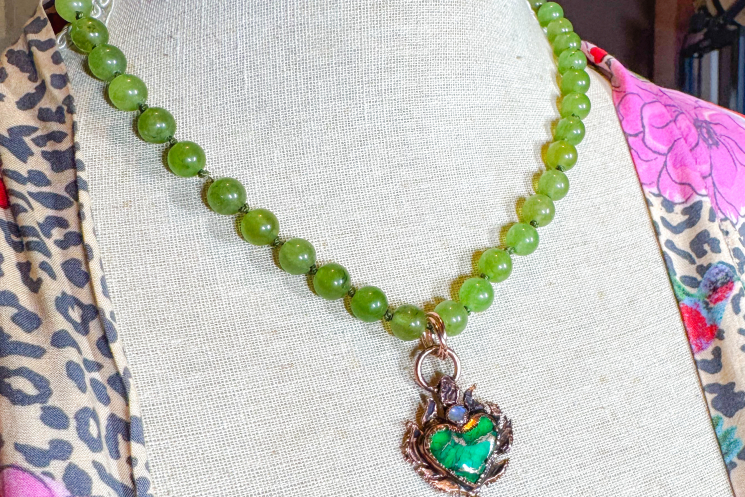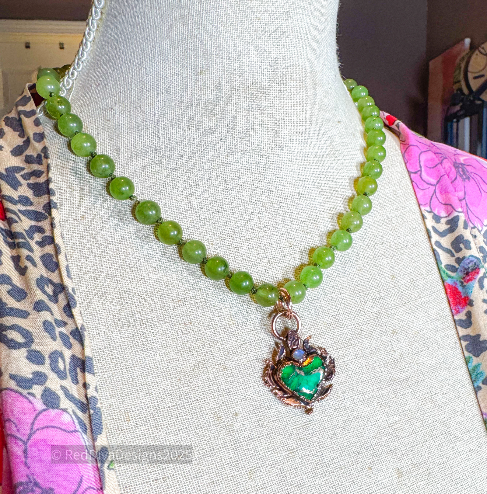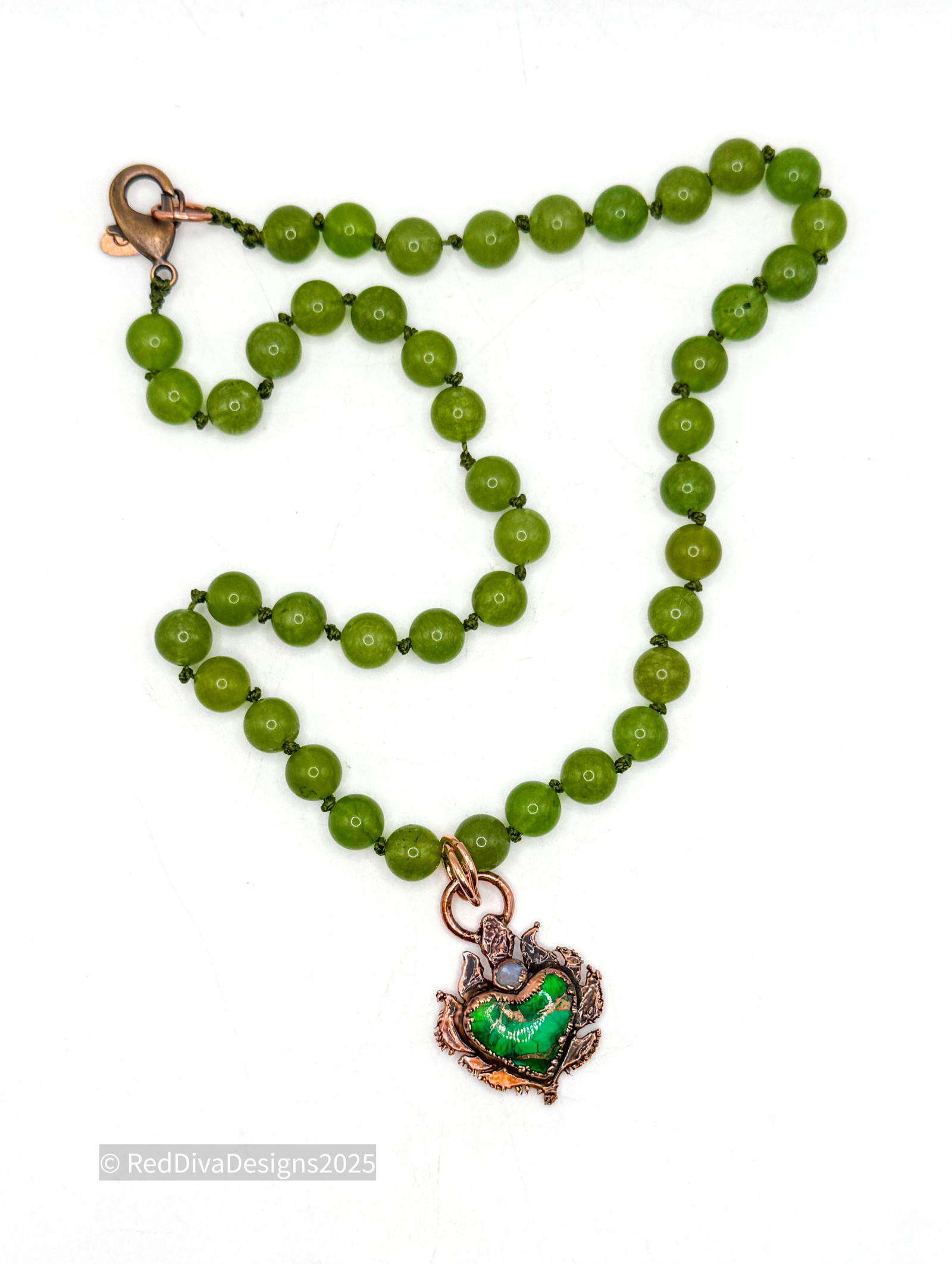Canadian Jade handknotted 18" necklace with the most stunning Green Mohave Turquoise copper electroformed flame heart.