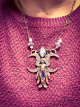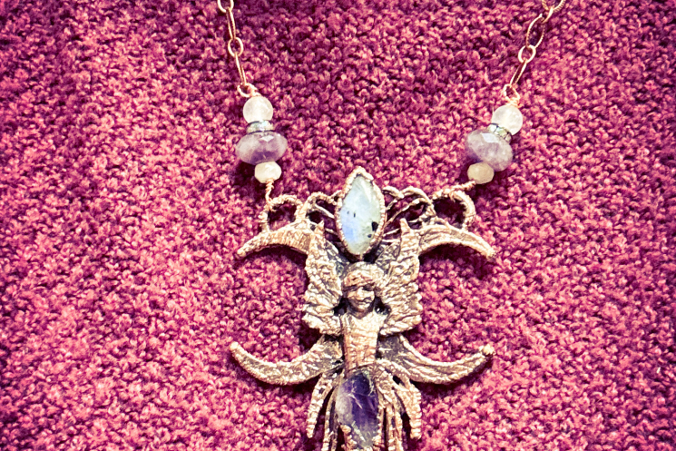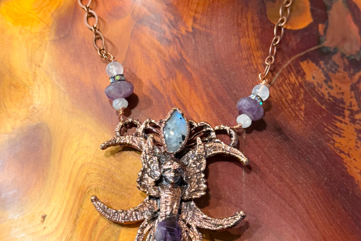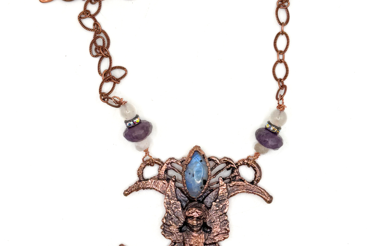 Moonstone and Amethyst make up this pretty etheral sprite I have created by way of copper electroforming. Finished on an antique copper chain 18" long.