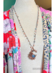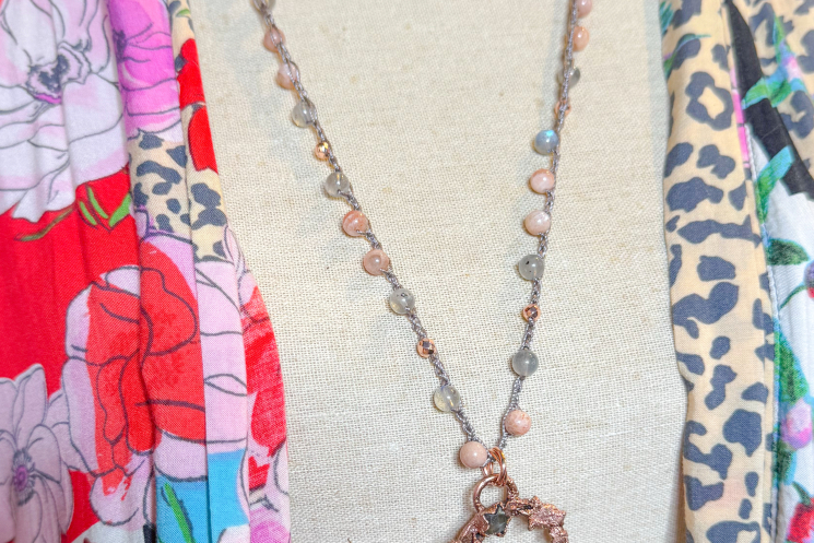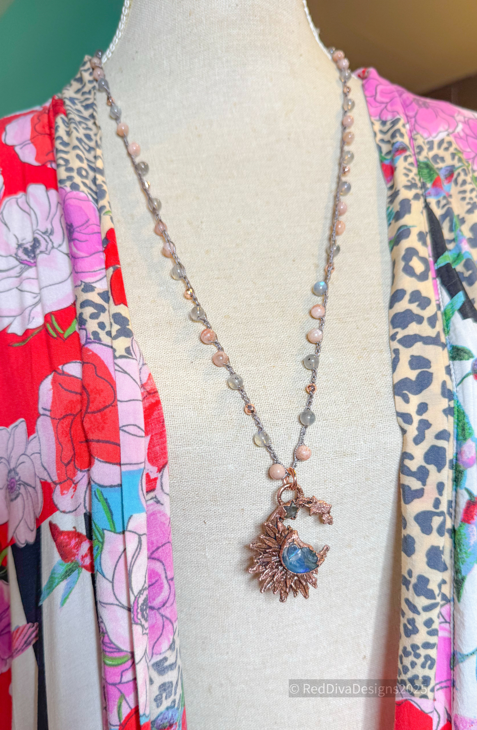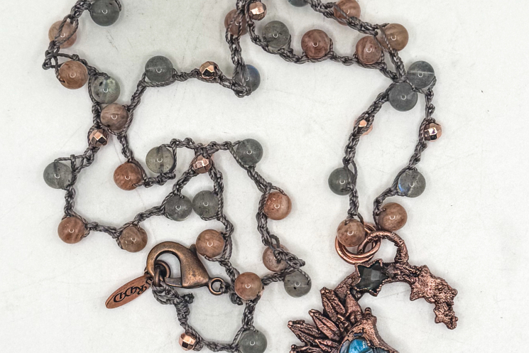 Labradorite man in the moon crescent copper electroformed and finished on a crochet consisting of sunstone and labradorite 22" long and can be worn shorter