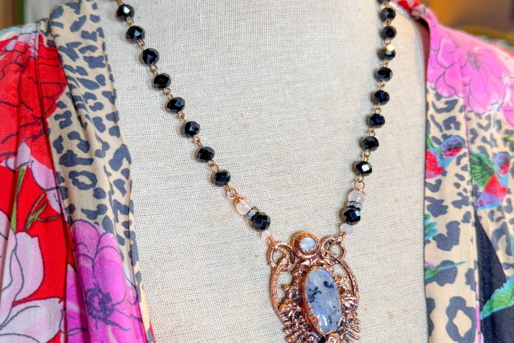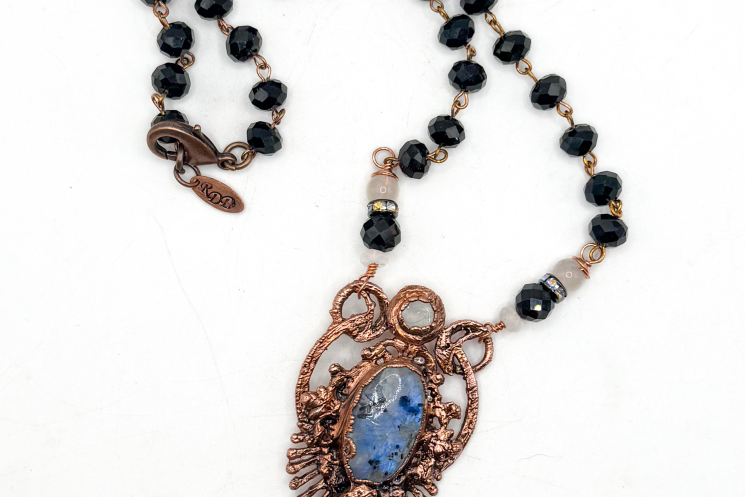 Gothic girls beware!!! Moonstone and Onyx alert!! Copper electroformed and finished on black rosary bead chain. 18" long. Most definitely for the "Unique" girls.... why blend in right?!