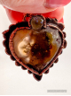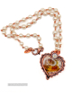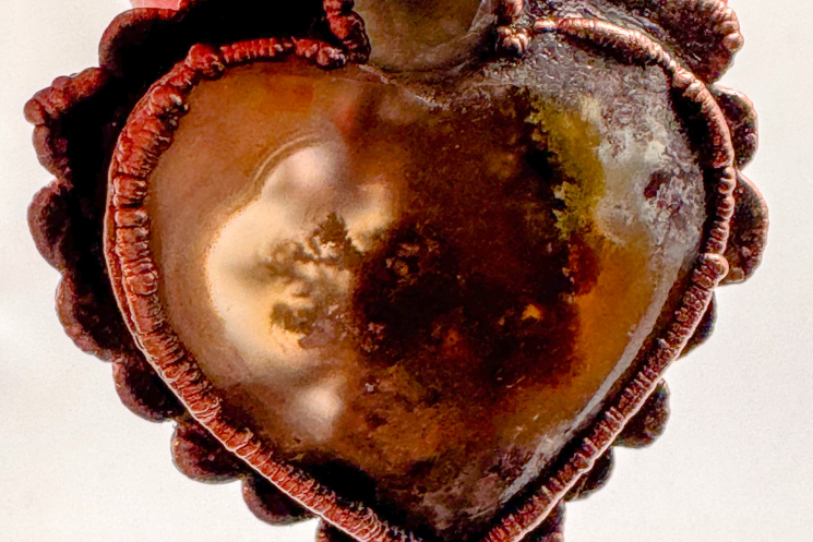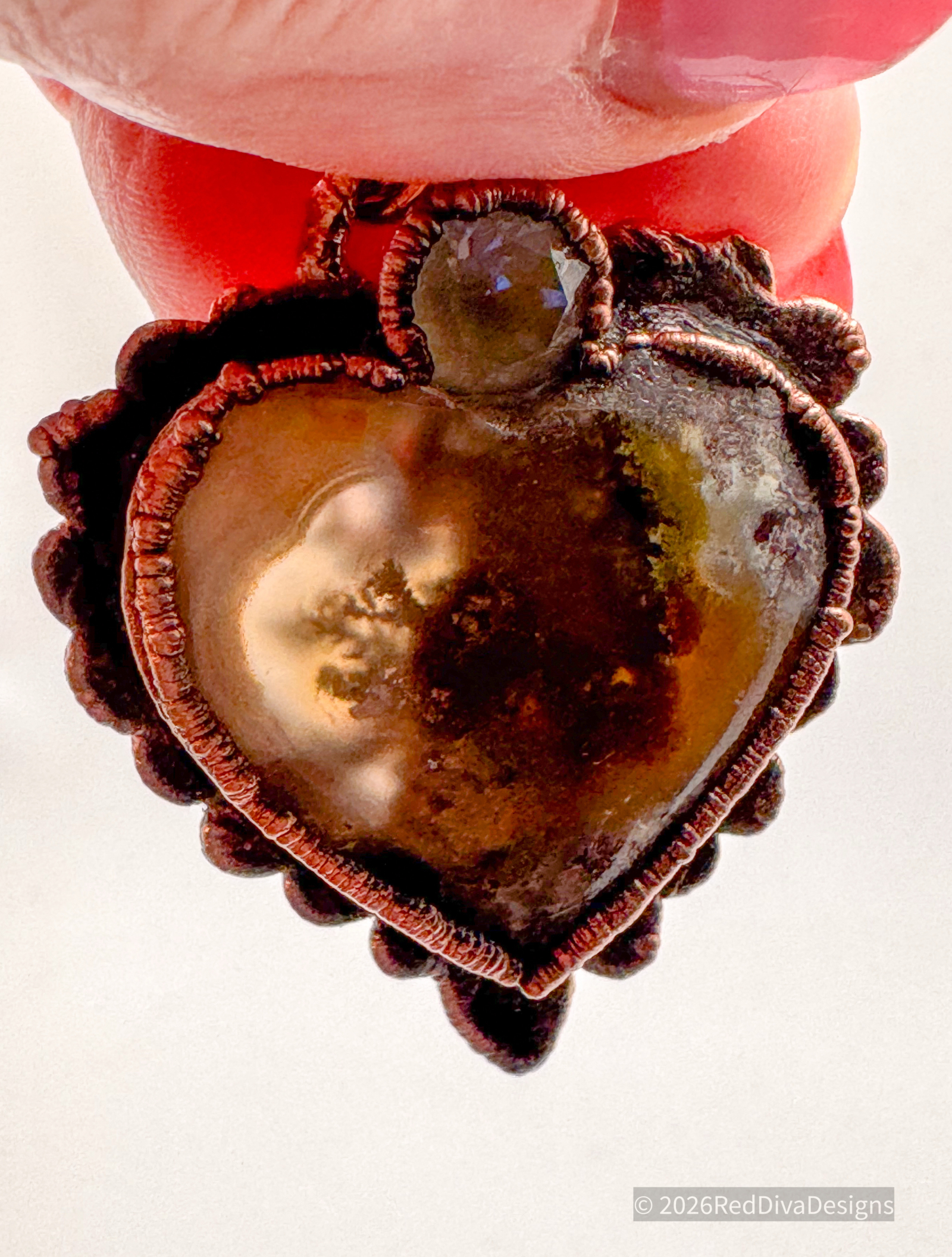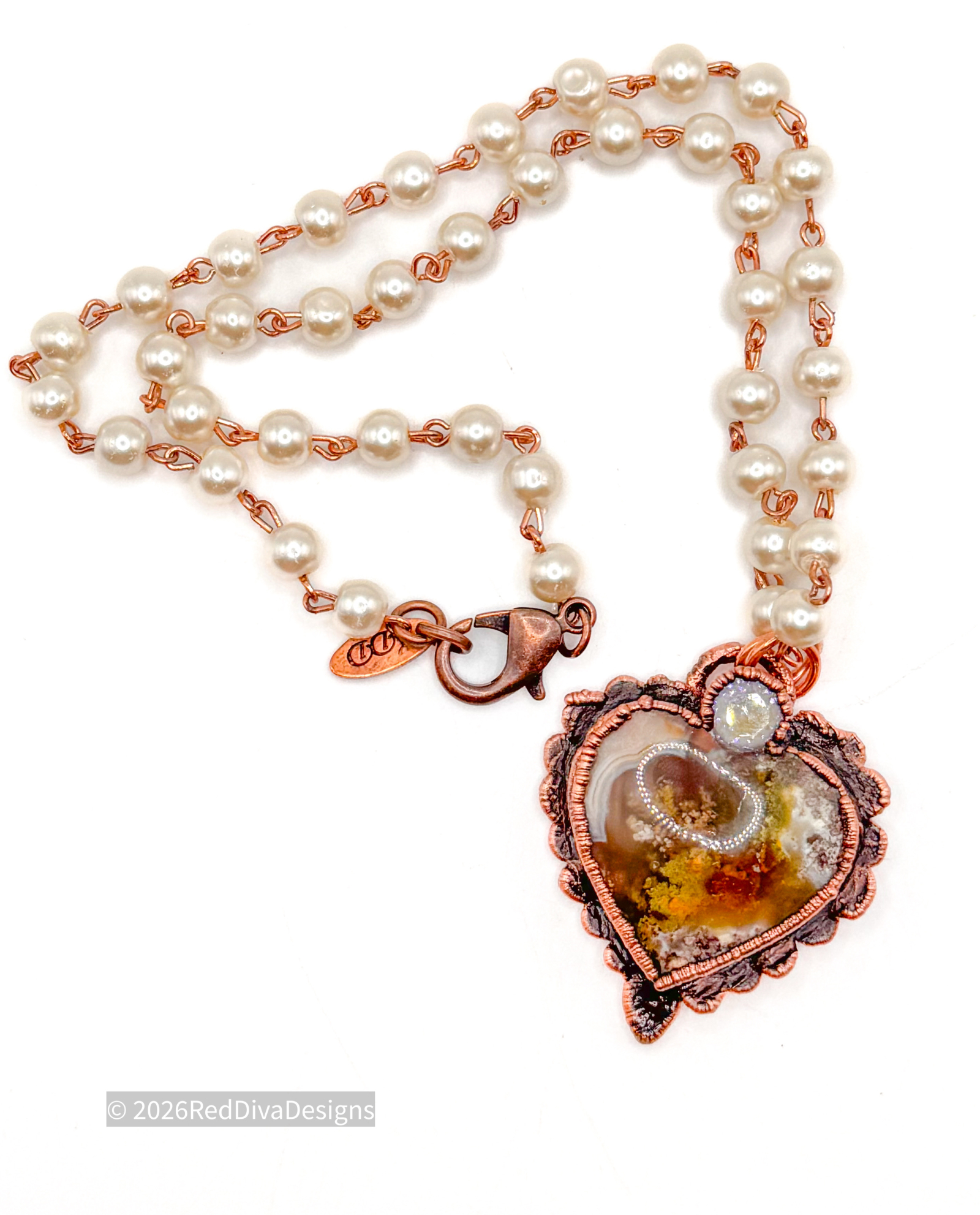 Moss Agate carved heart copper electroformed and finished on an 18" pearl chain.