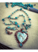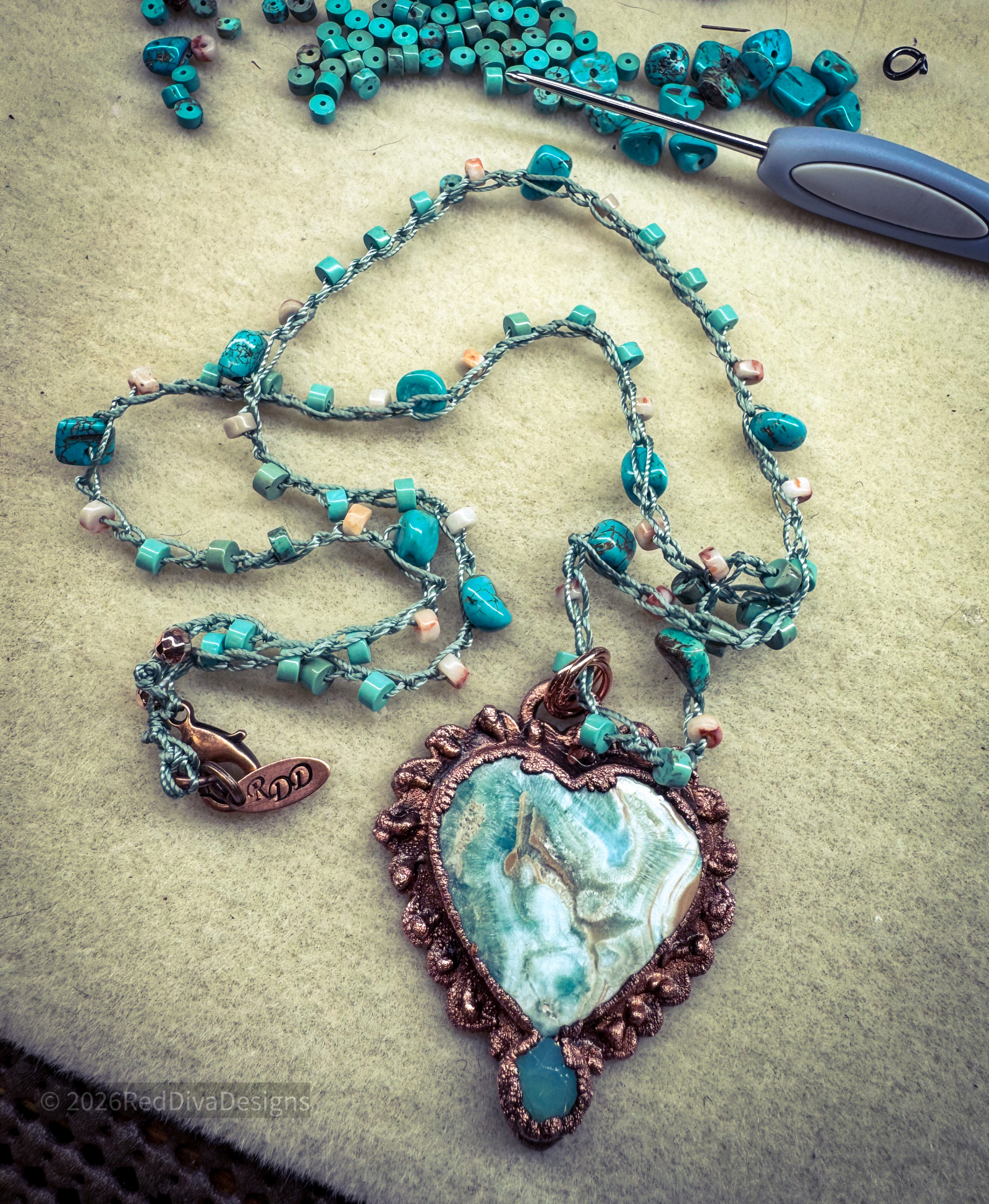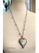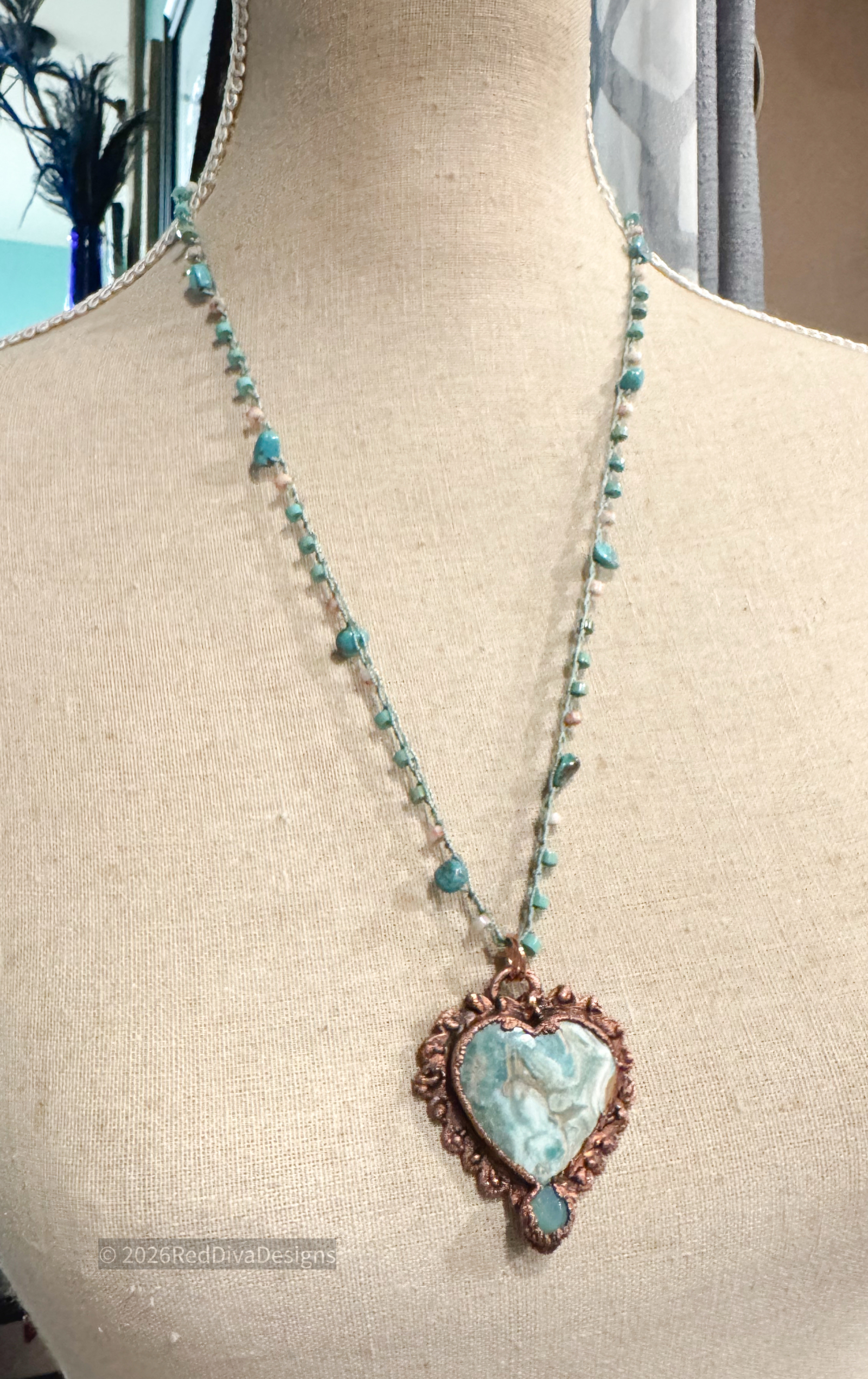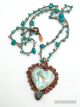 Blue Calcite carved heart copper electroformed and finihsed on a 22" long crochet that can be worn shorter at multiple lengths. Crochet consists of Turqouise, and sunstone heishi.
