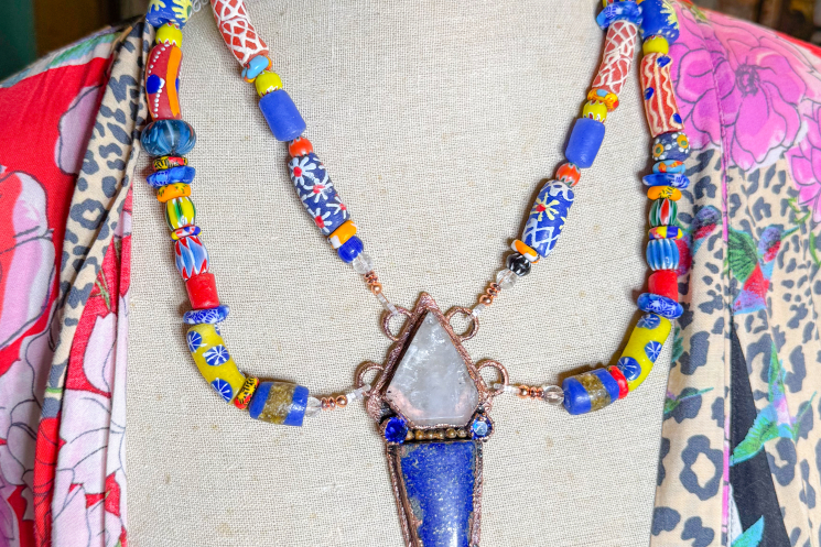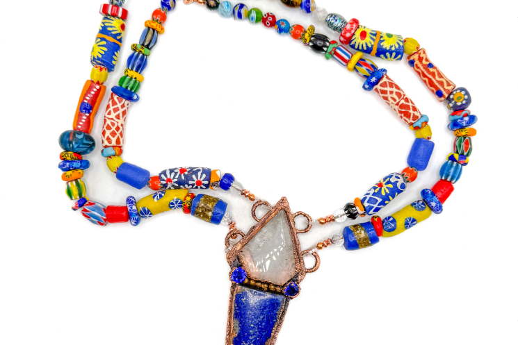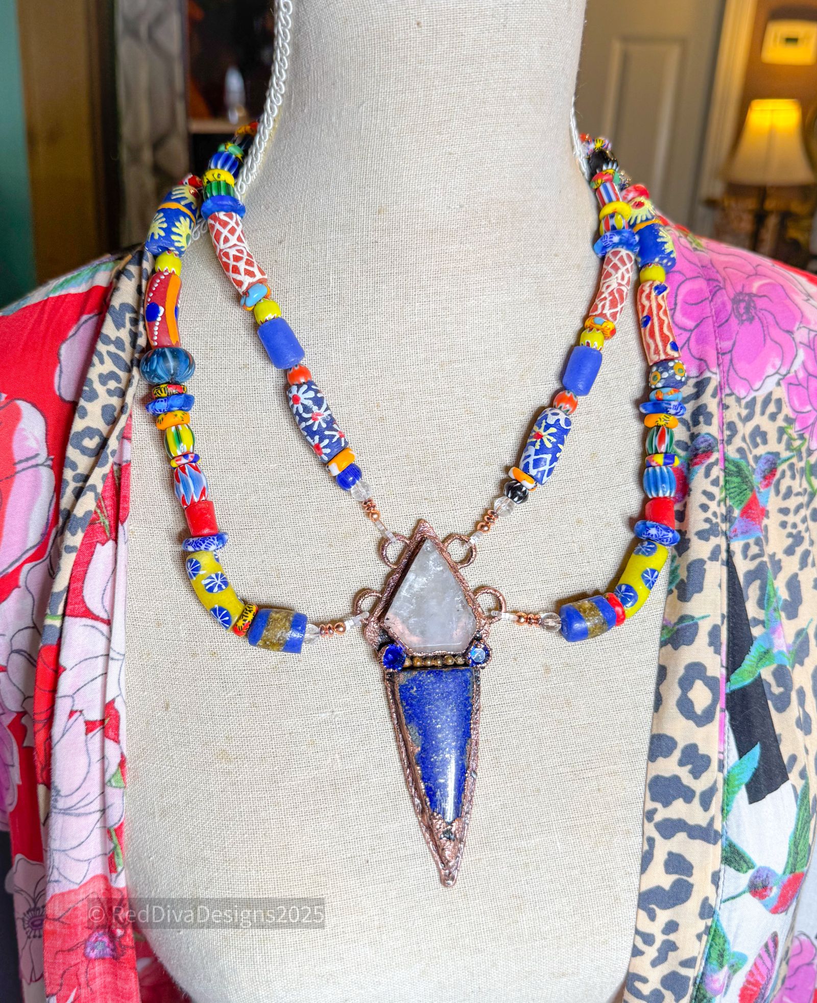 Lapis Lazuli paired with Quartz, for more enhancement! Finished on two lengths of African trade beads! You wont see this on anyone else that's for sure! Why blend in? When you can stand out!!