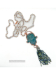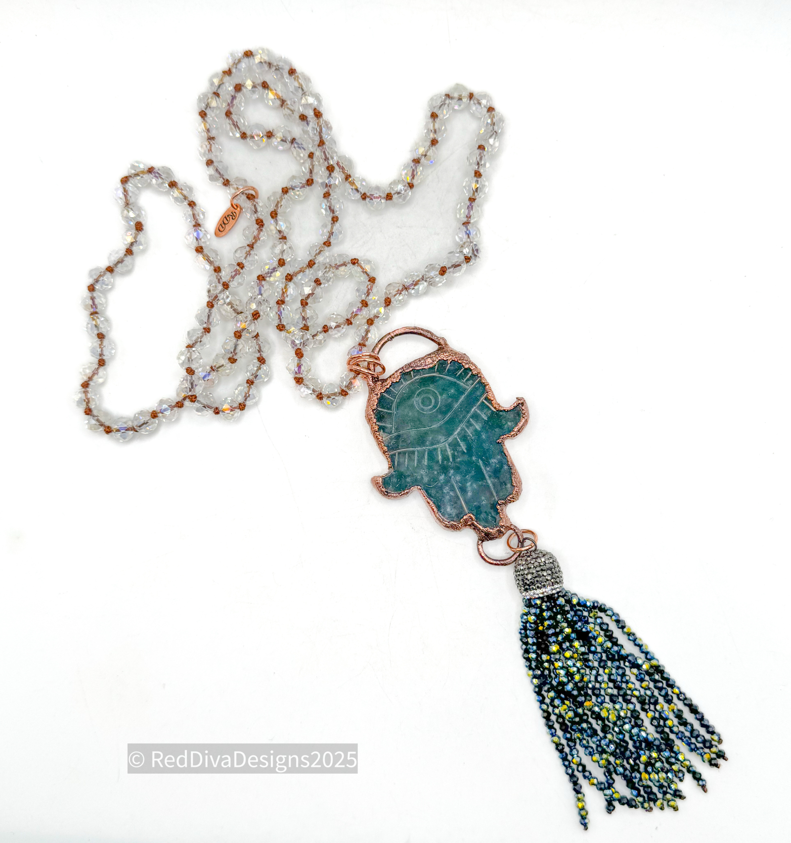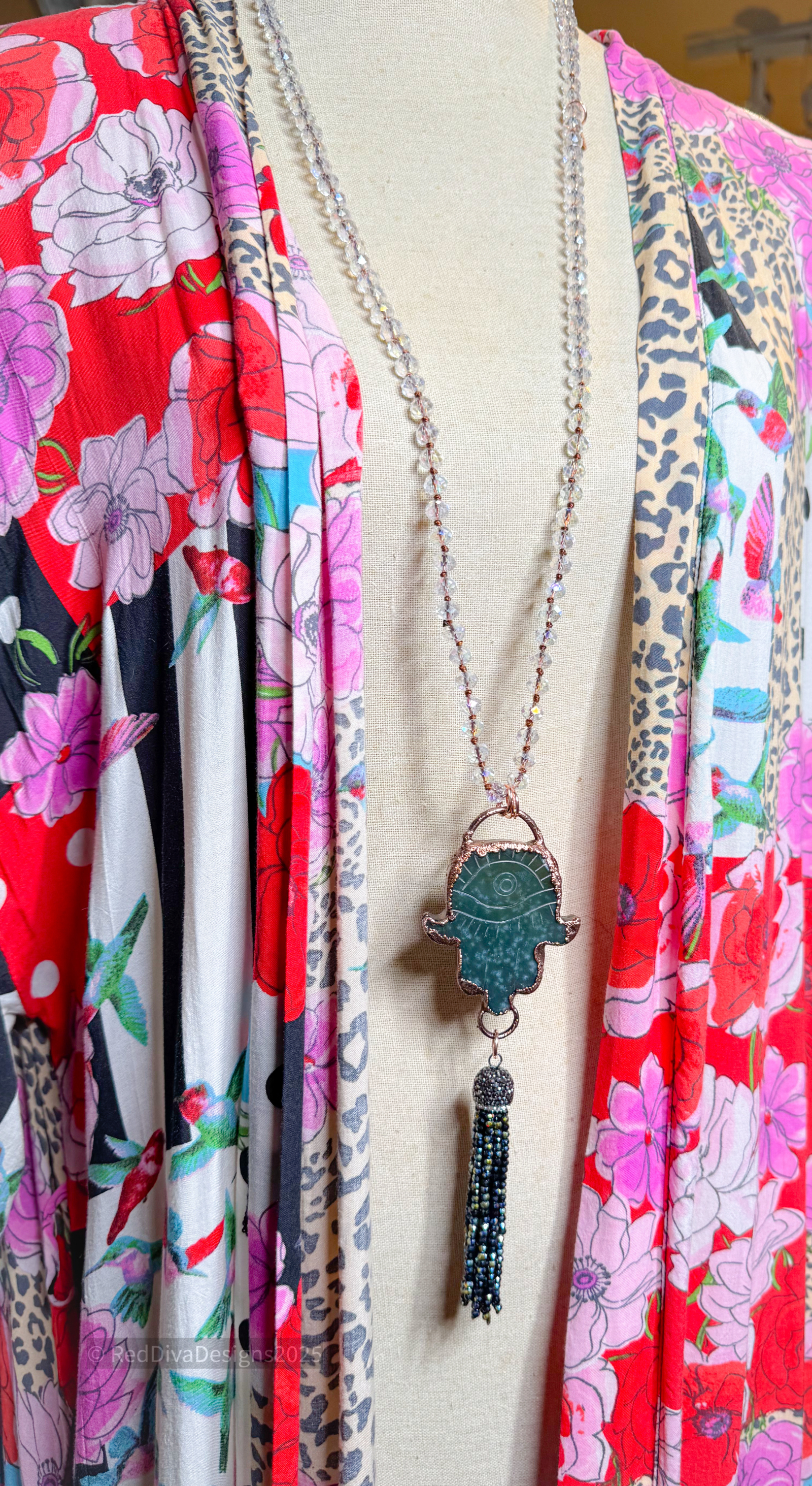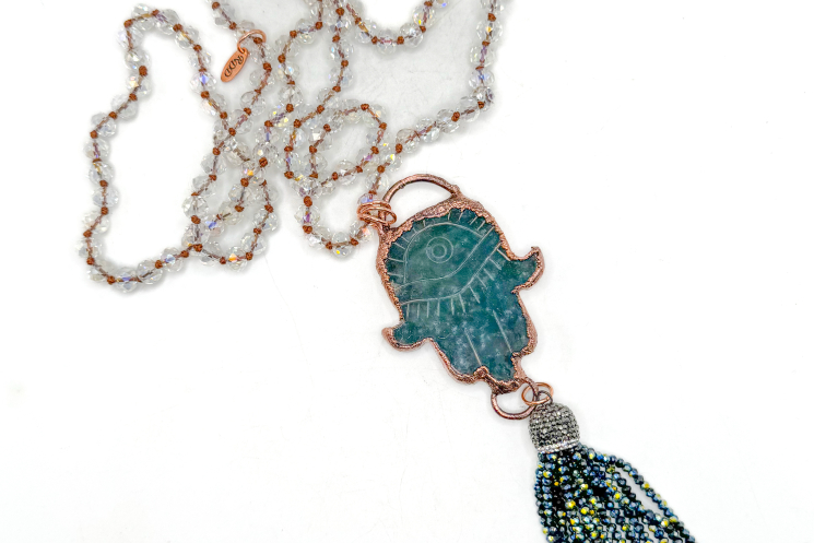 Ocean jasper hand carved hamsa hand copper electroformed and finished on a Aurora Borealis hand knotted crystal necklace 36" long and can be worn long or doubled with the included extender.