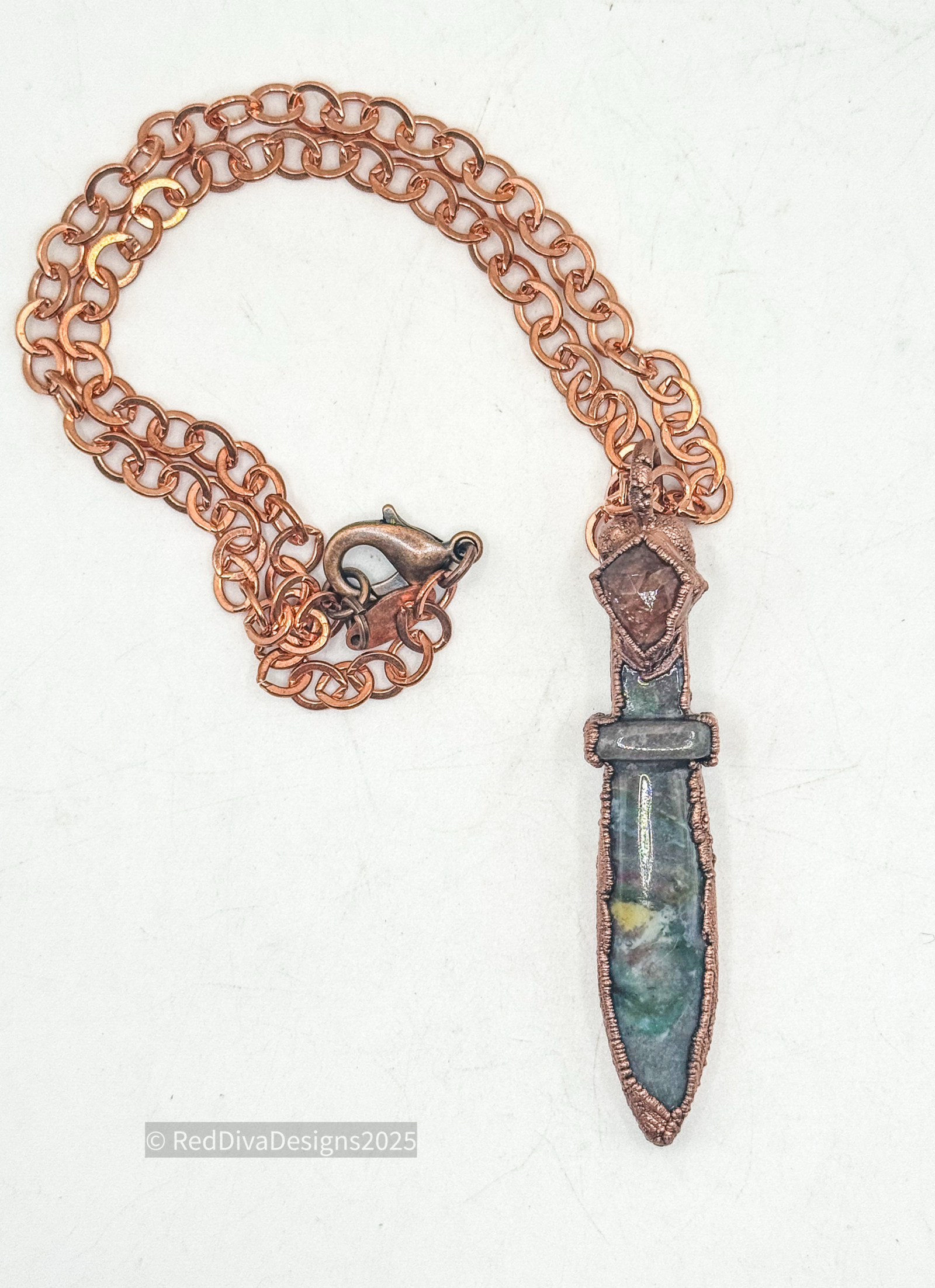 Ocean Jasper hand carved sword with a sunstone kite cabochon on top. Finished on a colic copper chain 18" long.