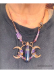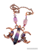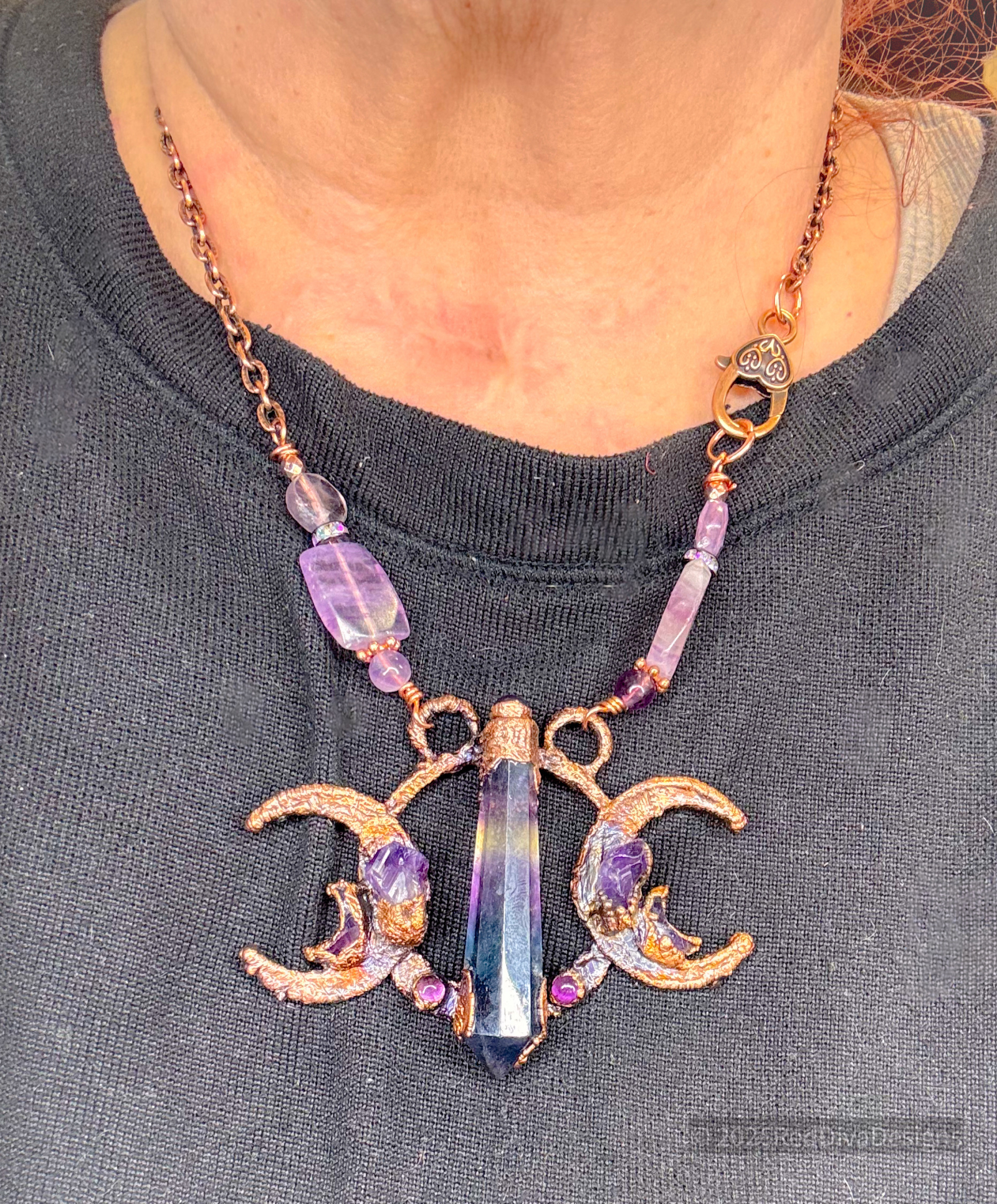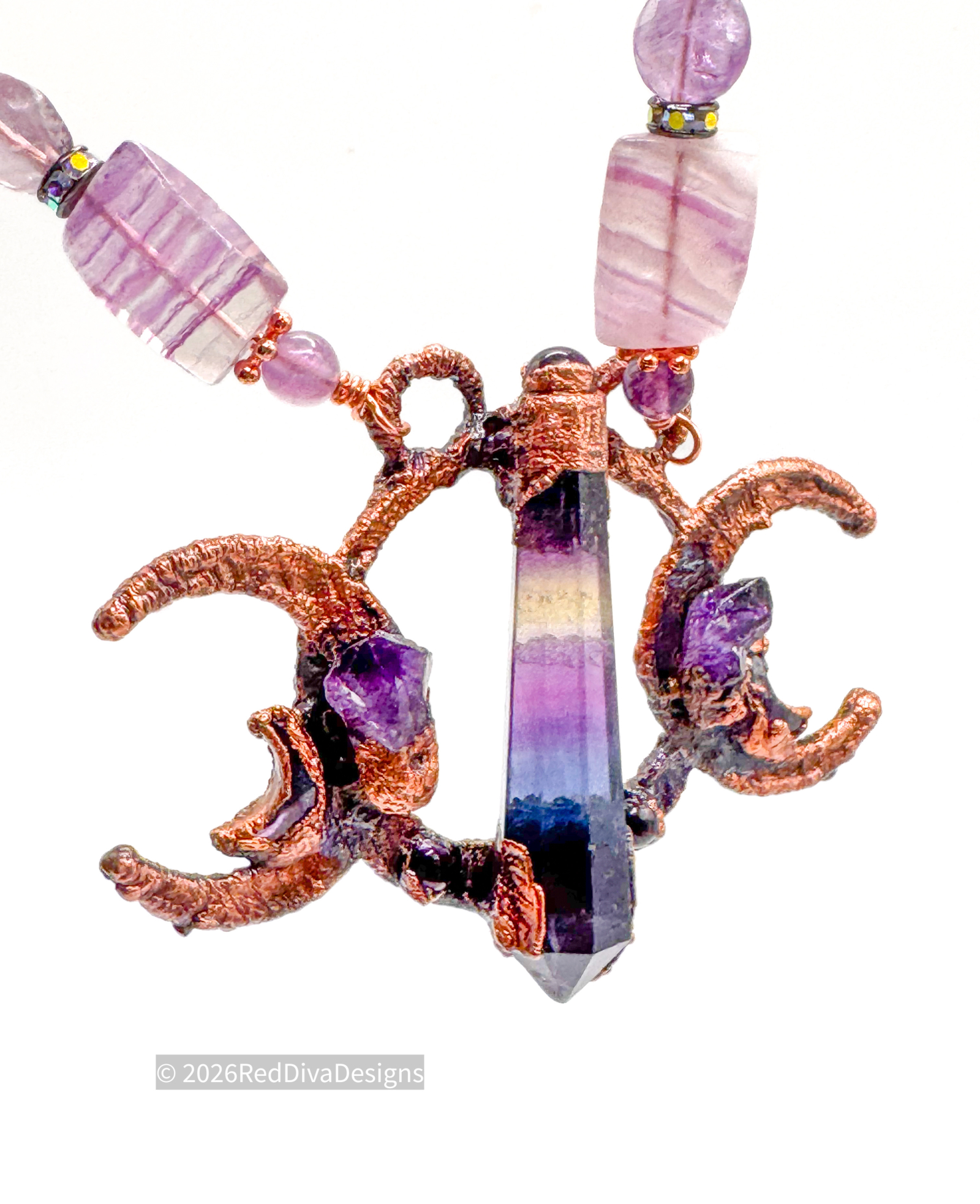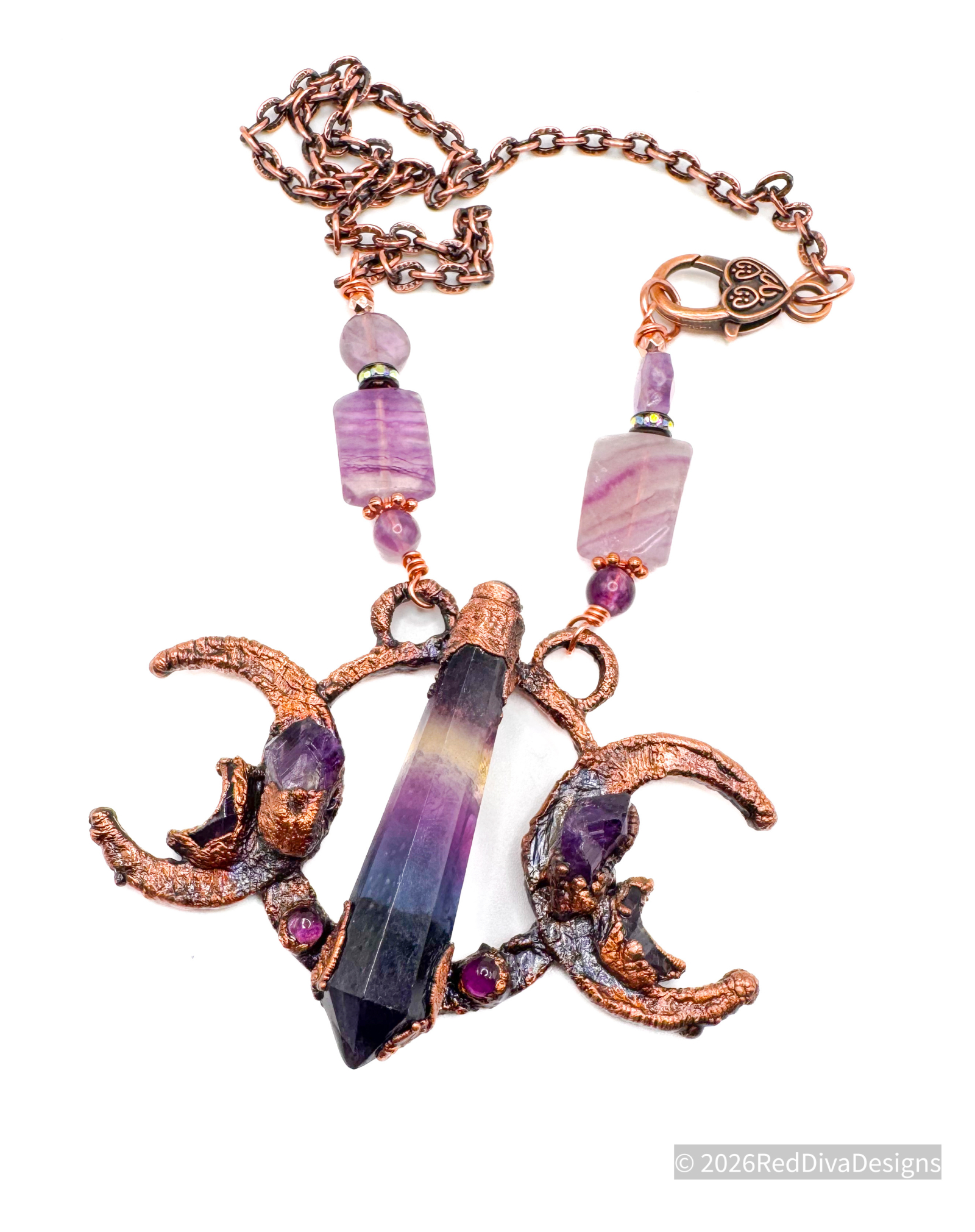 Rainbow Flourite Prism copper electroformed and paired in harmony with two Amethyst points on adjoining crescents. Finished on a 19" solid copper chain.