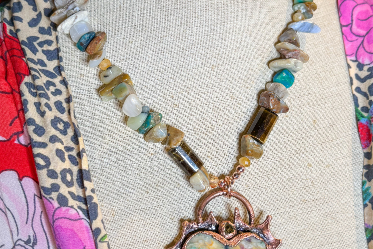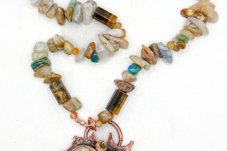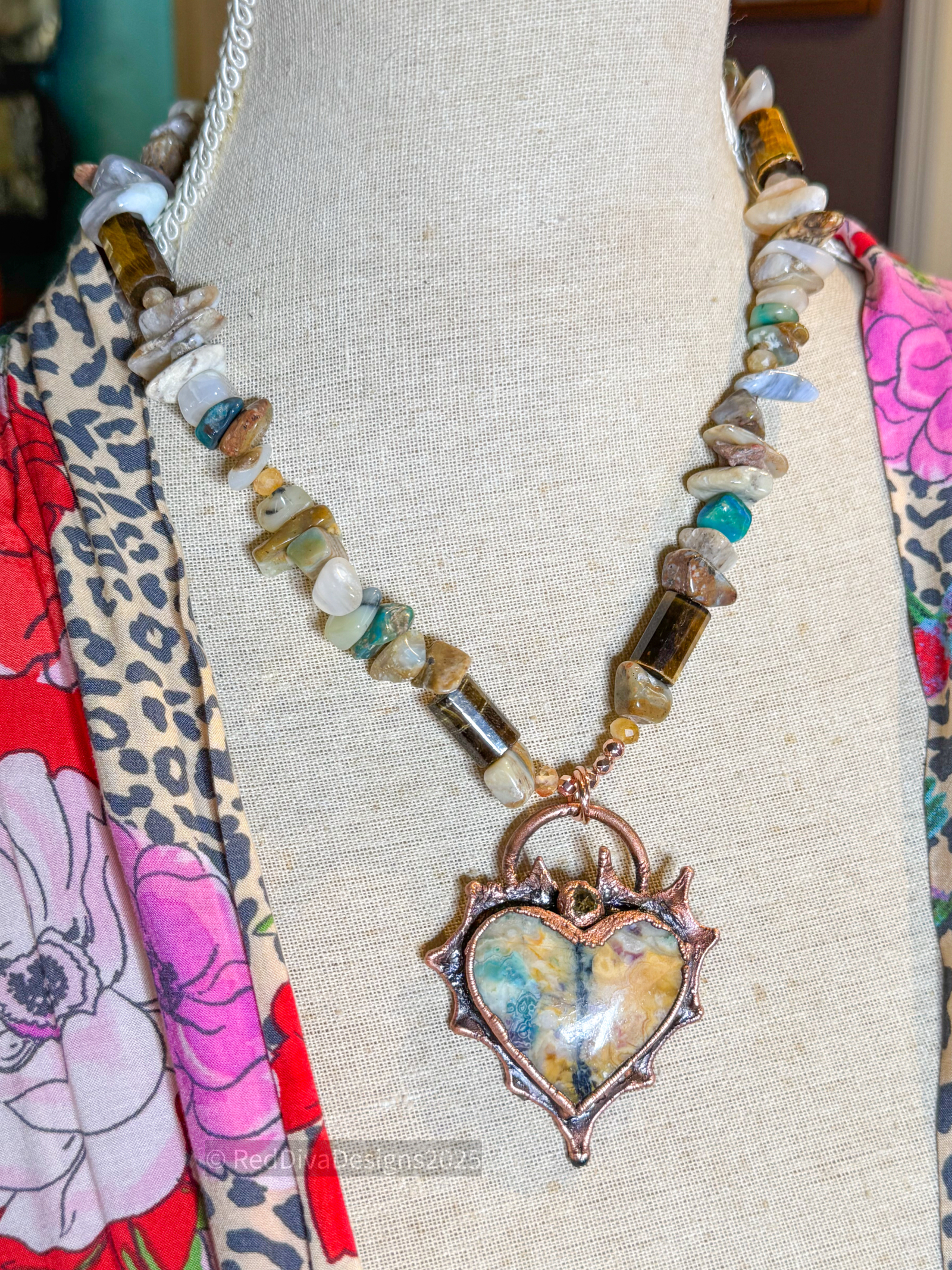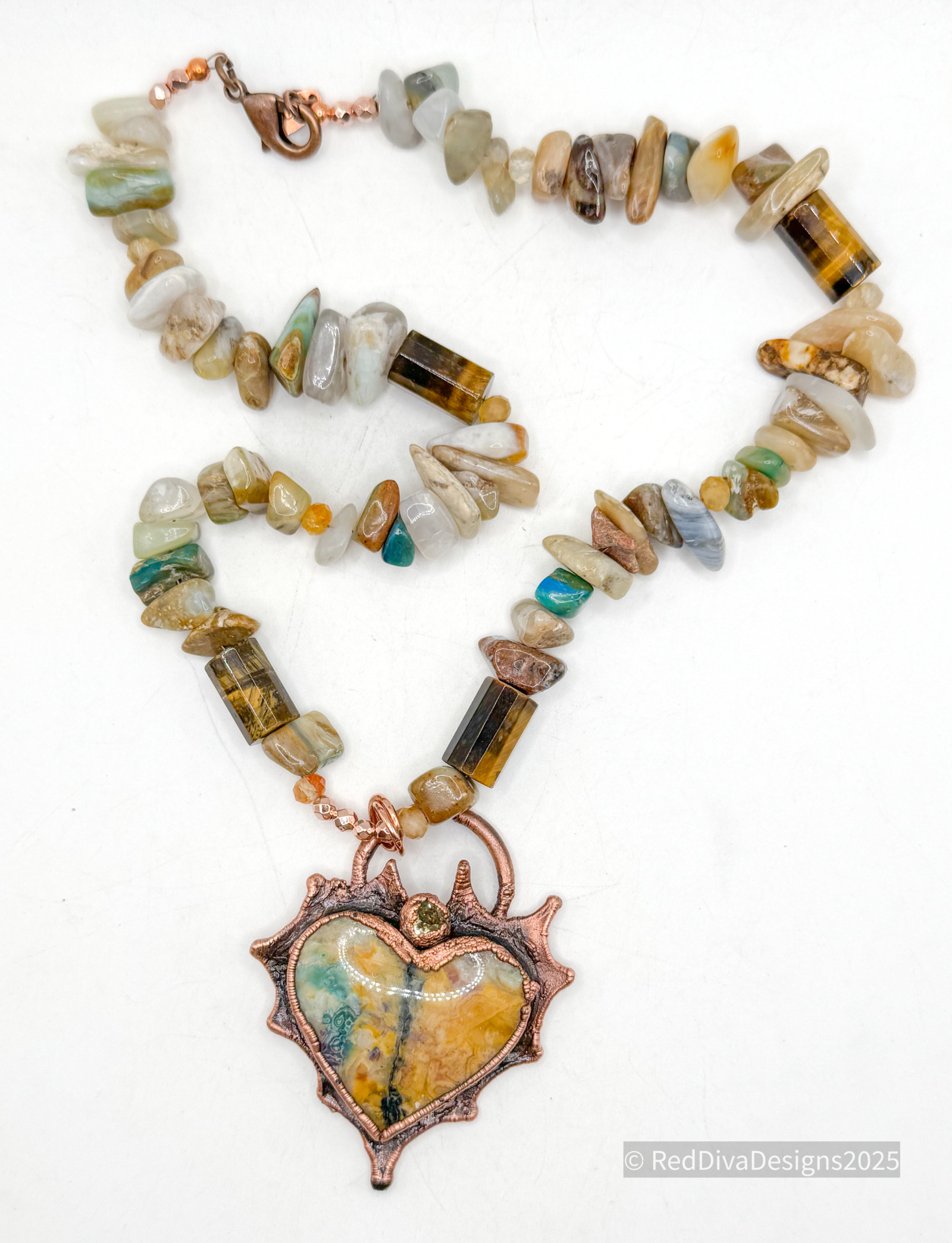 hand carved agate heart copper electroformed in Kaboom fashion! My unique design which is completely hand drawn for each individual heart. Finished on Peruvian opal and tiger eye beads 19" long.