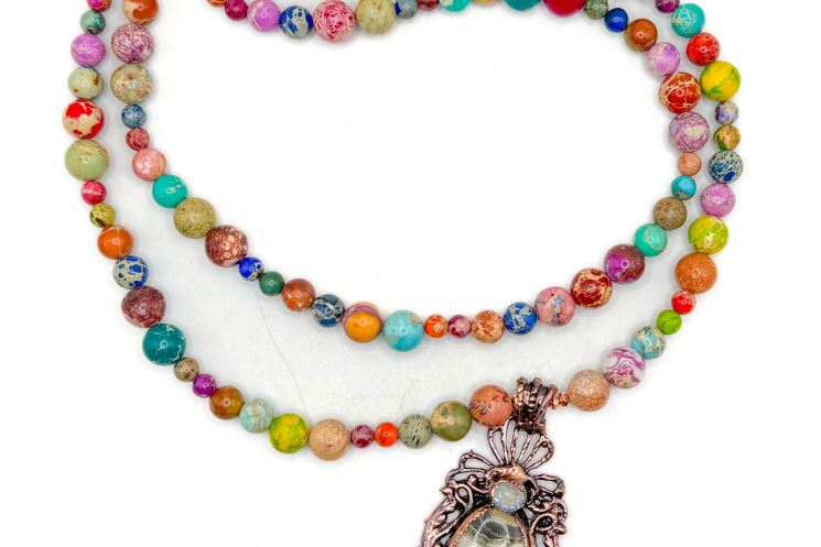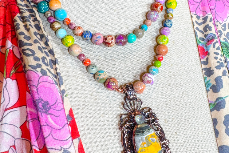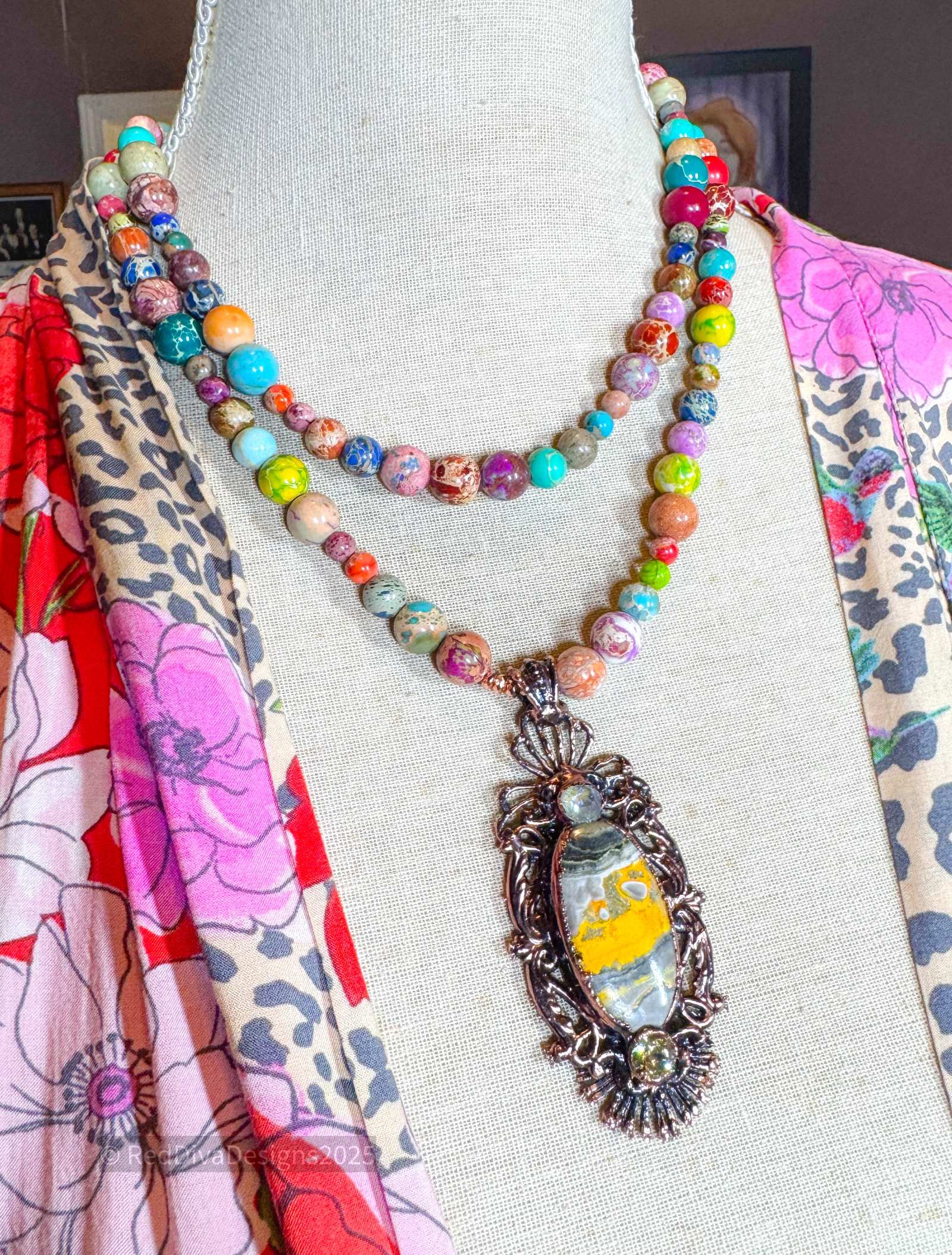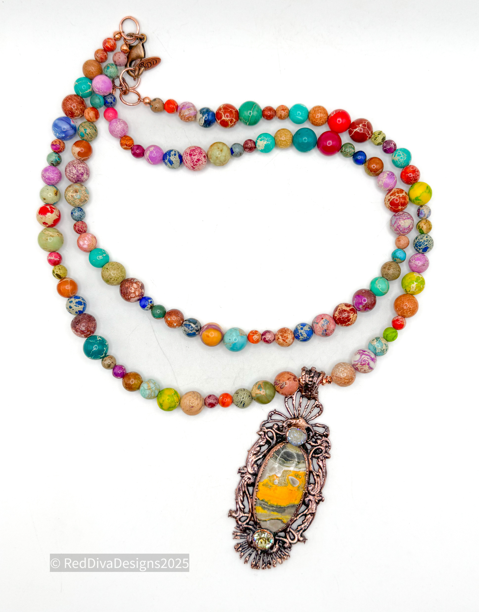 Bumblebee jasper and colorful sea sediment jasper meet! Such glorious fun colors! Add this to your wardrobe and you'll never have to worry about being colorful!
