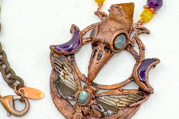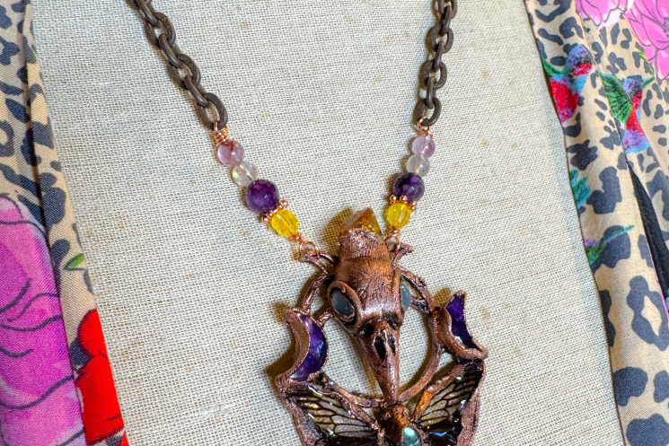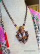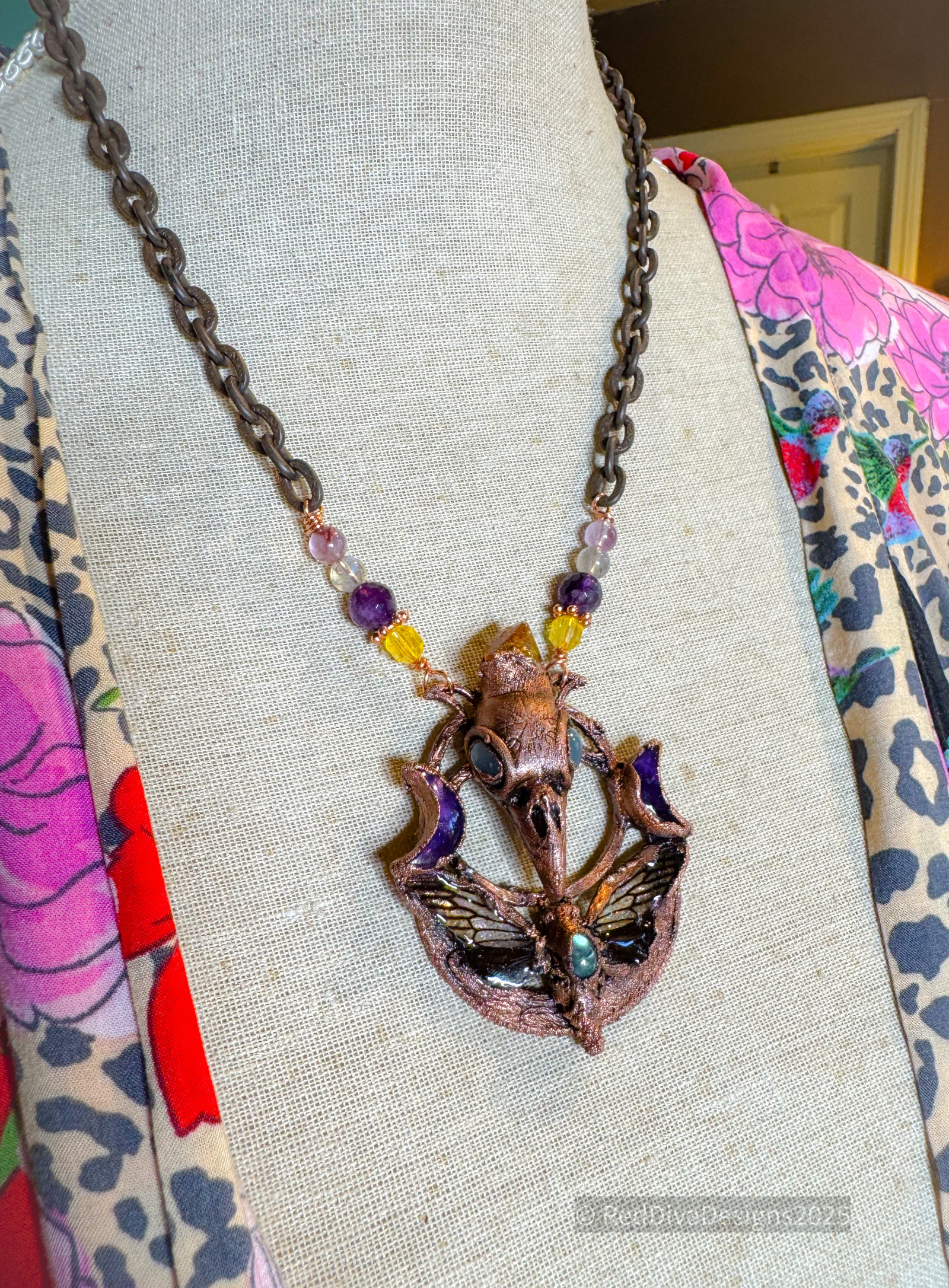 This Piece features a "Red Devil" Cicada real organic bug! I copper electroformed him and preserved him in time forever! Features Amazonite and Labradorite gemstones with some amaethyst to boot. Finished on a heavy duty rustic brown metal chunky chain, 19" long. Can be adjusted upon request...