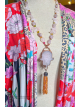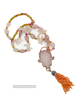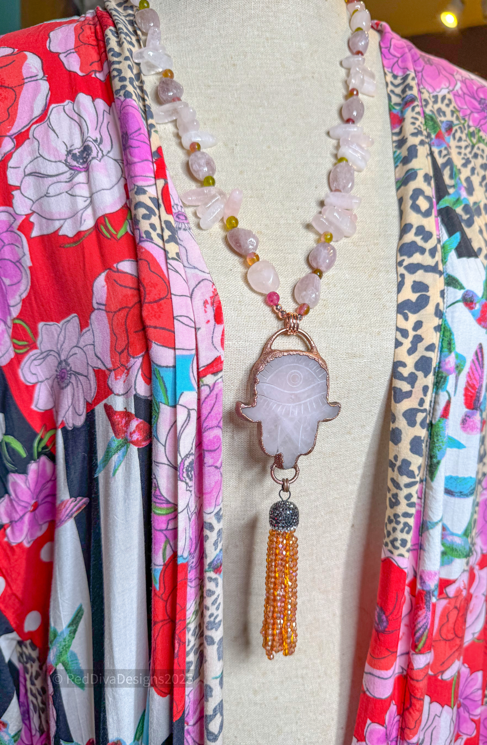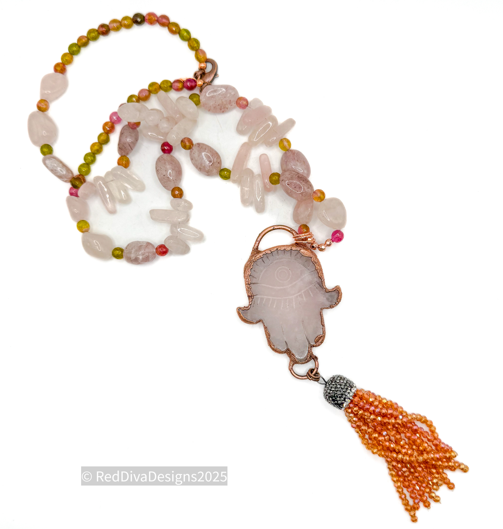 Rose Quartz Hamsa handcarved pendent copper electroformed and finished on a 30" long necklace filled with Malaysian jade, cherry quartz and rose quartz.