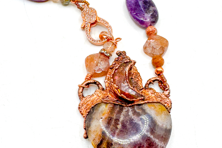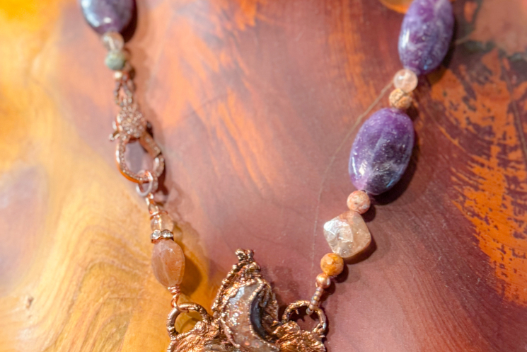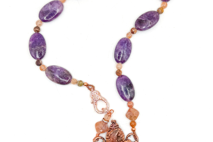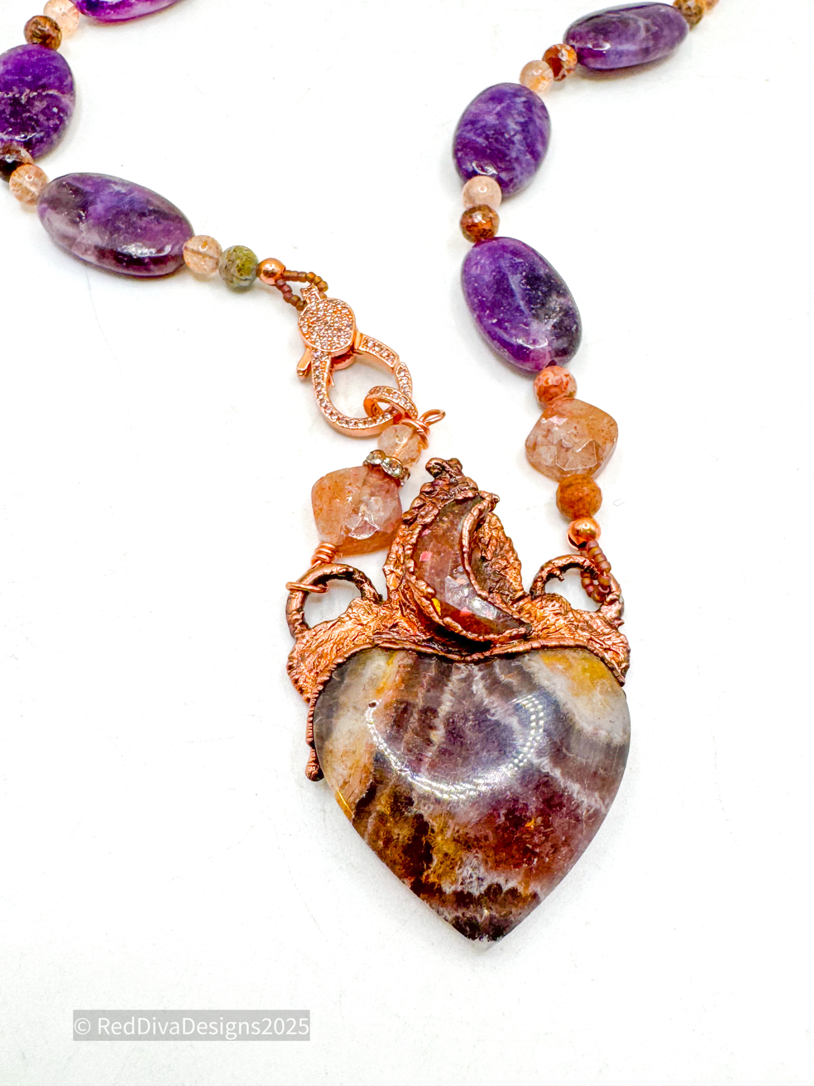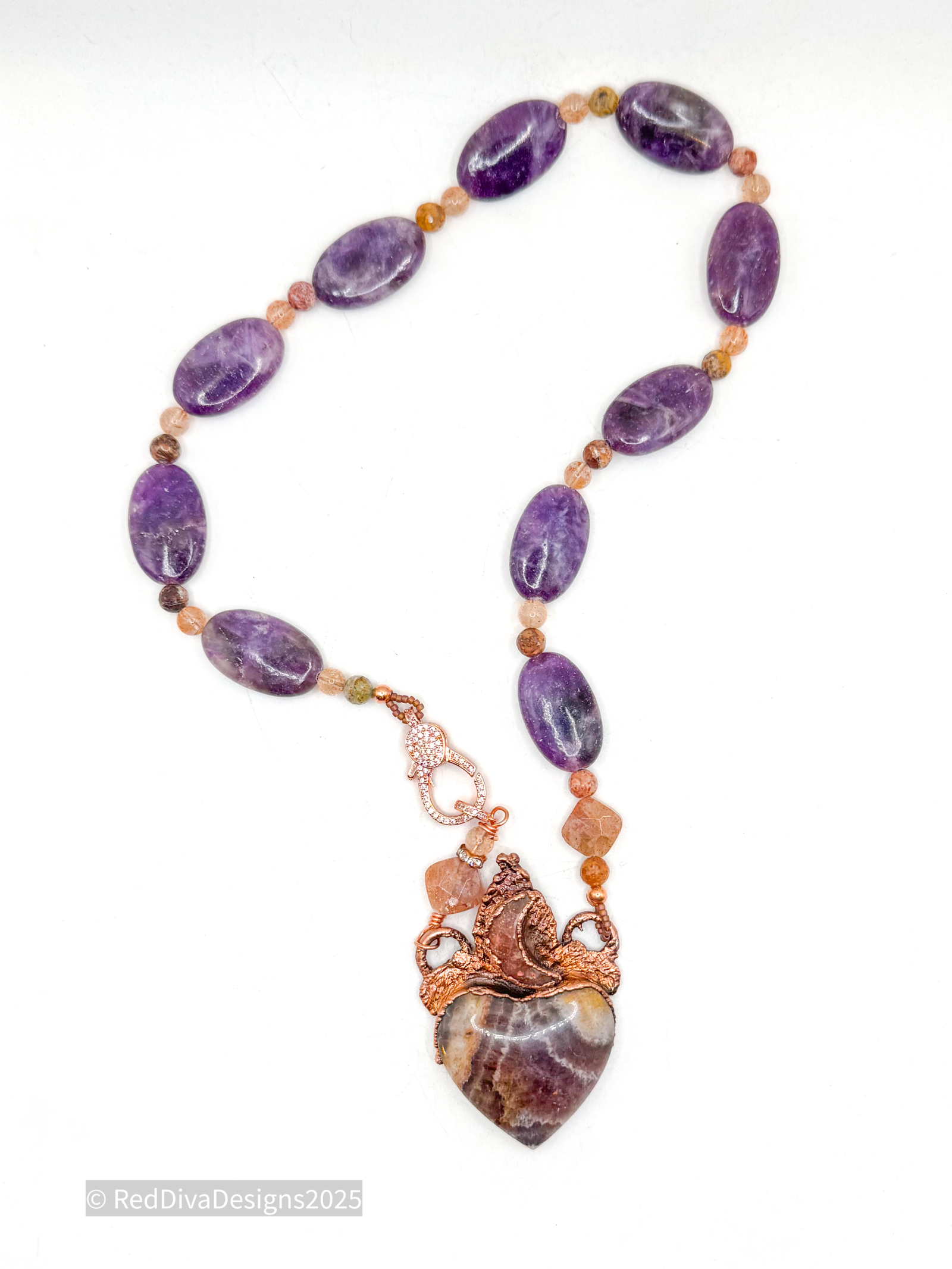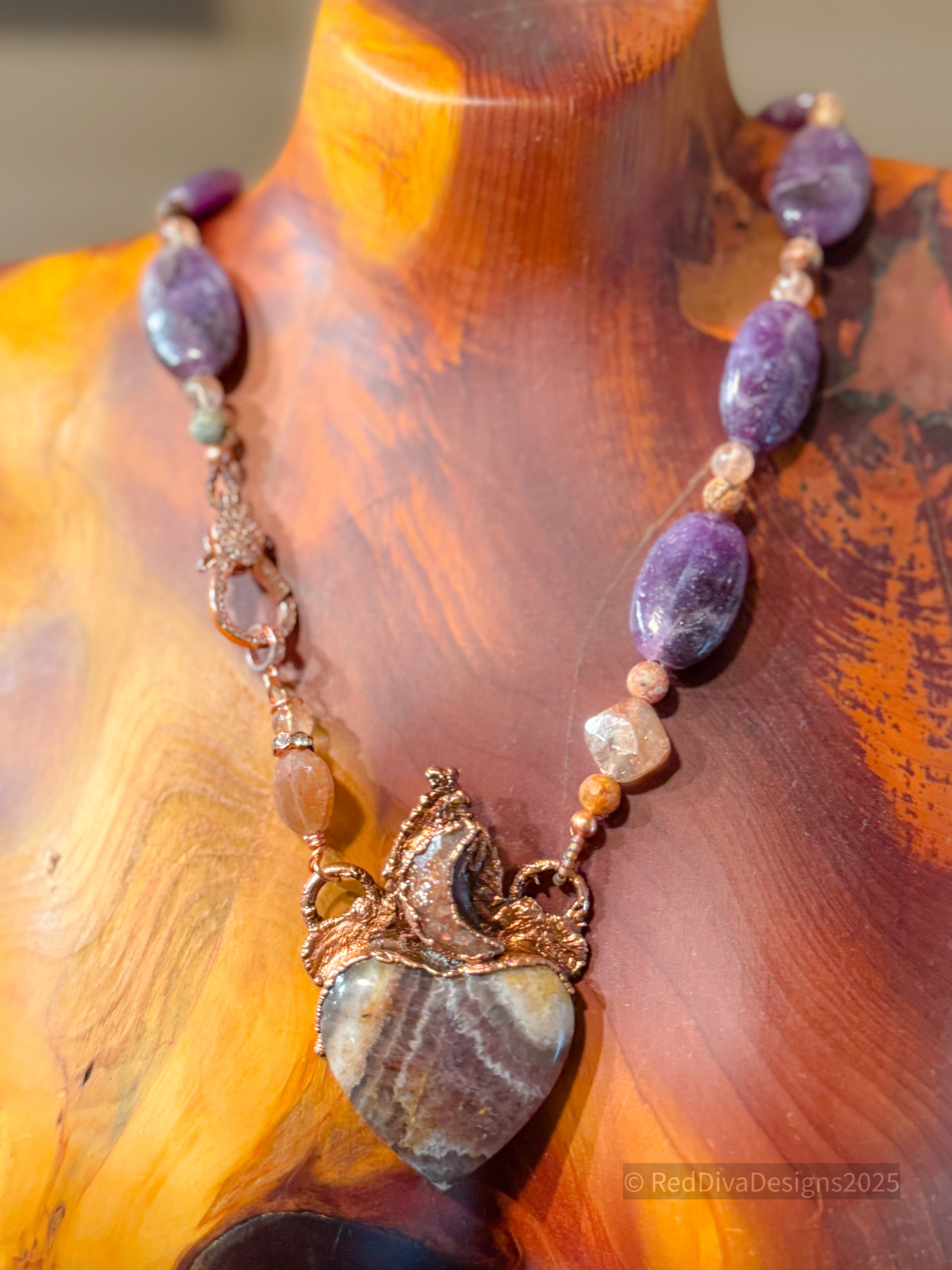 Amethyst Chevron Heart copper electroformed. With a beautiful Sunstone Crescent above. Finished on Lepidolite and sunstone and Pave' closure 19" long.