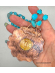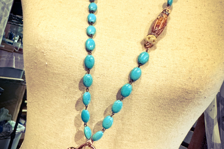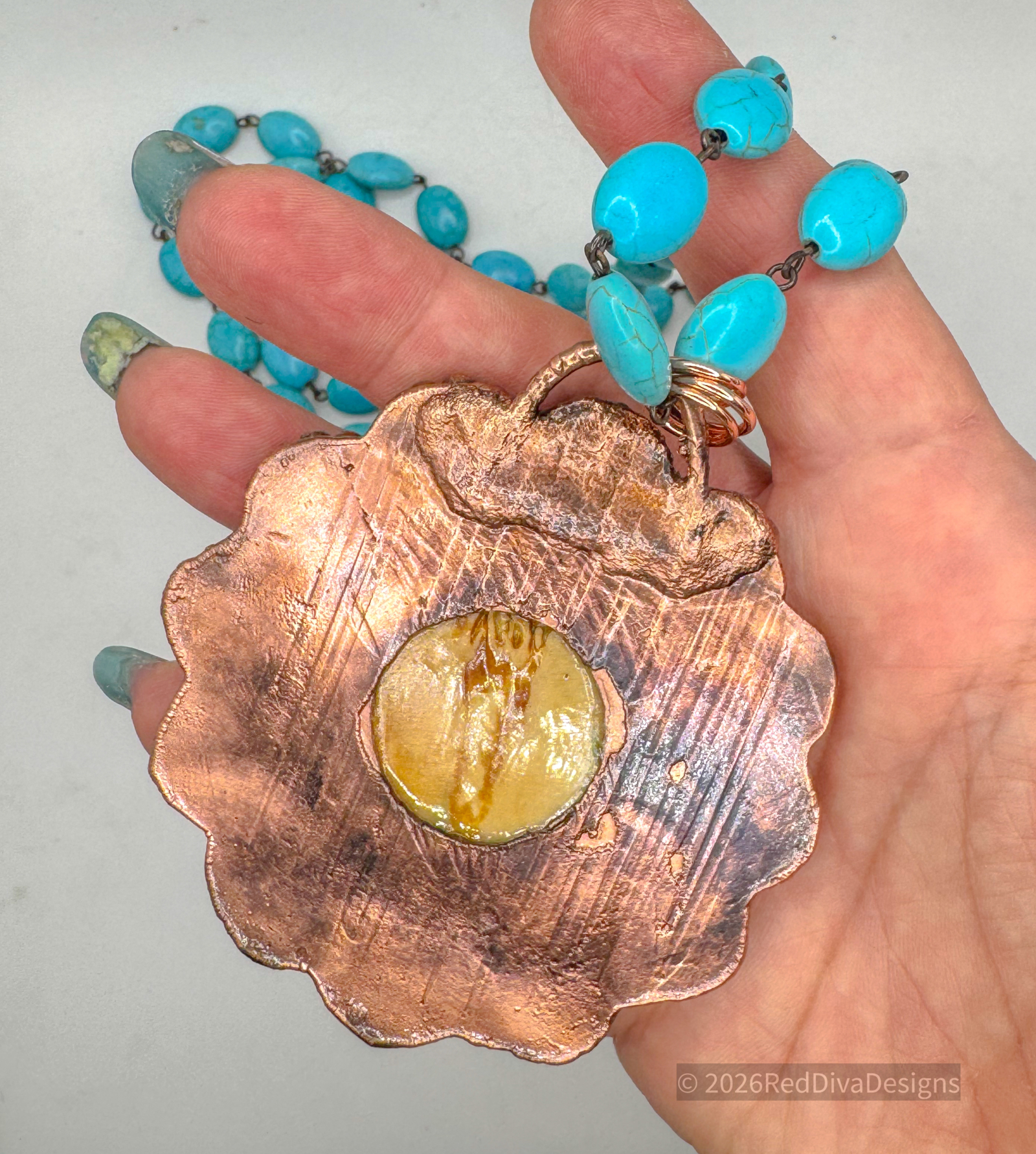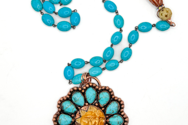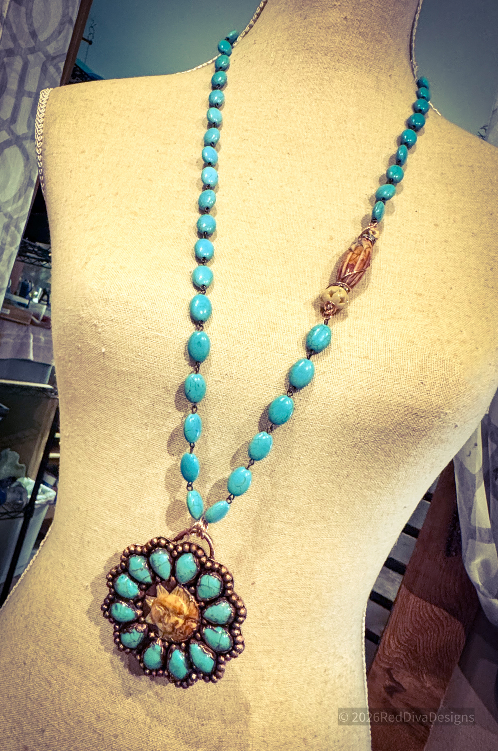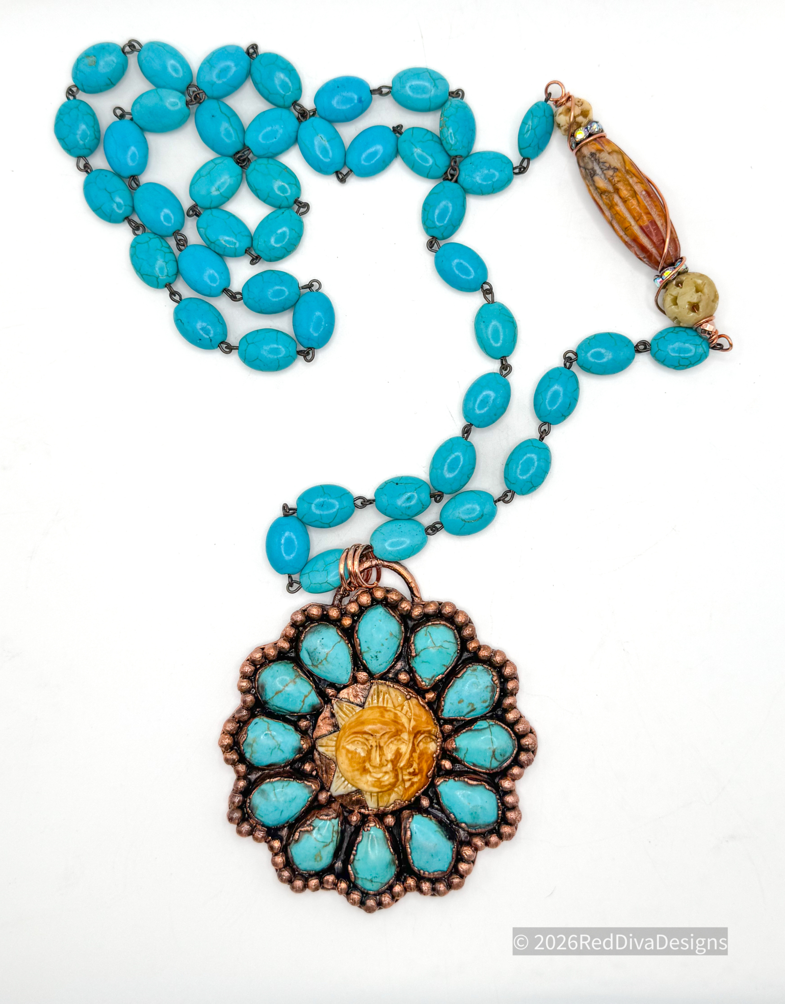 Turqouise Howlite and carved Bone copper electroformed and finished on a 36" Turqouise Howlite Necklace with a beautiful offset focal Red Creek Jasper bead. Sturdy and robust!