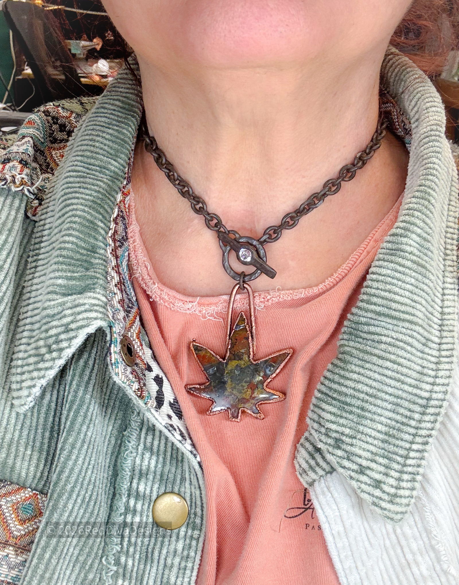 Breaciated Jasper carved Happy Leaf copper electroformed and finished on a heavy duty rustic finished and sealed chain with toggle 18" long.