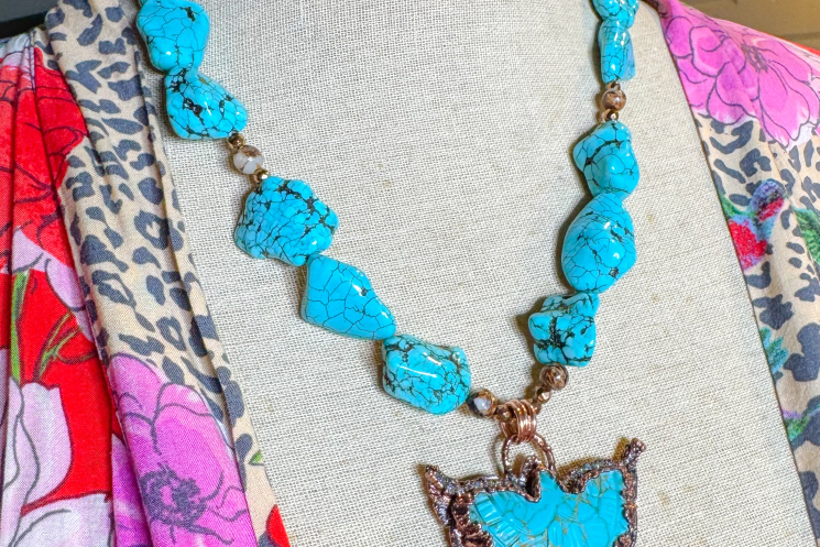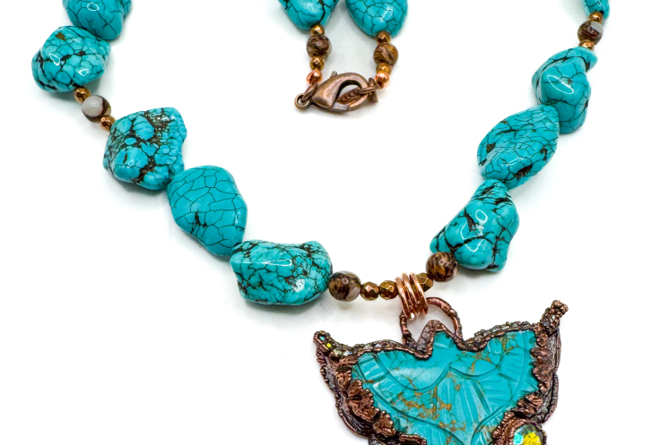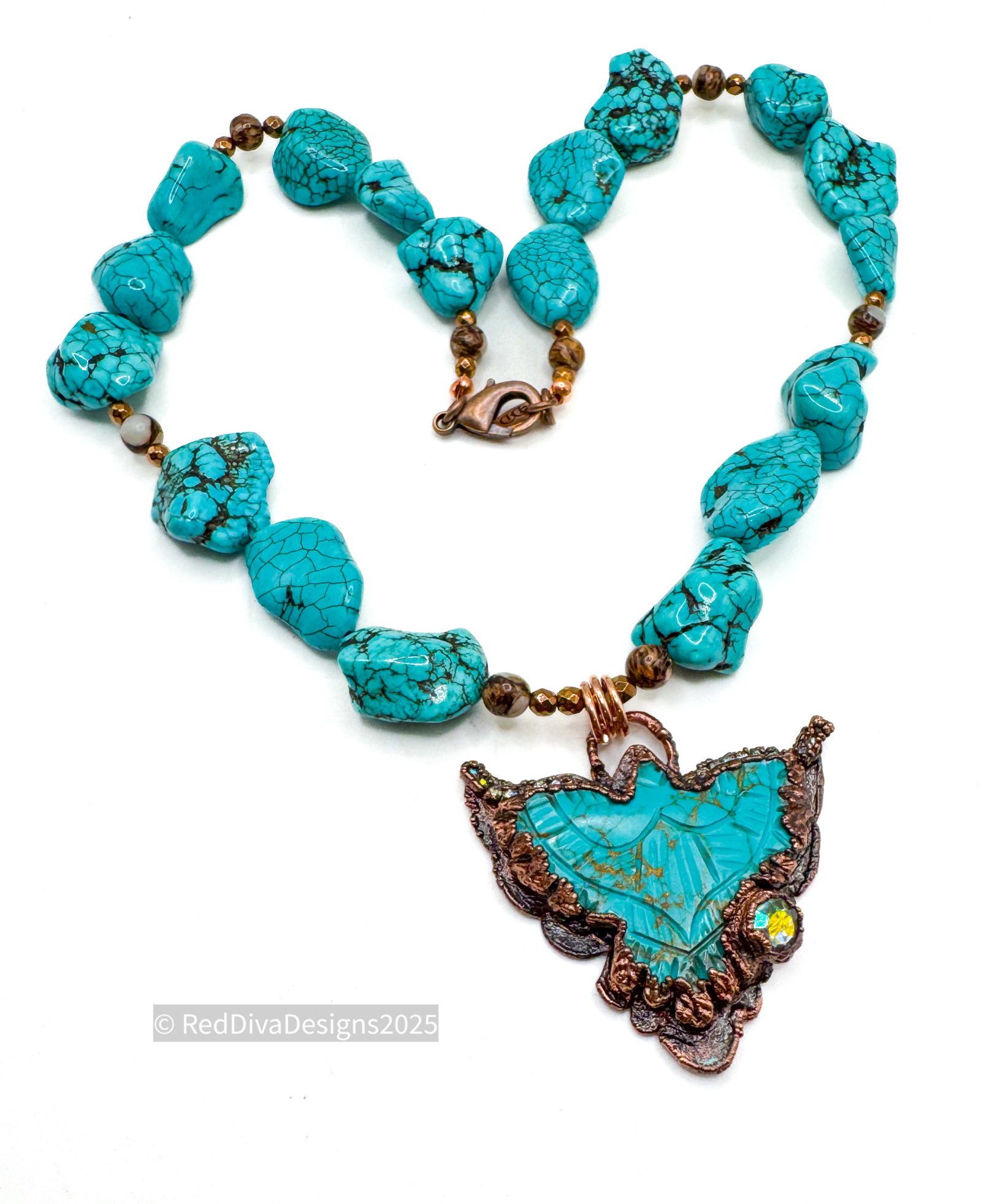 Copper electroformed Eagle finished on an 19" long turqouise nugget and bronzite necklace